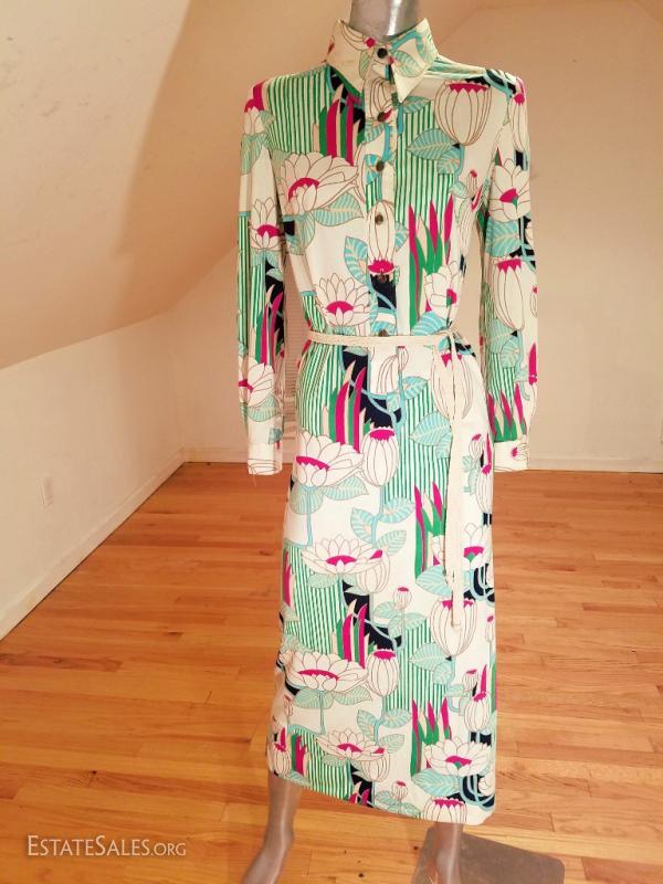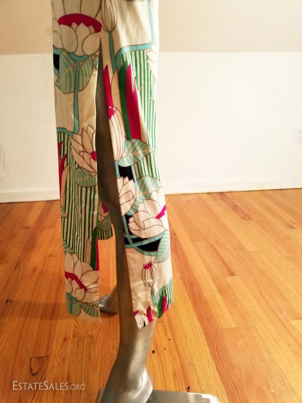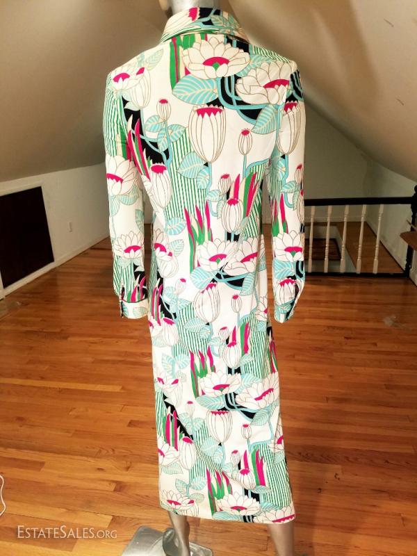 An original and rare beauty by famous Wilroy Traveller New York Circa 1960's hand painted lotus flowers with gold paints Acetate Poly fluid knit. In very good vintage condition .Vtg size 14