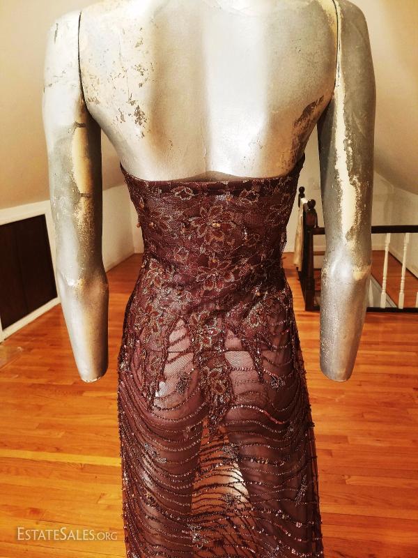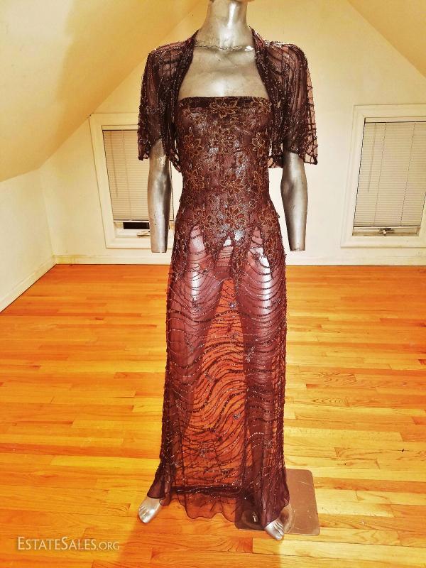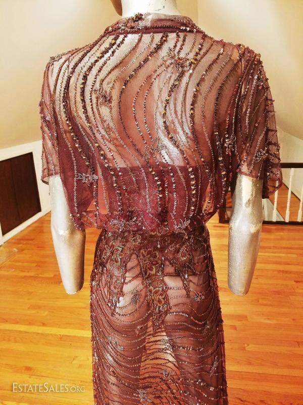 An original beauty of an ensemble Bias maxi layering dress with open bolero fully hand beaded on tulle dress and bolero with gold lame'bodice. It is exquisite. in very good vintage condition except for some pinholes on the bottom of the back train that are hardly noticeable.