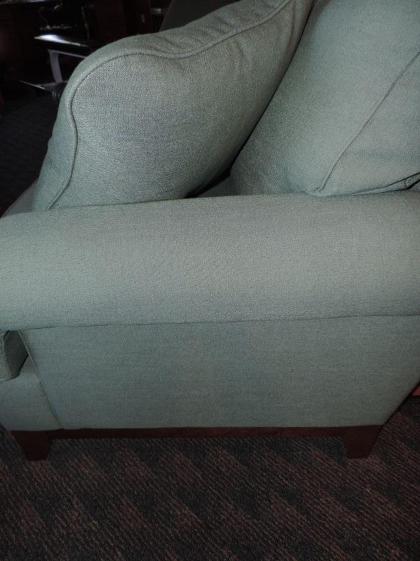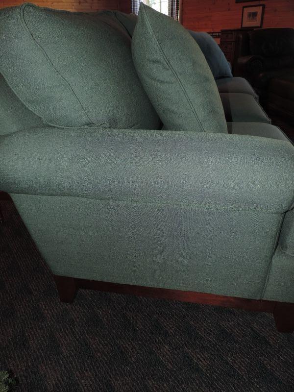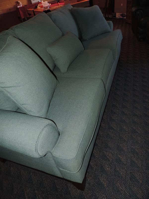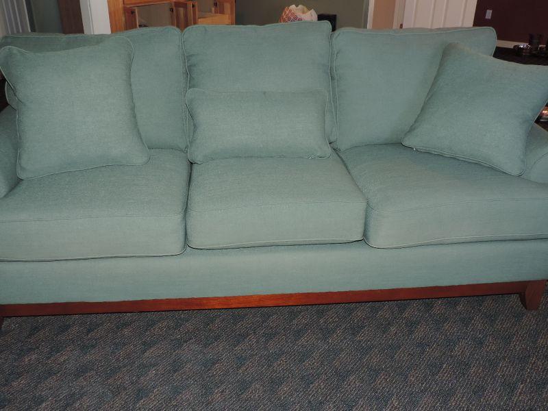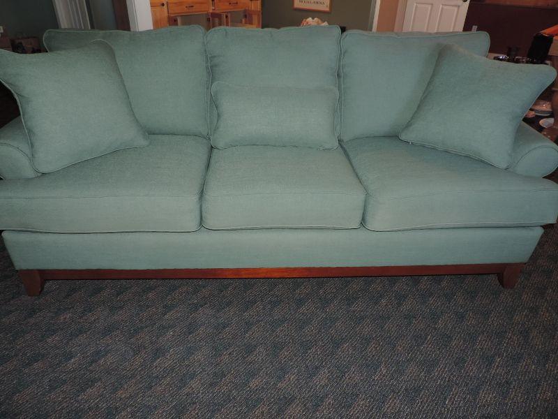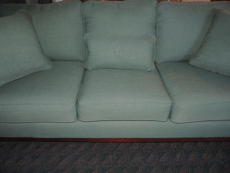 CLOTH UPHOLSTERY, LIGHT GREEN AND COMES WITH MATCHING THROW PILLOWS MEASURES 72X34 EXCELLENT CONDITION
