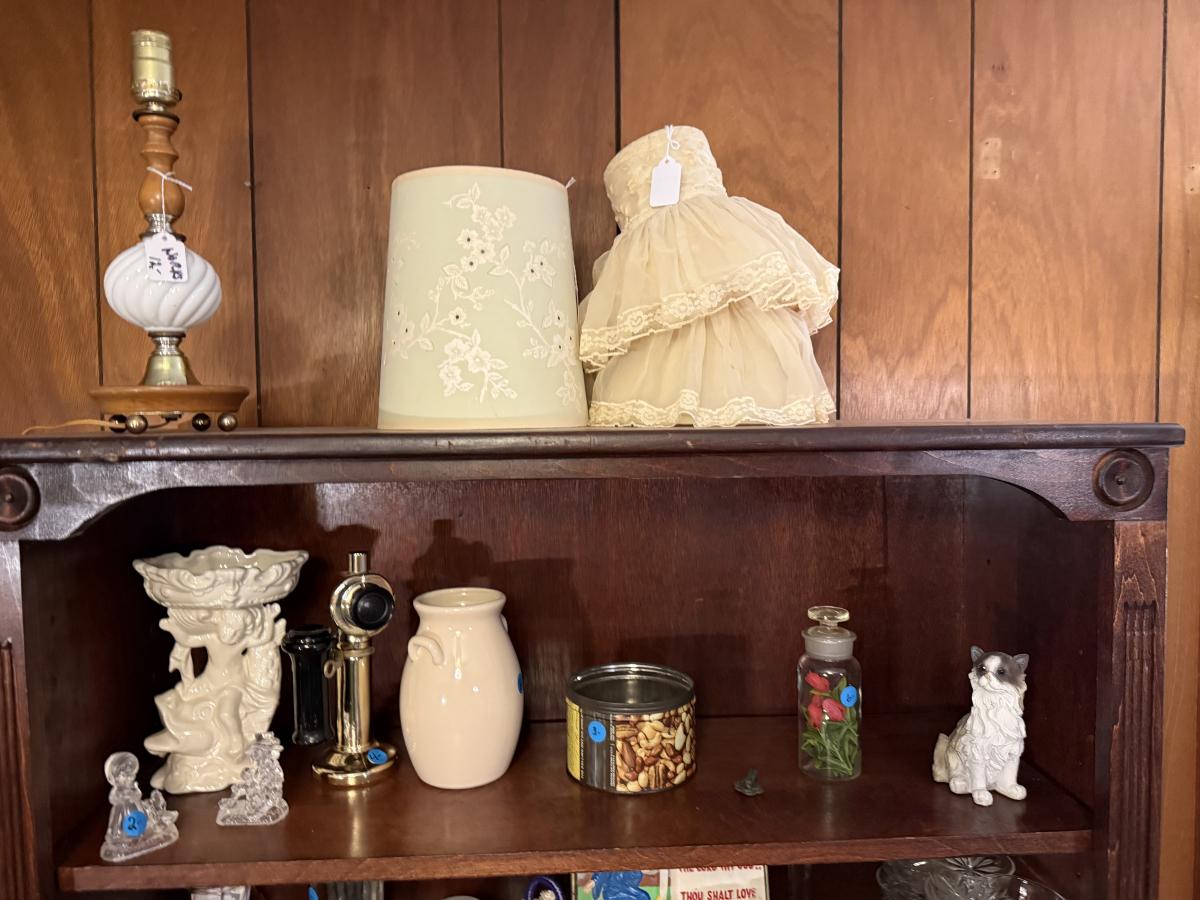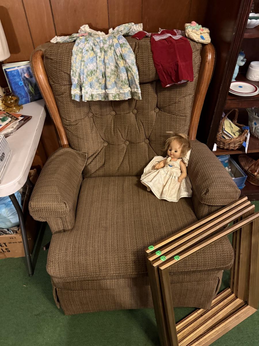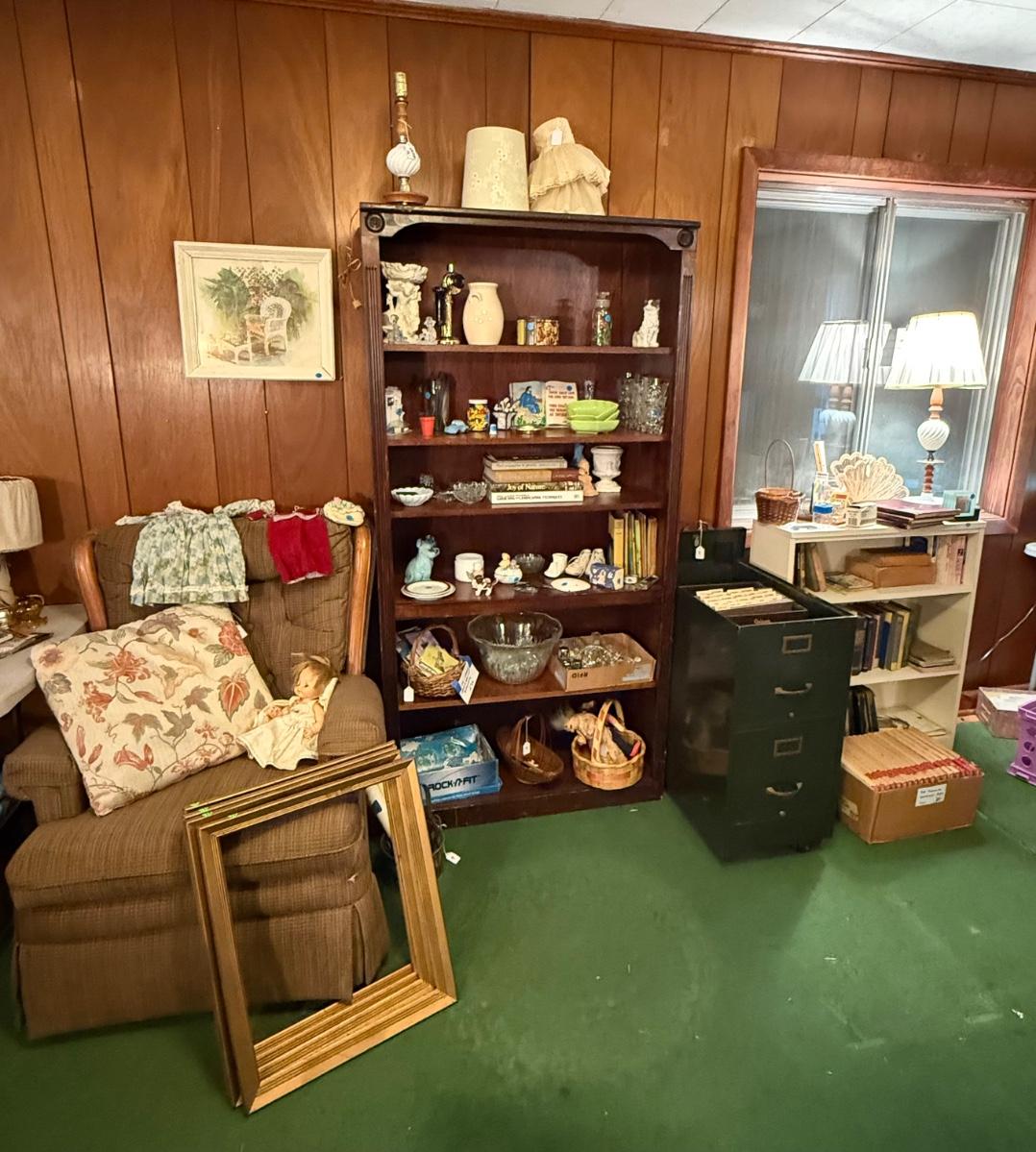 LaZBoy recliner, frames, doll & clothes, Knick knacks, lamps, file cabinet, books, Braddock High School yearbooks, framed art, & more
