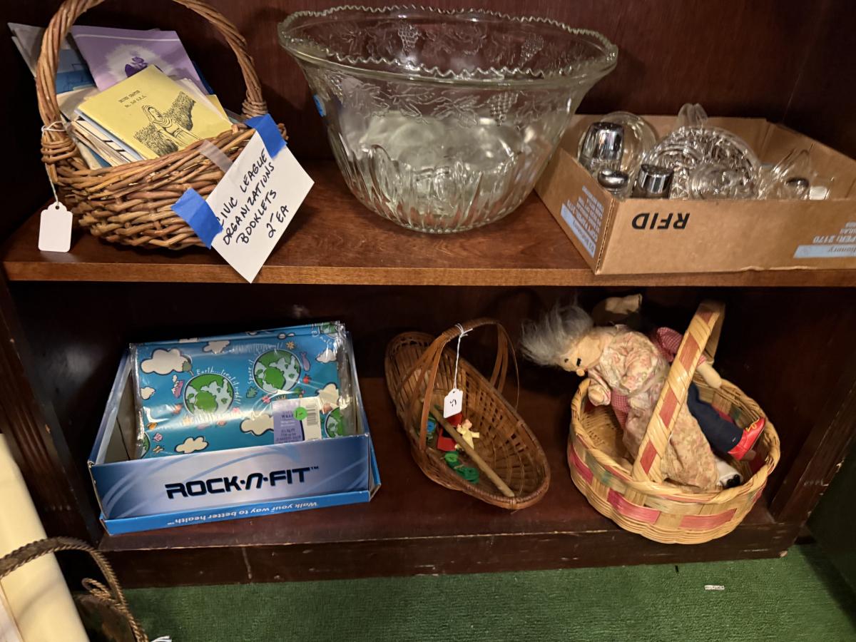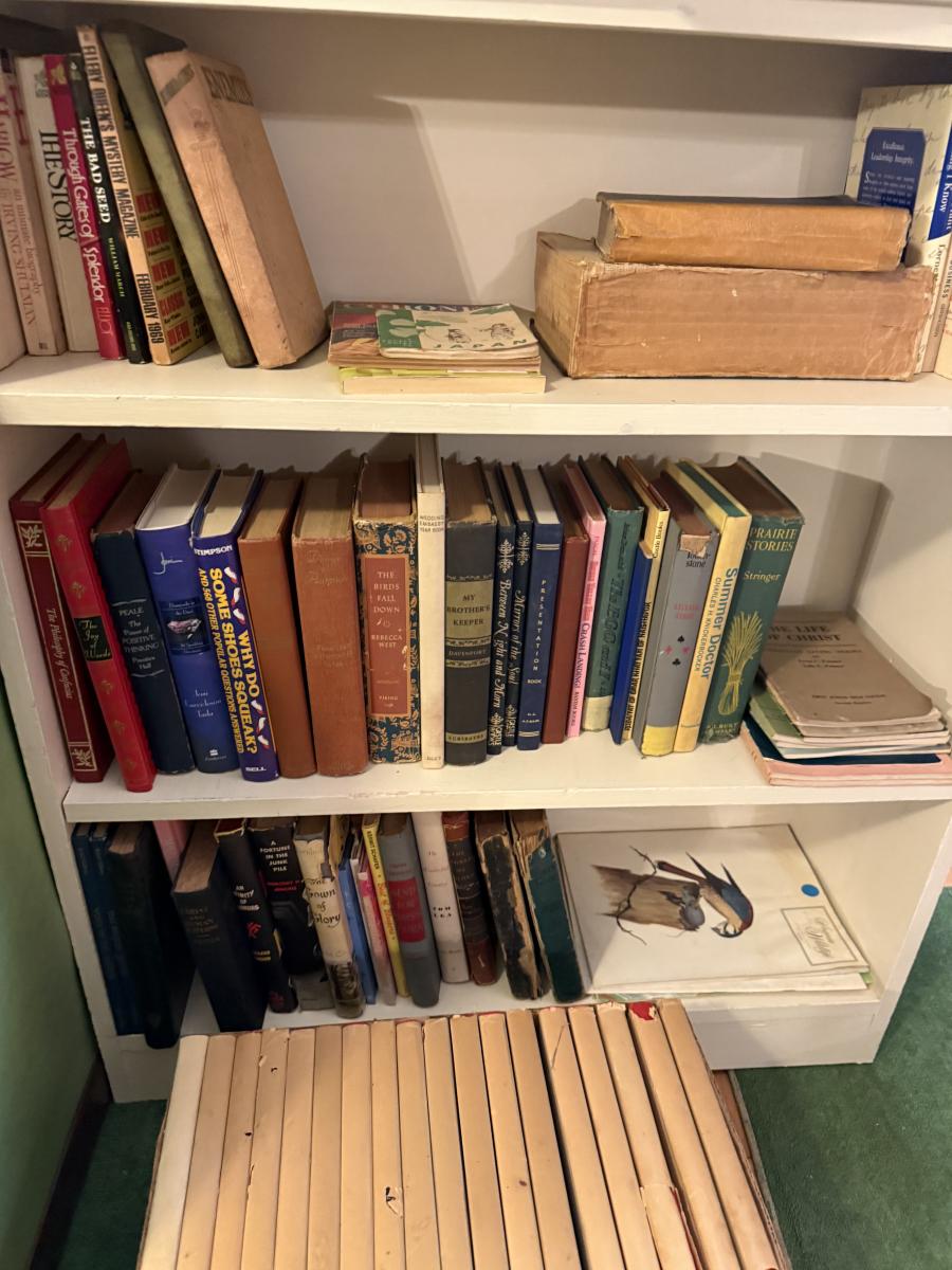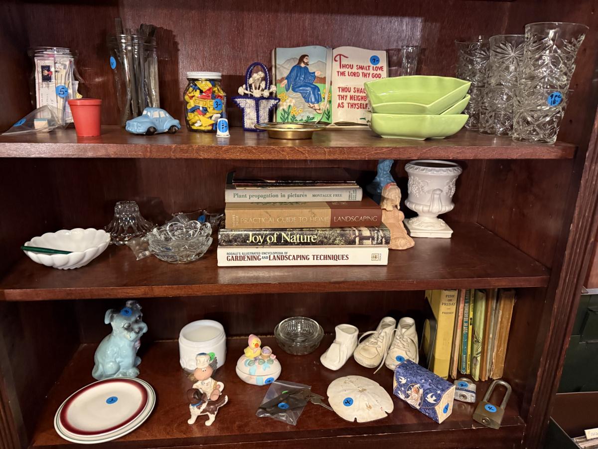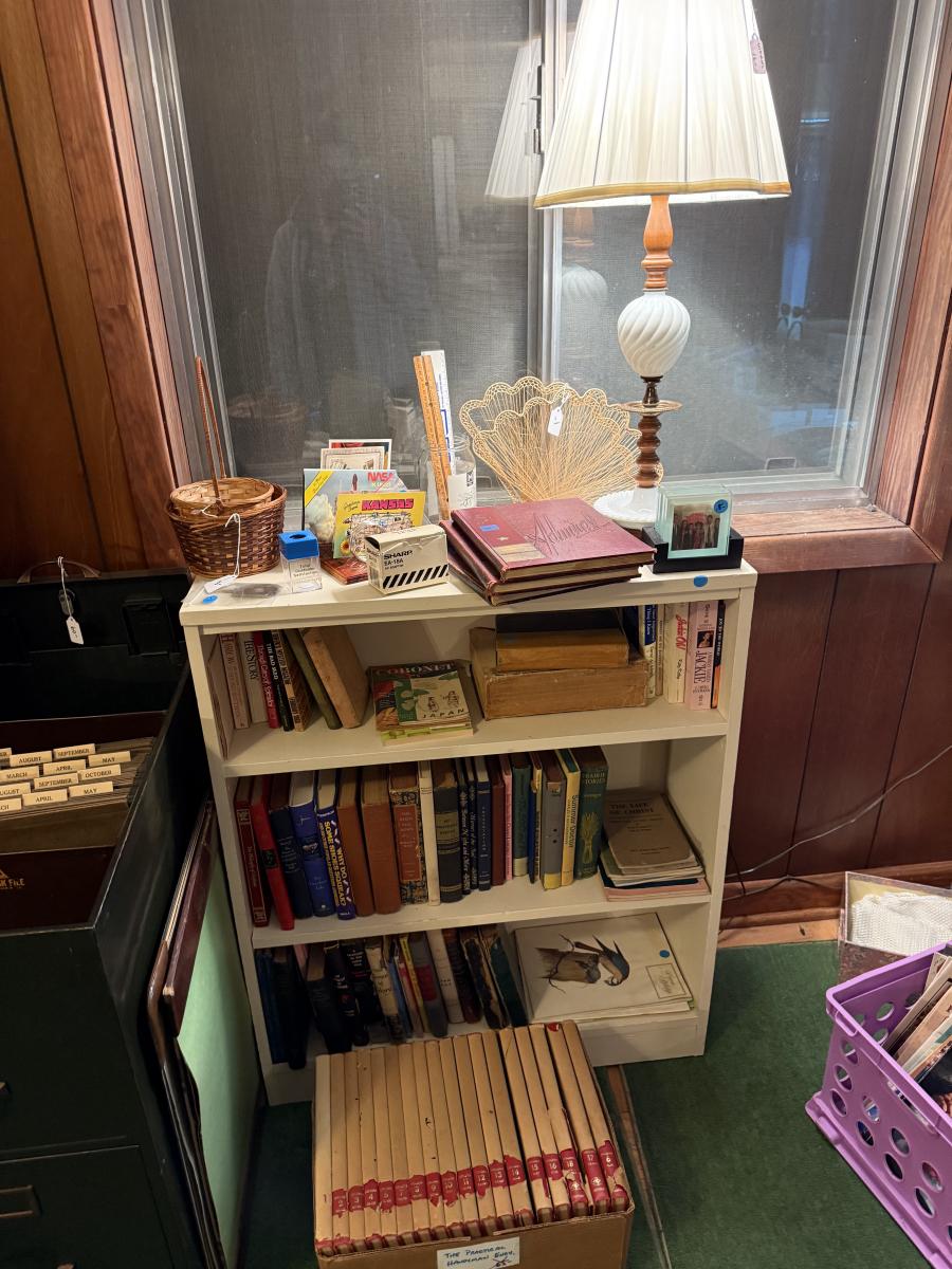 LaZBoy recliner, frames, doll & clothes, Knick knacks, lamps, file cabinet, books, Braddock High School yearbooks, framed art, & more