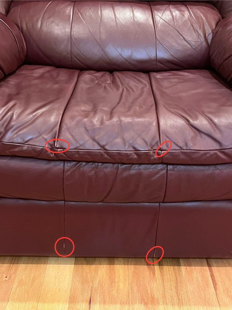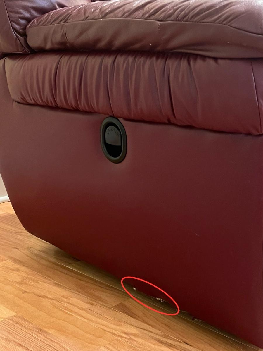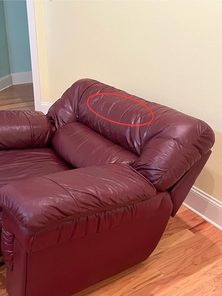 35” H x 54” W x 34” D ~ Fully reclined 60” D ~ Leather is worn on headrest, there’s a few spots on the footrest that have rubbed off and there’s a spot under the pull handle that has been ripped all as seen in photos
