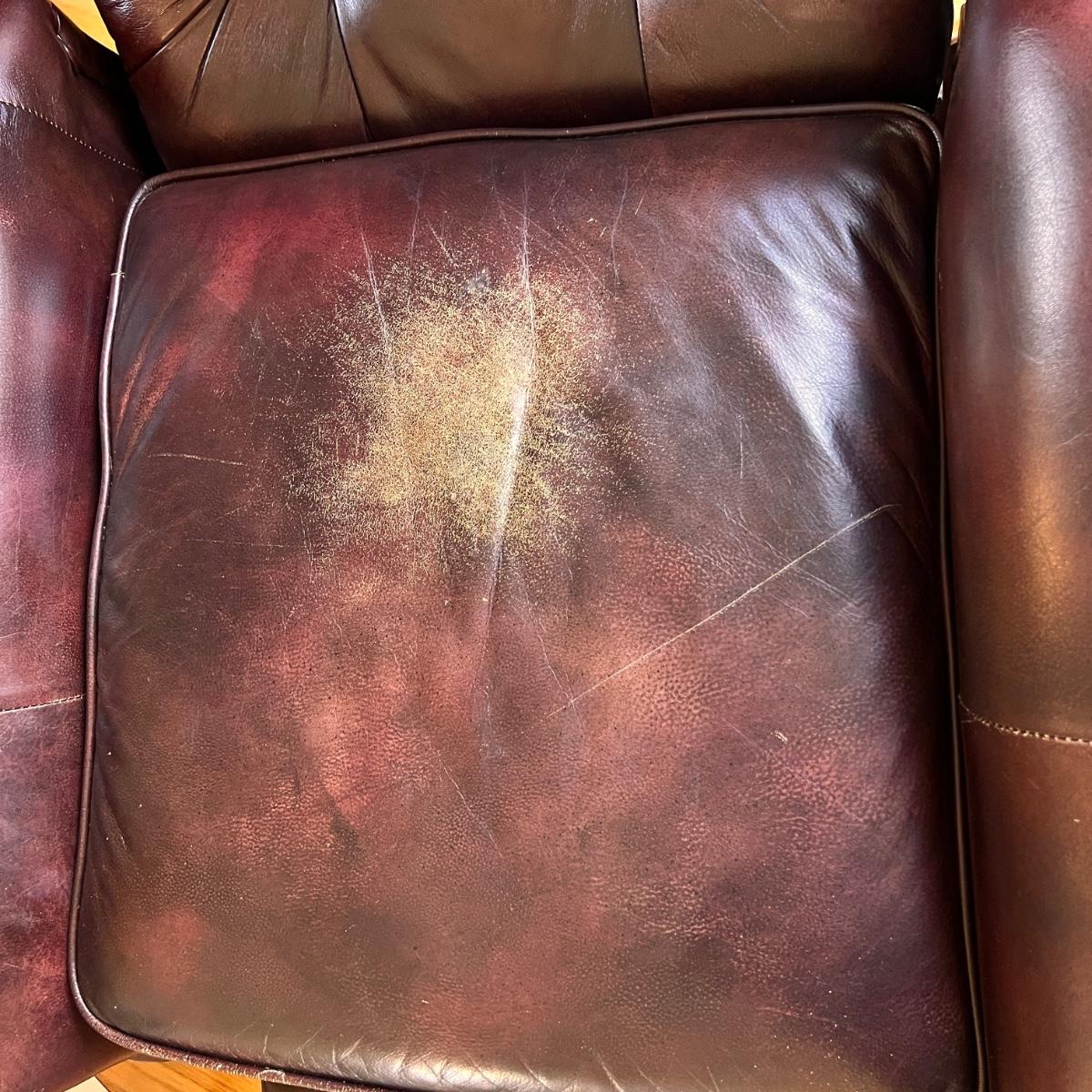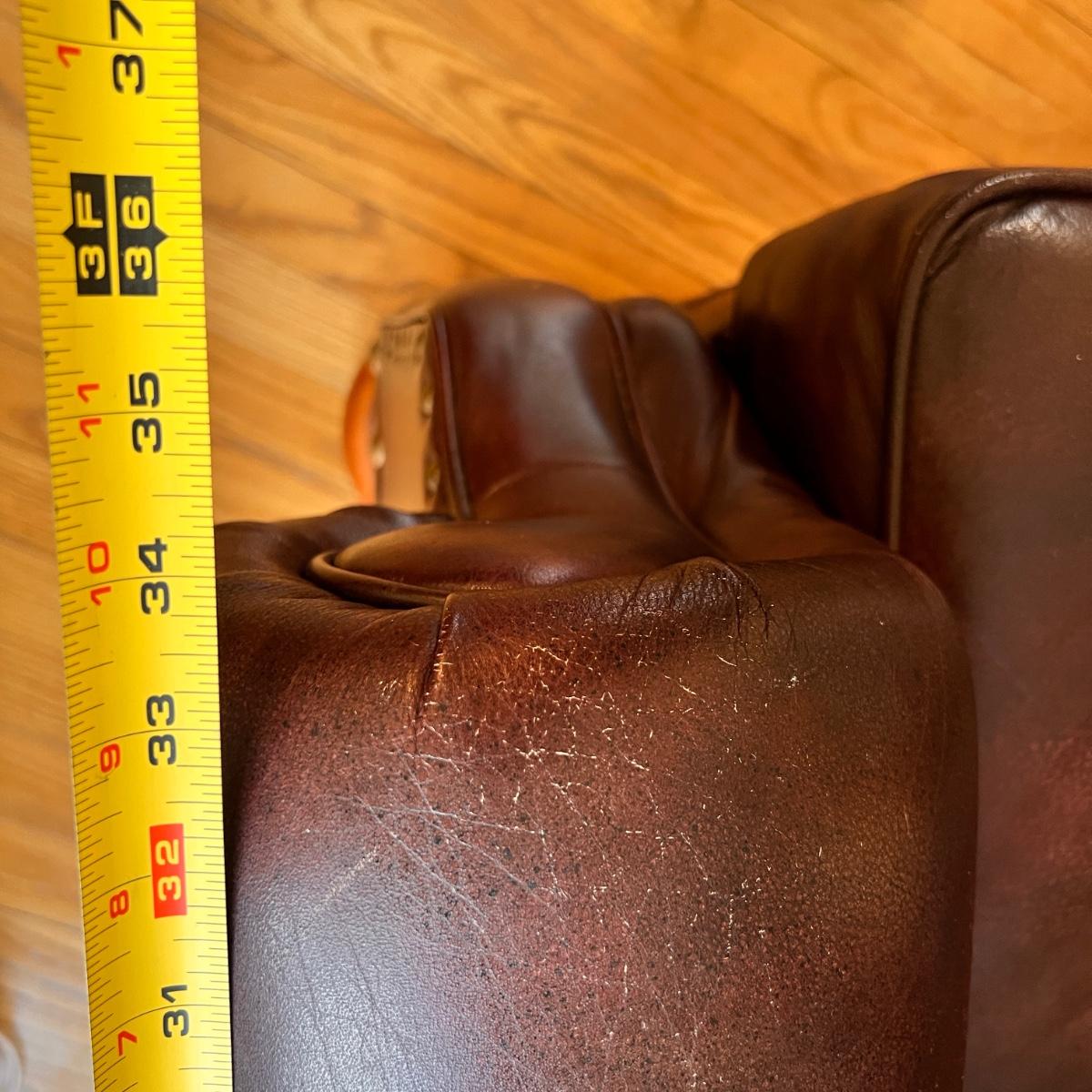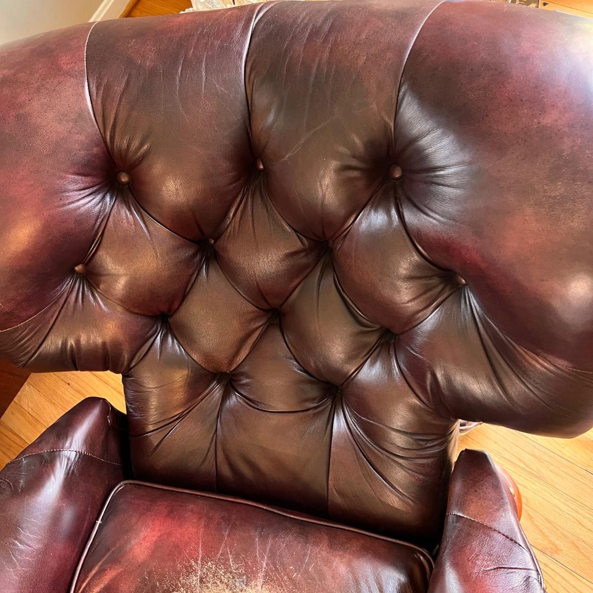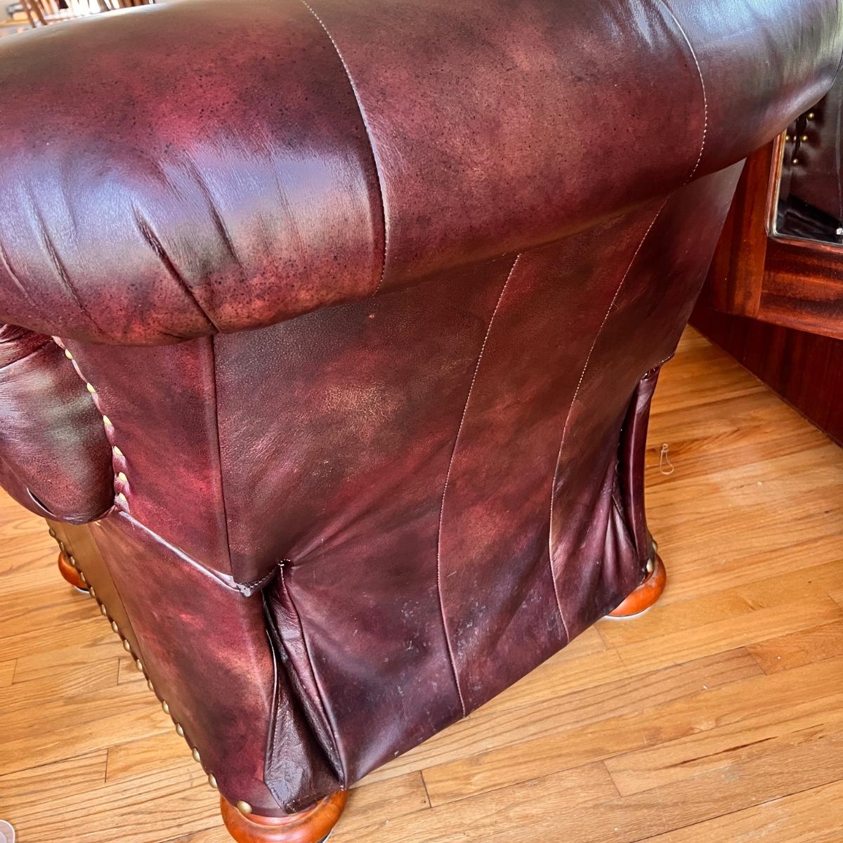 This is a super comfortable leather recliner. The leather is soft but does show some wear to the seat cushion as shown in pics. The first pic is a good representation of the leather and its color. It has a matching ottoman in lot 798 up for auction.