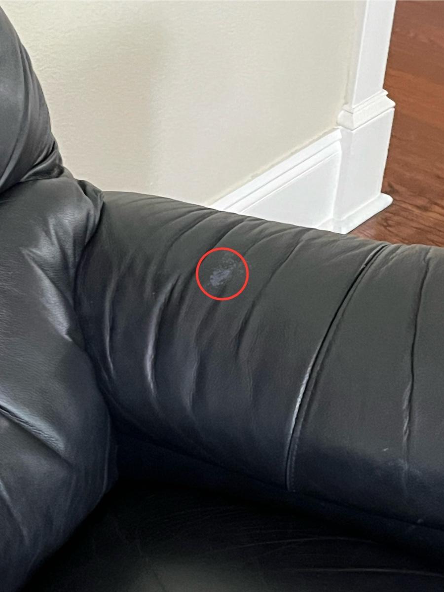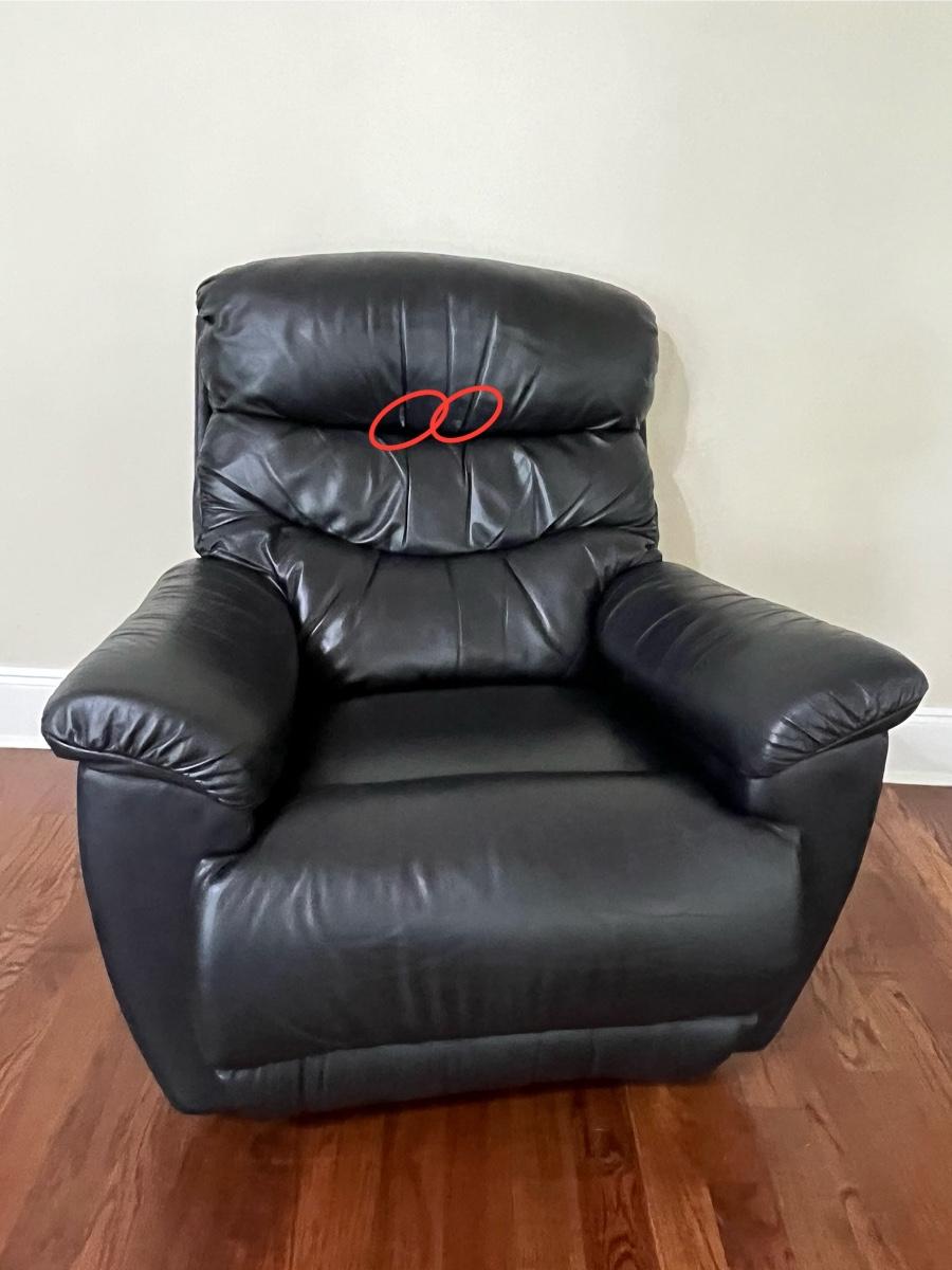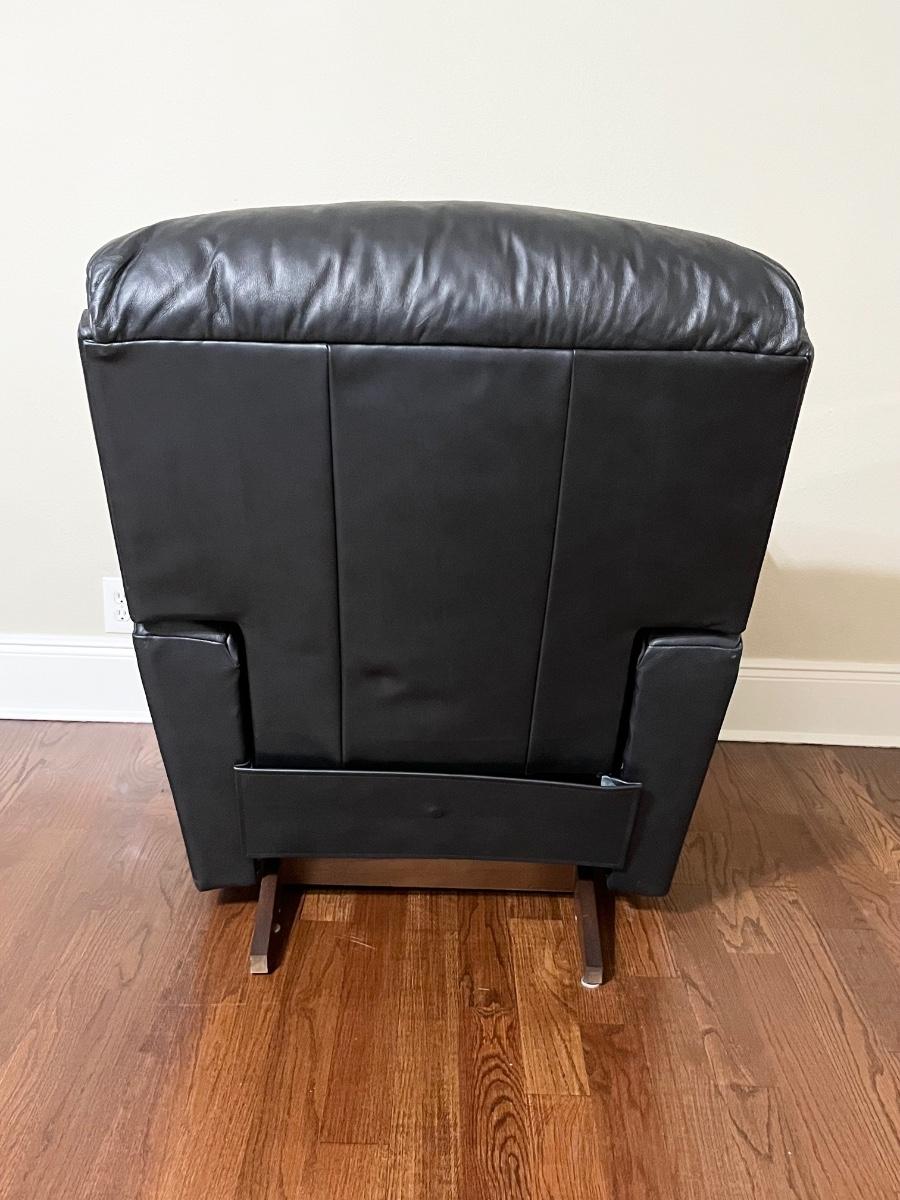 40" H x 39" W x 31" D ~ Pleather has wear in a couple of spots as seen in photos ~ Chair is navy not black, color is hard to capture in photos