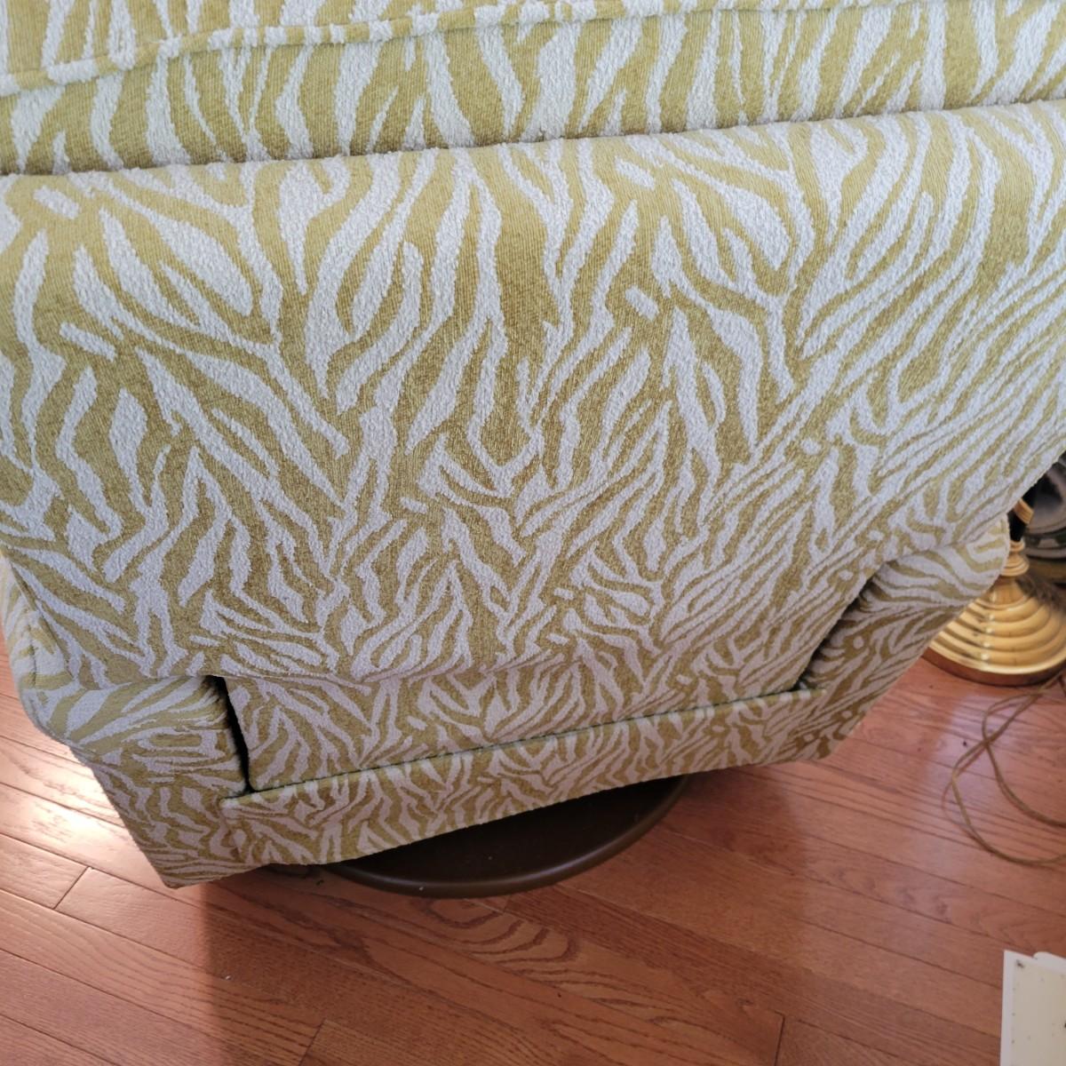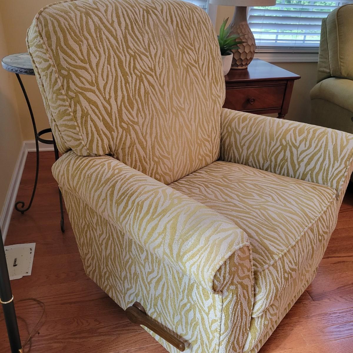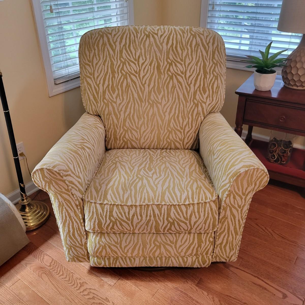A La-Z-Boy rocker/glider recliner that features goldish green upholstery with cream, textured accent pattern. It rocks, glides and rotates on a wooden base and reclines with a wooden handle on the side. It measures approximately 38" x 34" x 40"H. Local pickup only. Winning bidder must bring assistance to help move and load this item due to its weight and/or size.