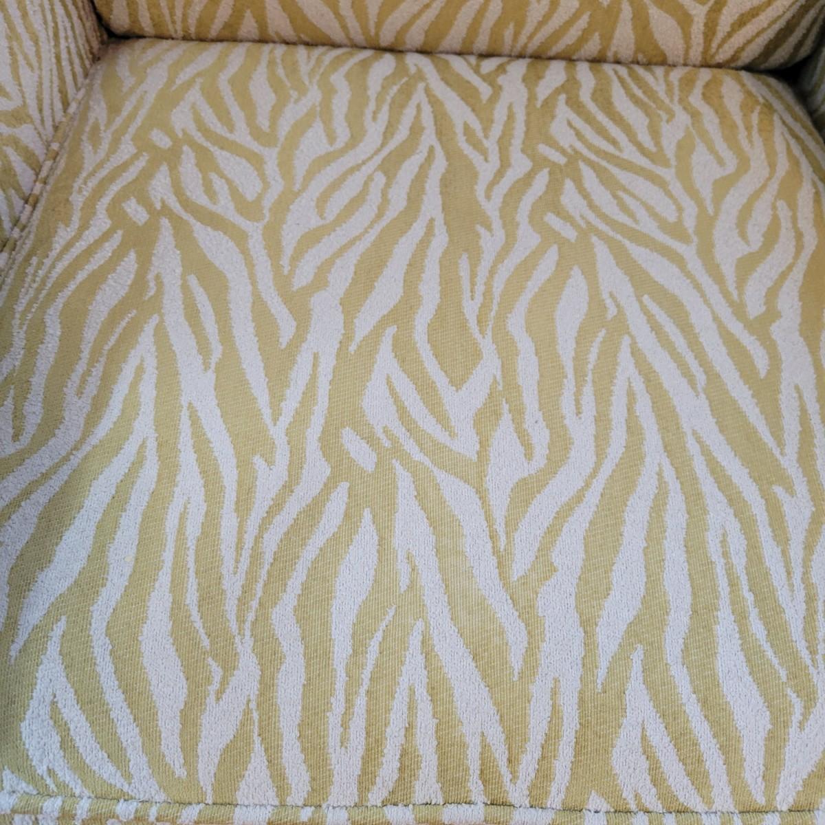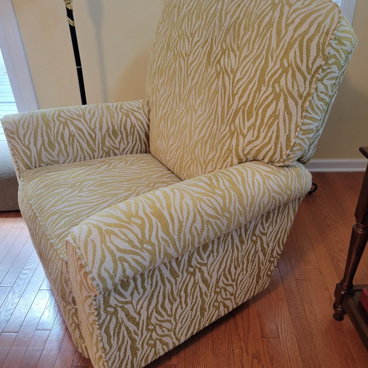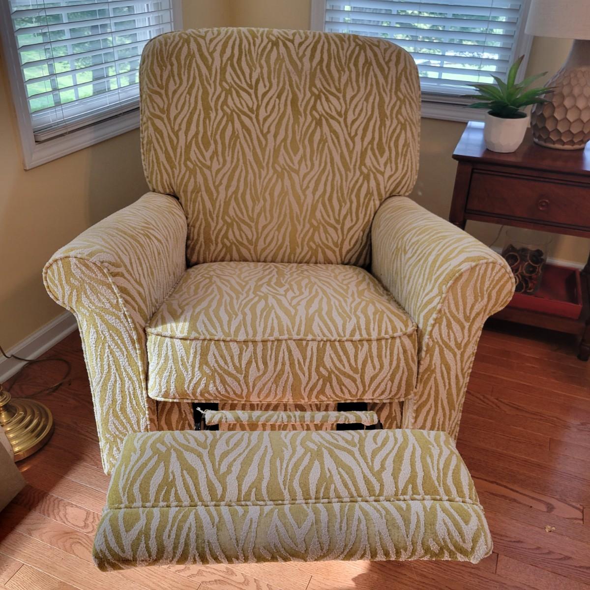 A La-Z-Boy rocker/glider recliner that features goldish green upholstery with cream, textured accent pattern. It rocks, glides and rotates on a wooden base and reclines with a wooden handle on the side. It measures approximately 38" x 34" x 40"H. Local pickup only. Winning bidder must bring assistance to help move and load this item due to its weight and/or size.