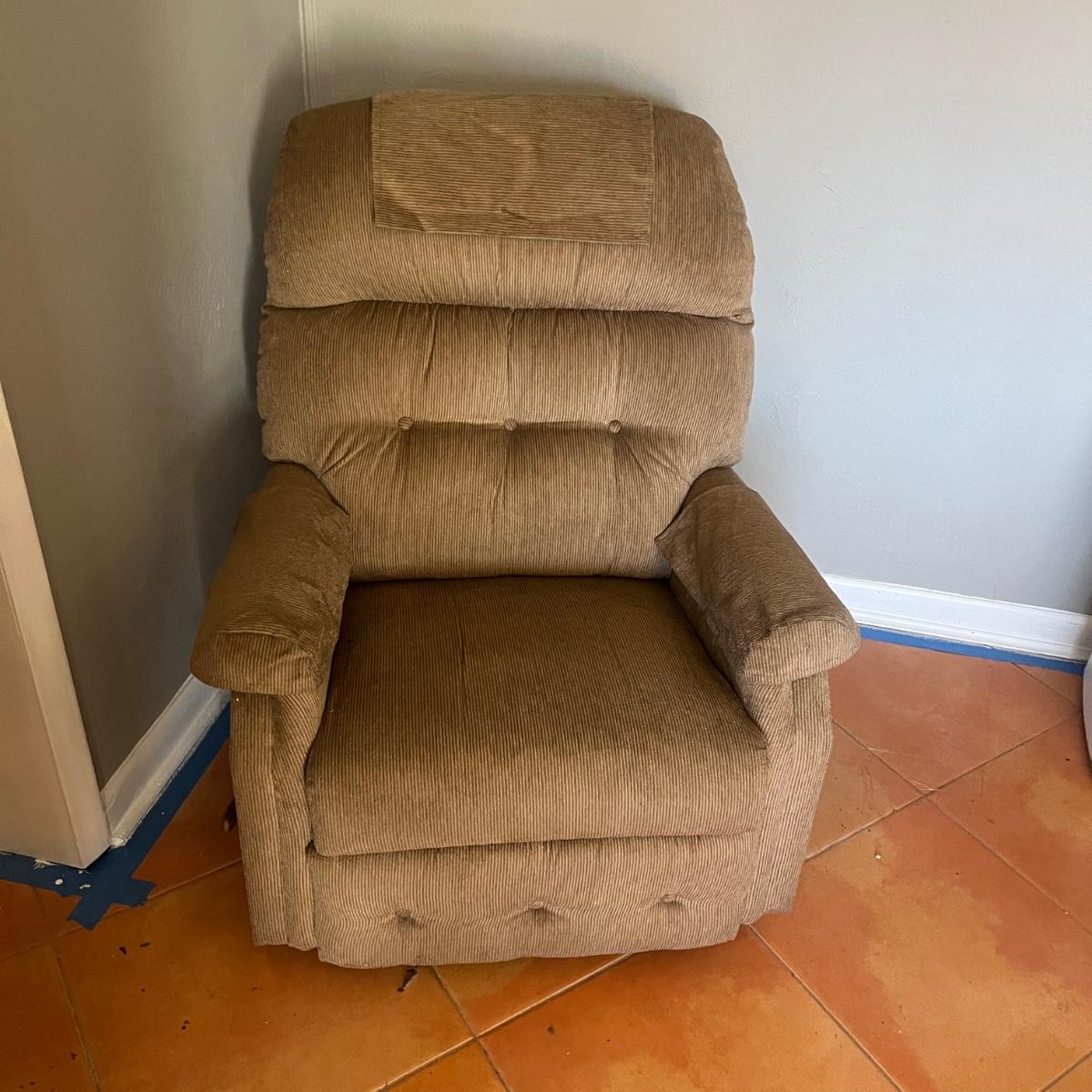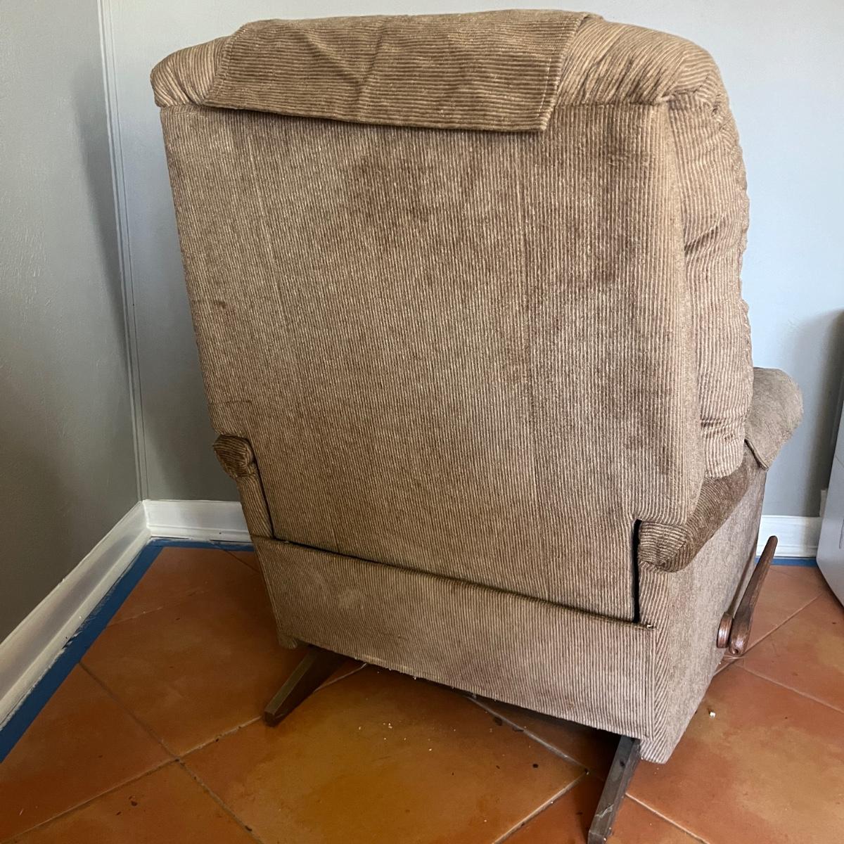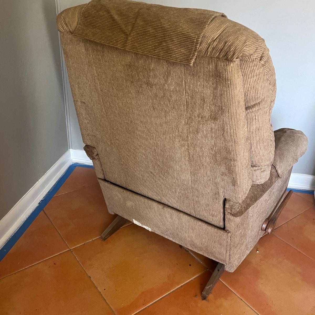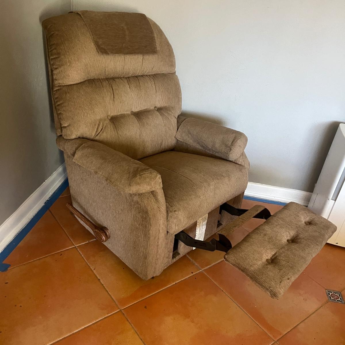 Lot includes a La-Z-Boy rocking recliner that measures 34” x 30” x 40”H with a 18” seat height. Fabric has a corduroy feel to it and has arm and head protectors.