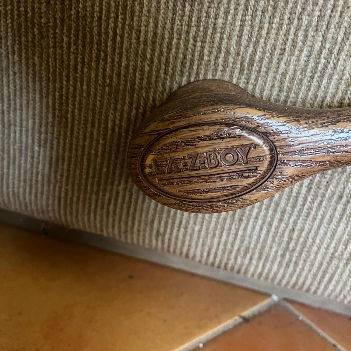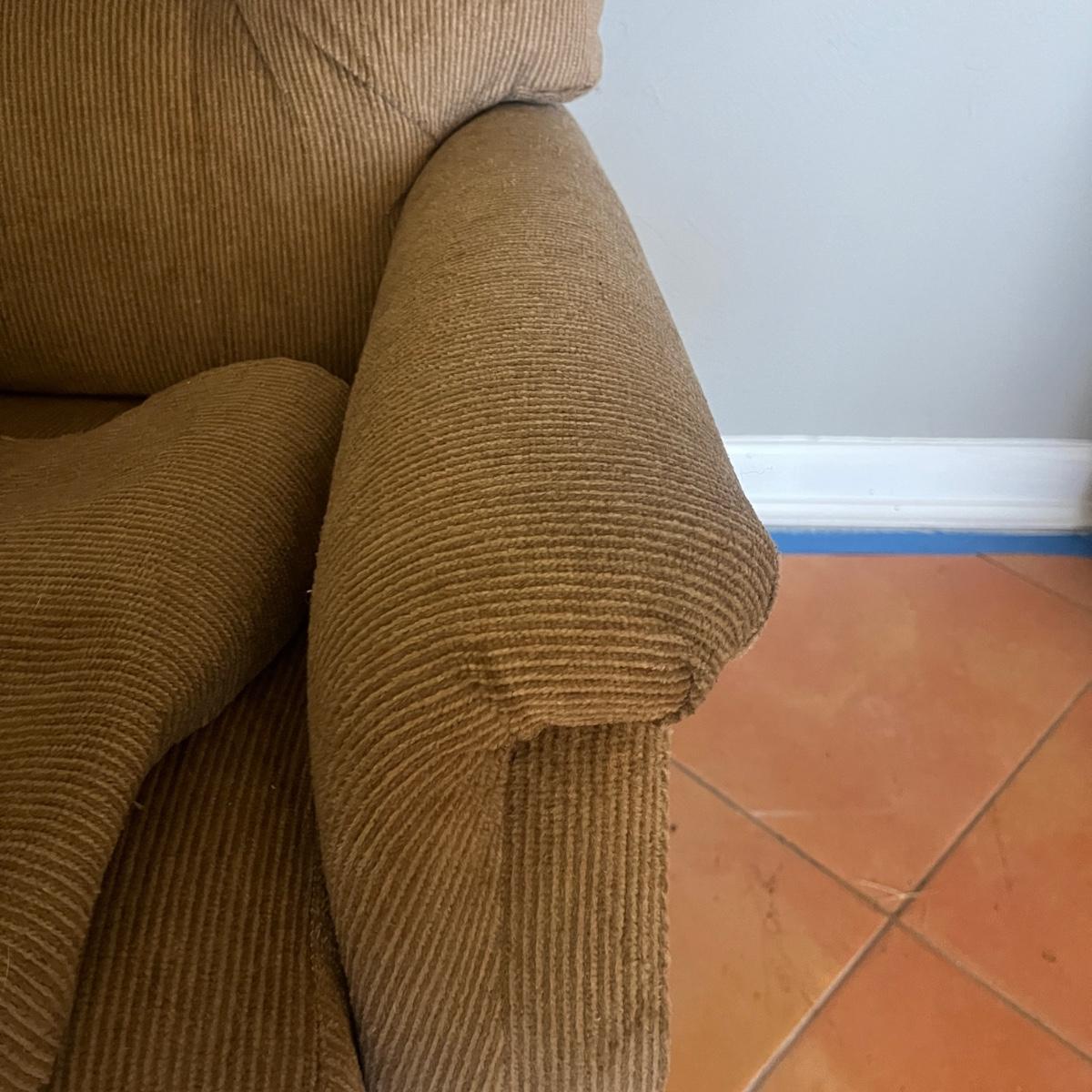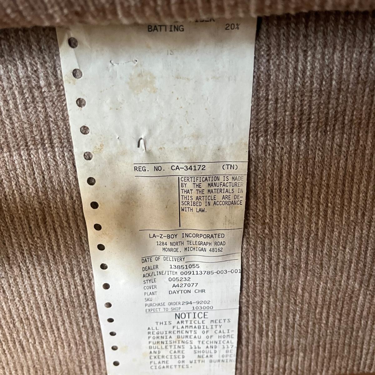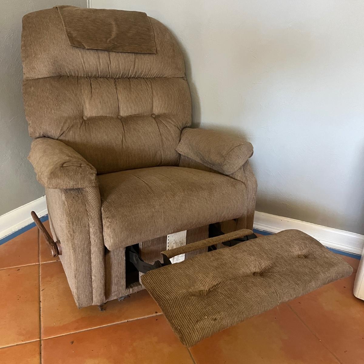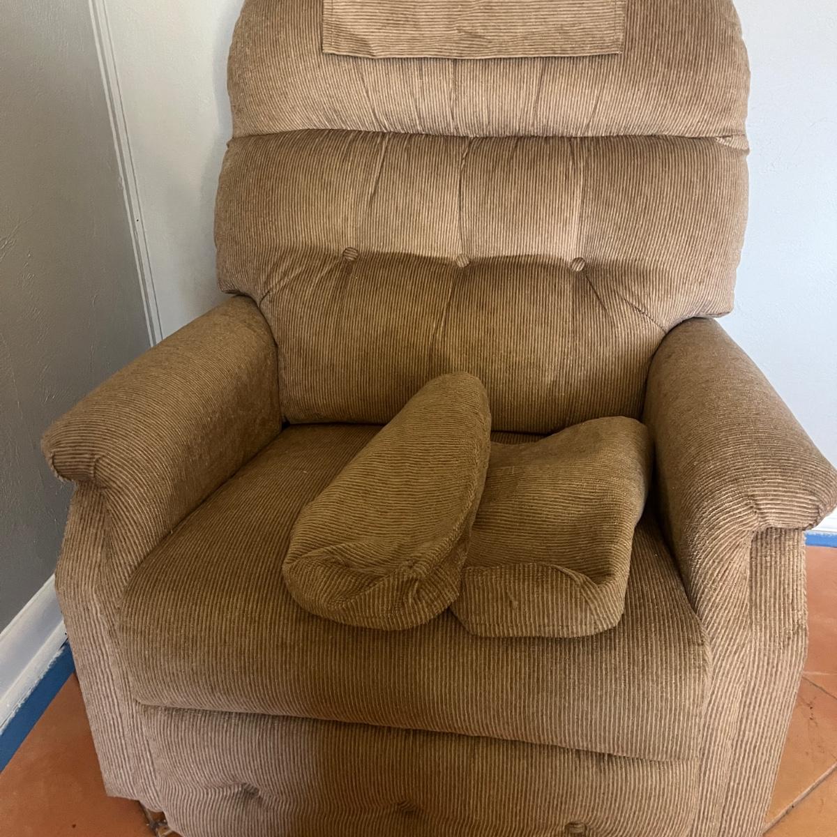 Lot includes a La-Z-Boy rocking recliner that measures 34” x 30” x 40”H with a 18” seat height. Fabric has a corduroy feel to it and has arm and head protectors.