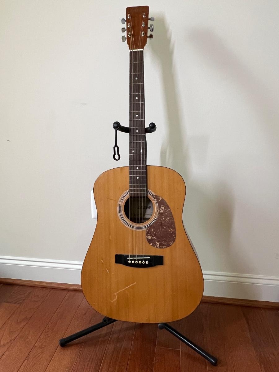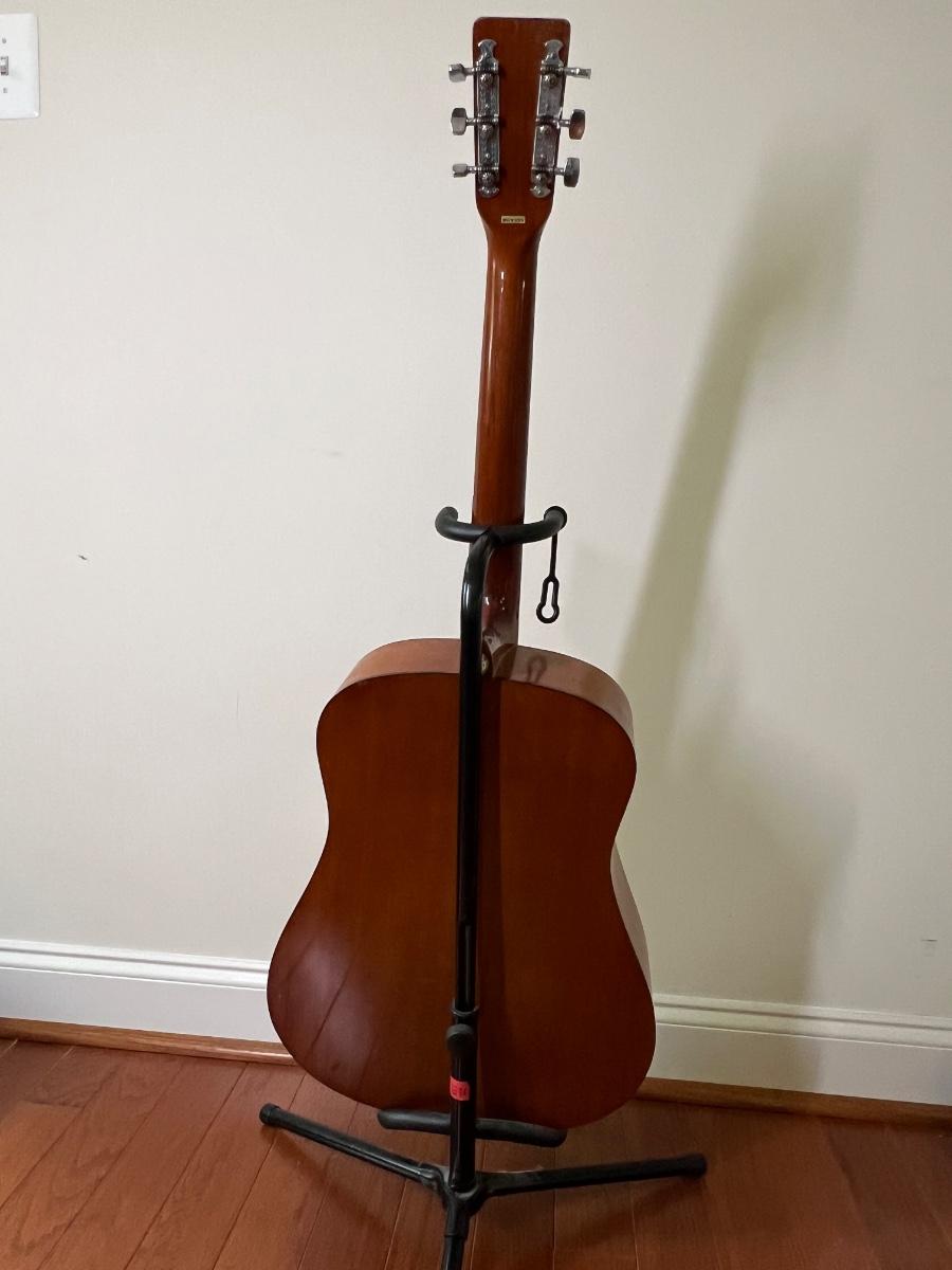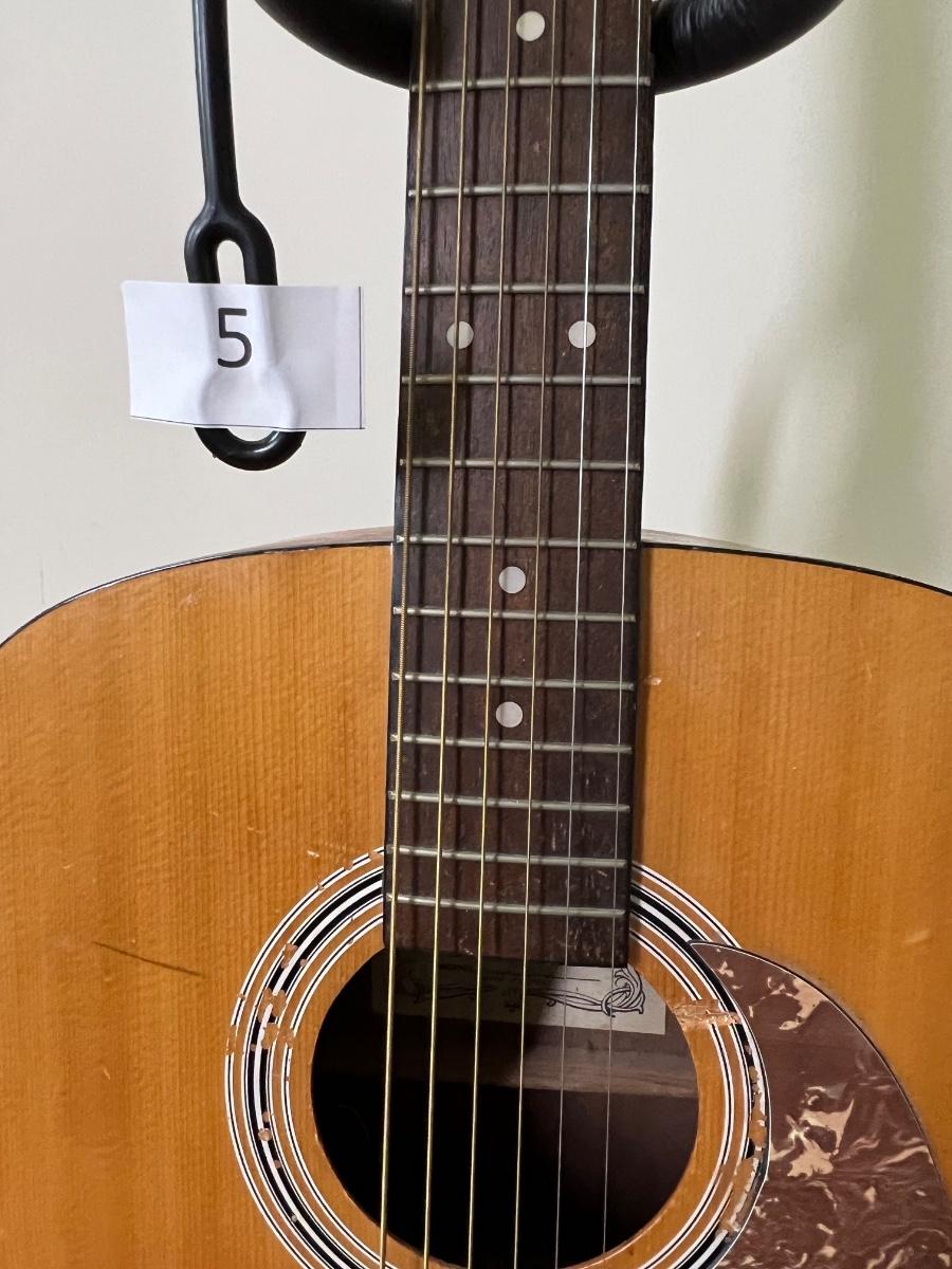 Acoustic 6 string guitar with stand. Has some scratches as shown in the pictures.