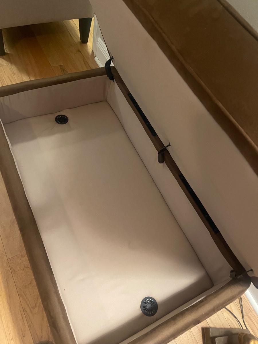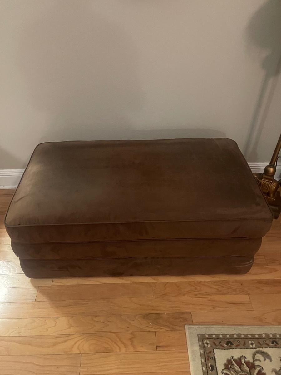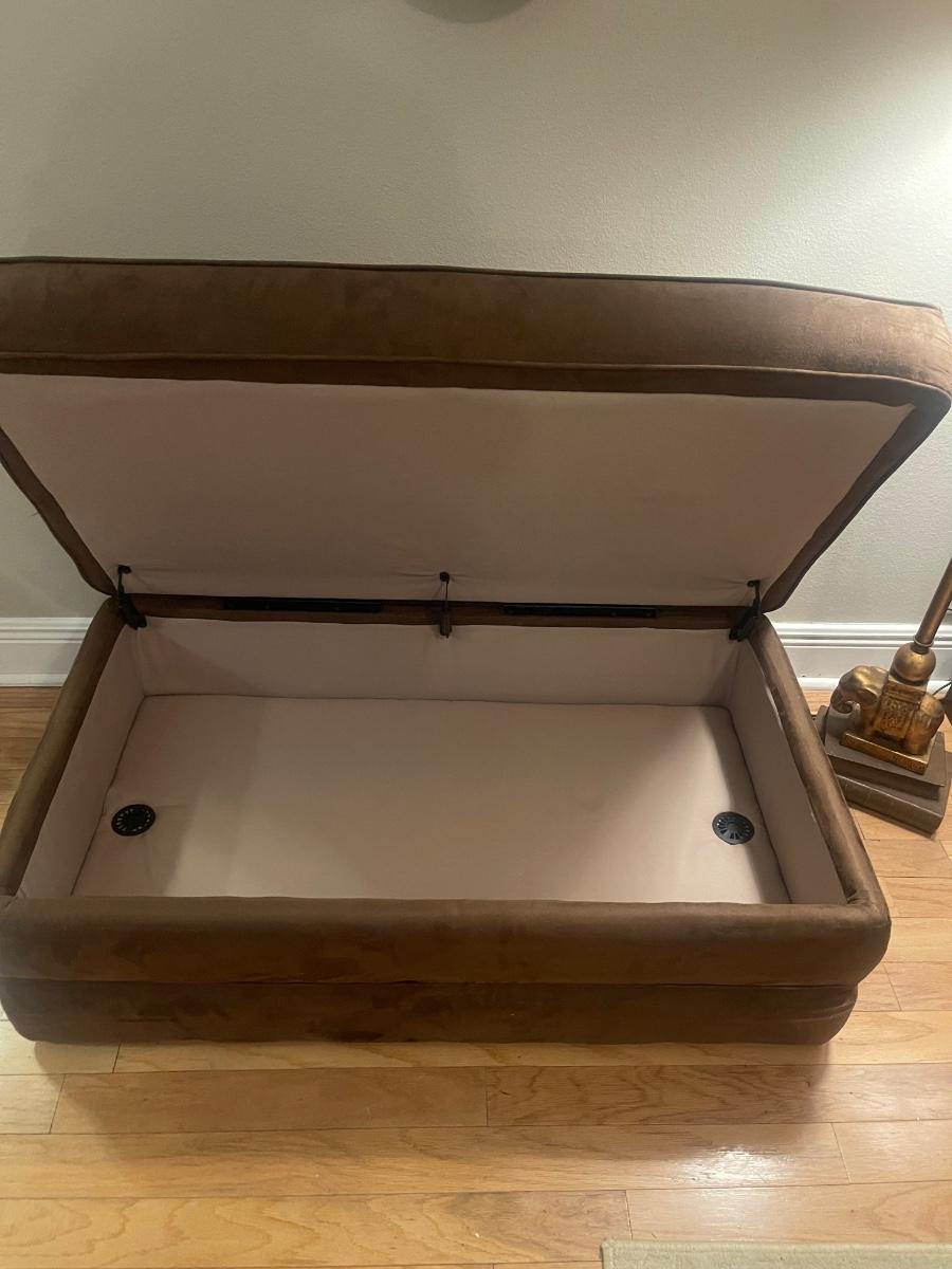 Lazy Boy brown suede storage ottoman. Has rollers for easy movement. 43” wide, 25” deep, 17” high. $75. Excellent condition.