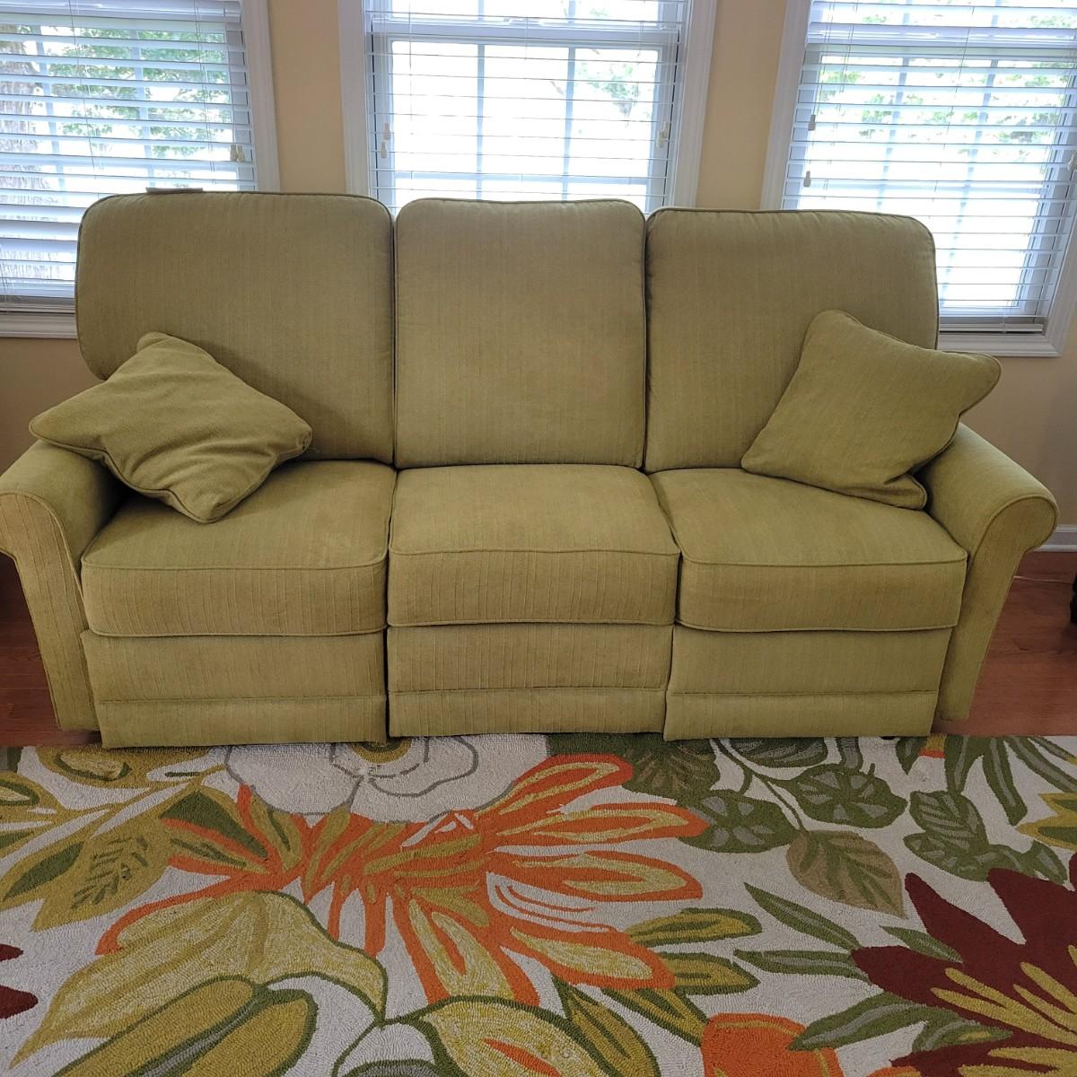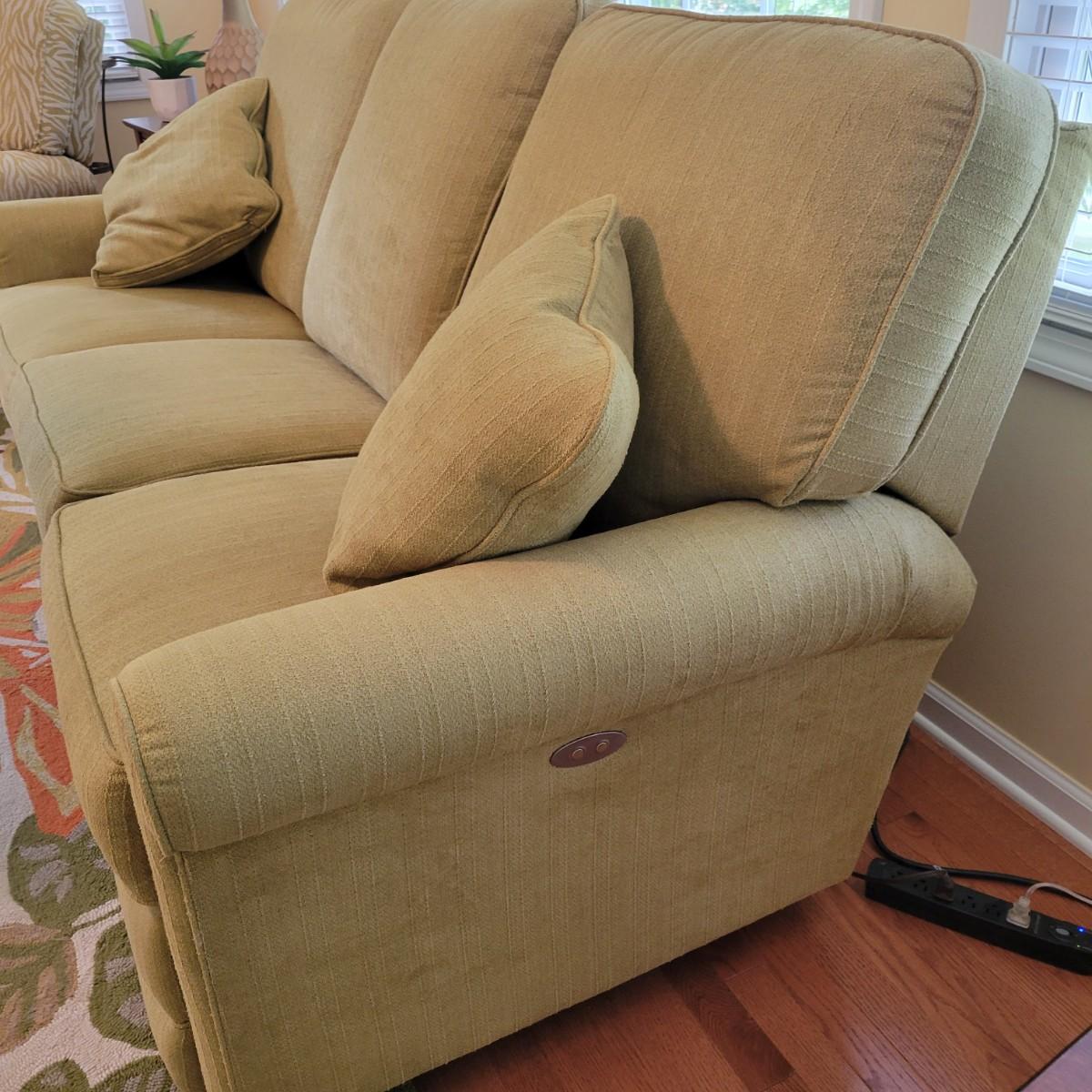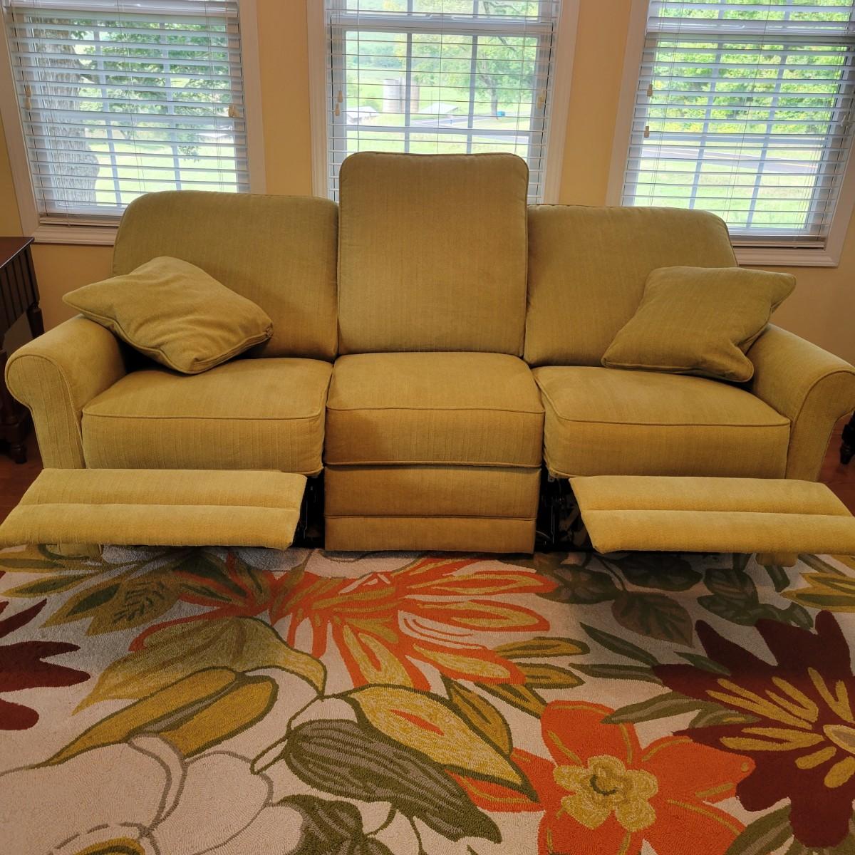 A Lazy Boy motorized reclining couch that powered on when plugged in. This couch features a soft, asparagus green upholstery that includes two matching accent pillows. It reclines by two buttons just under the armrests on the outside of the couch. Only the two end sections recline and it measures approximately 84" x 40" x 36"H. Local pickup only. Winning bidder must bring assistance to help move and load this item due to its weight and/or size.