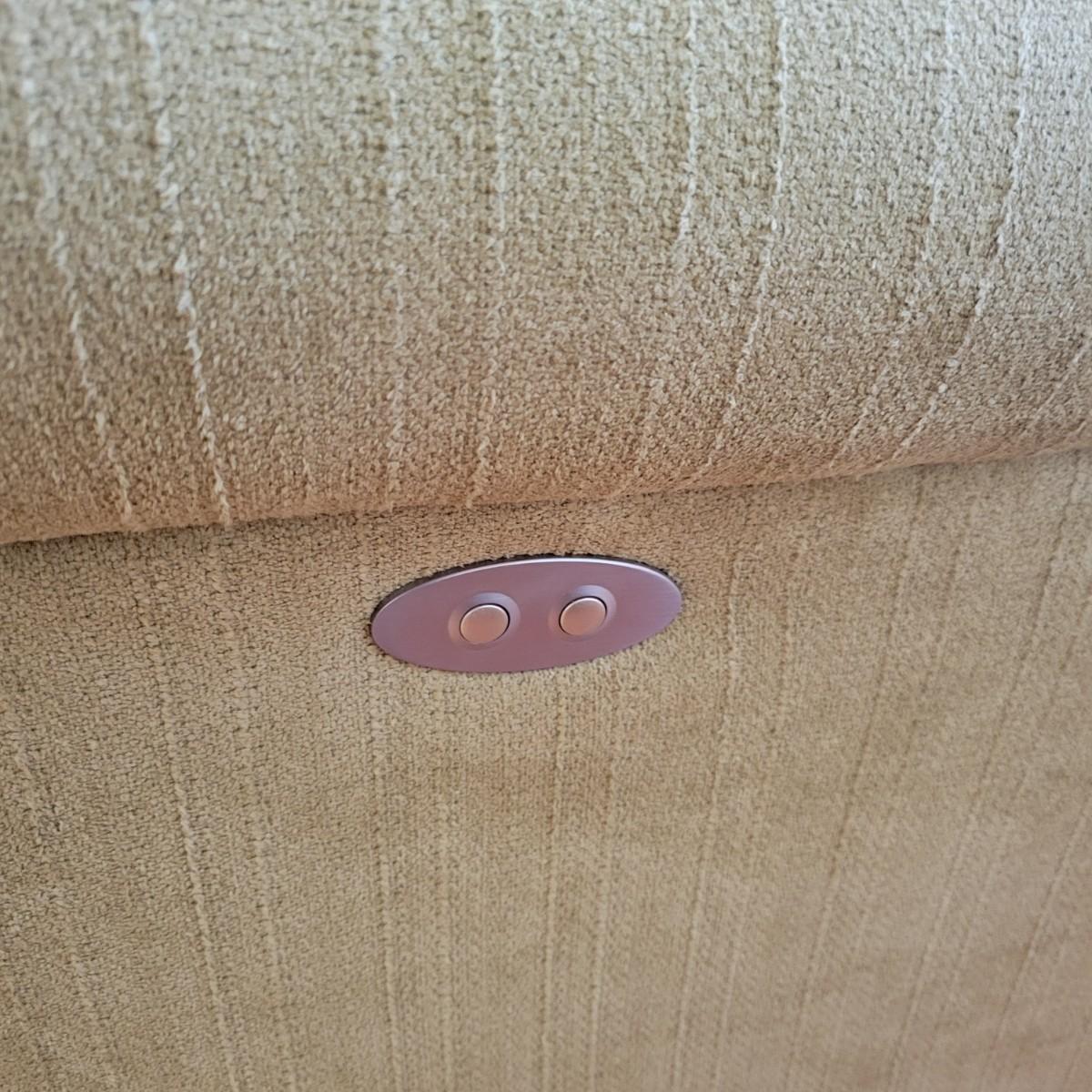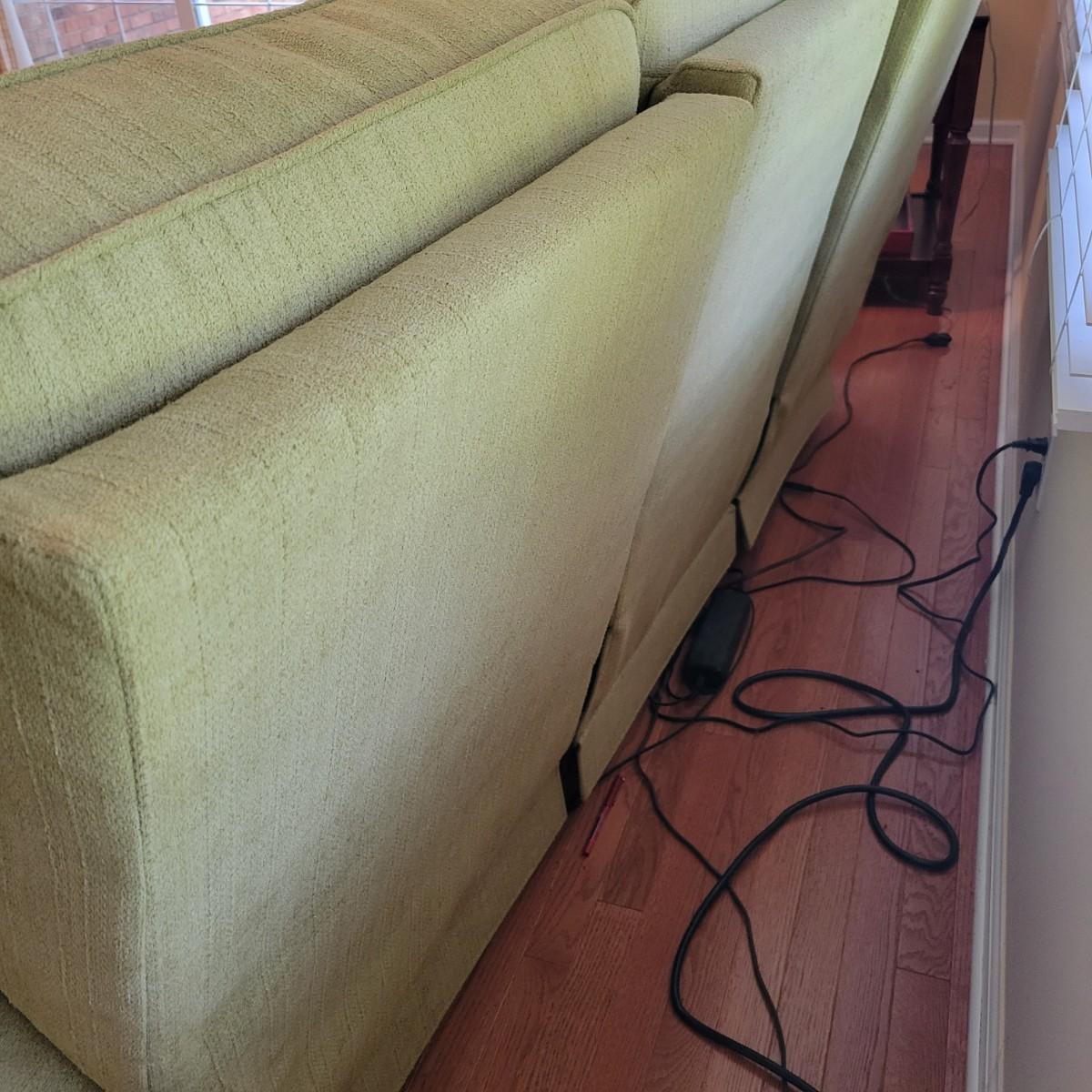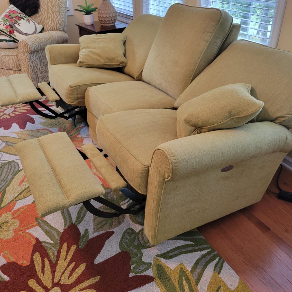 A Lazy Boy motorized reclining couch that powered on when plugged in. This couch features a soft, asparagus green upholstery that includes two matching accent pillows. It reclines by two buttons just under the armrests on the outside of the couch. Only the two end sections recline and it measures approximately 84" x 40" x 36"H. Local pickup only. Winning bidder must bring assistance to help move and load this item due to its weight and/or size.