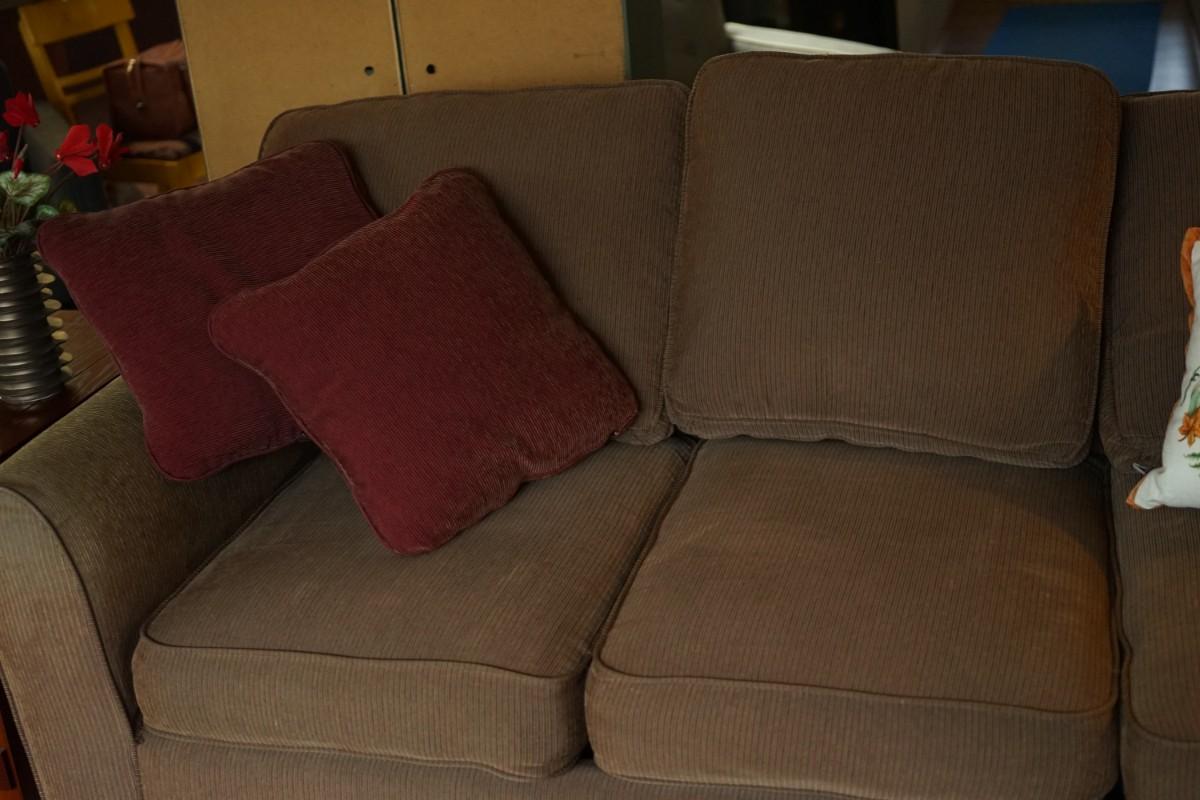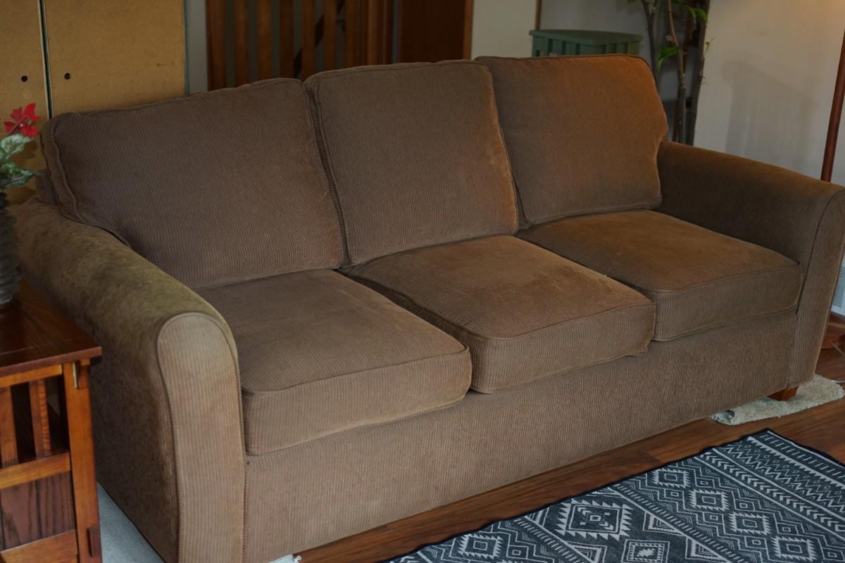 The brown is a medium brown and could capture the color so took several photos. It is what I liked about the sofa is the color. Would go well with many different colors, It is in good clean condition. I did note just one small area that had a little staining but not very noticeable. It is on the arm of the sofa. The mattress has been used but the owner said it is very comfortable. It appears in good condition no stains just wear is noted.