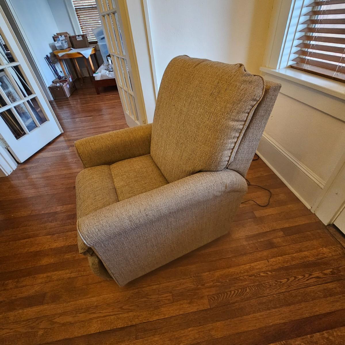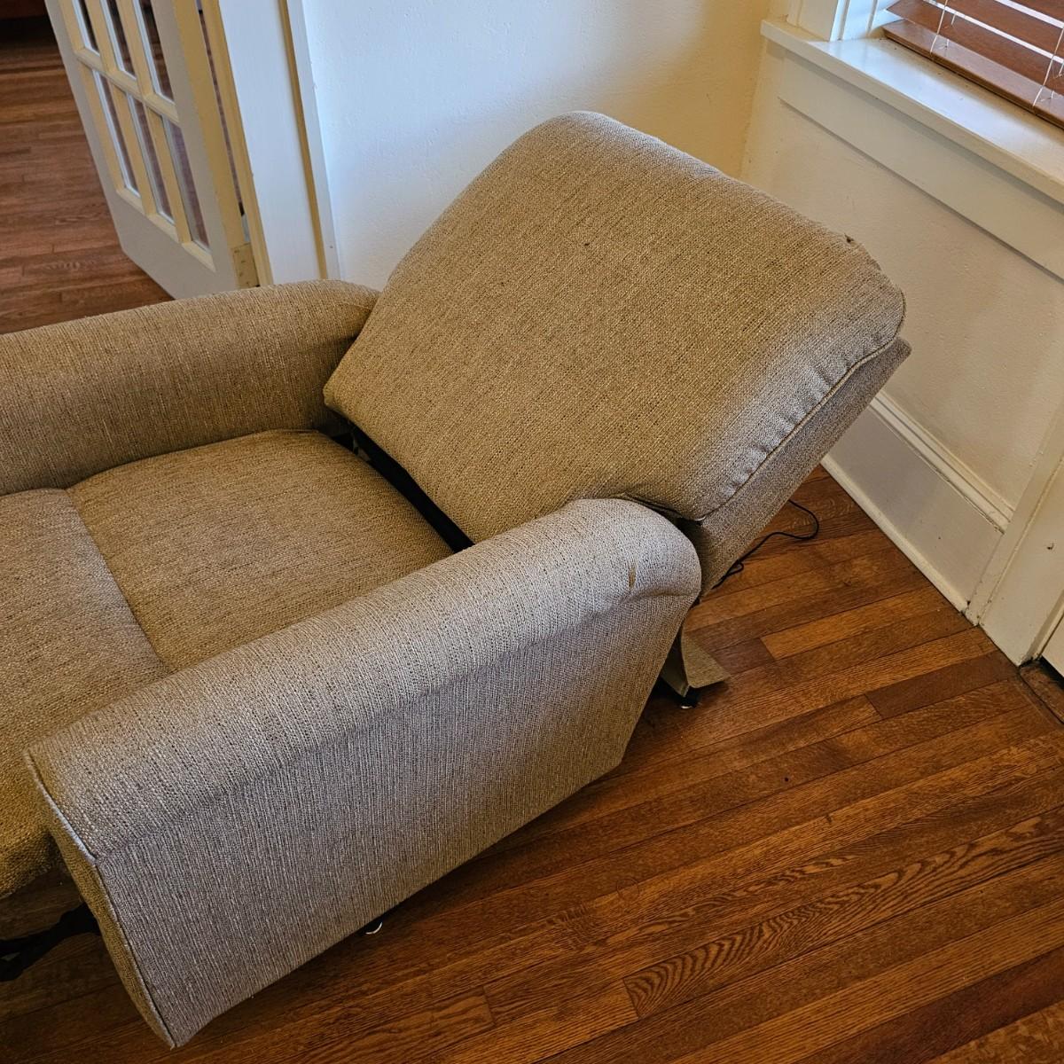 Small stature tan cloth power chair by La-Z-Boy. Simple two button attached control for up and down. Includes power supply and powered on when plugged in. Chair measures 31" x 38" x 36"H with 19" seat height when at rest. Seat raises to 23" H when fully up, and chair extends to 60" long fully extended. See photos for details. Local pickup only. Winning bidder must bring assistance to help move and load this item due to its weight and/or size. Chair is on 1st floor by door for easy removal.