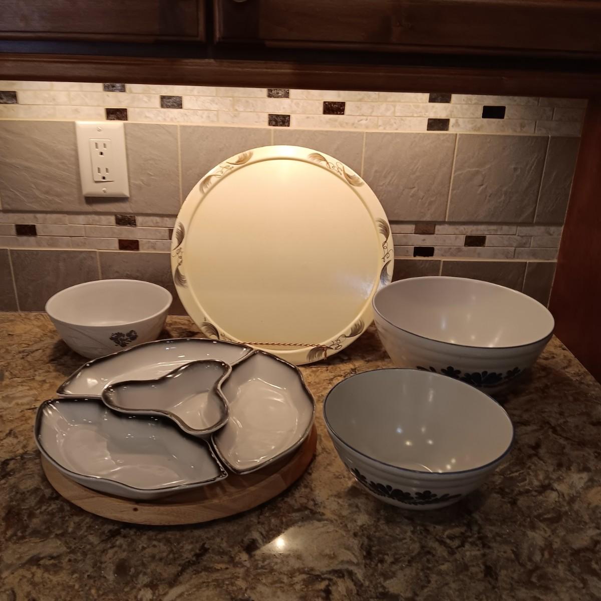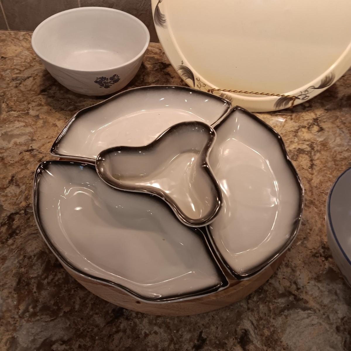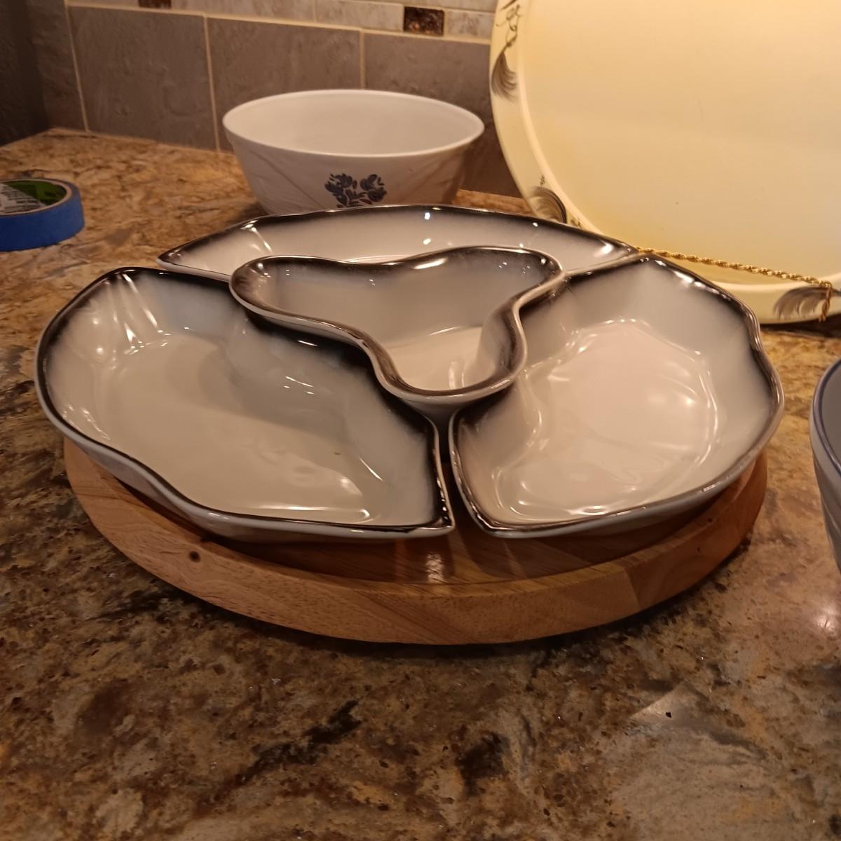 LAZY SUSAN CHIP AND DIP, 3 PFALTGRAFF NESTING BOWLS AND A WOODEN SERVING TRAY