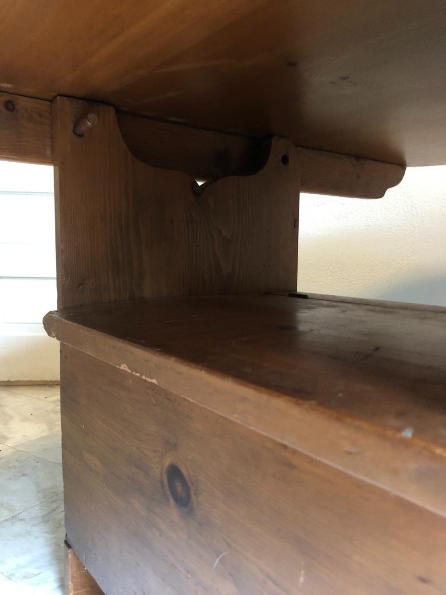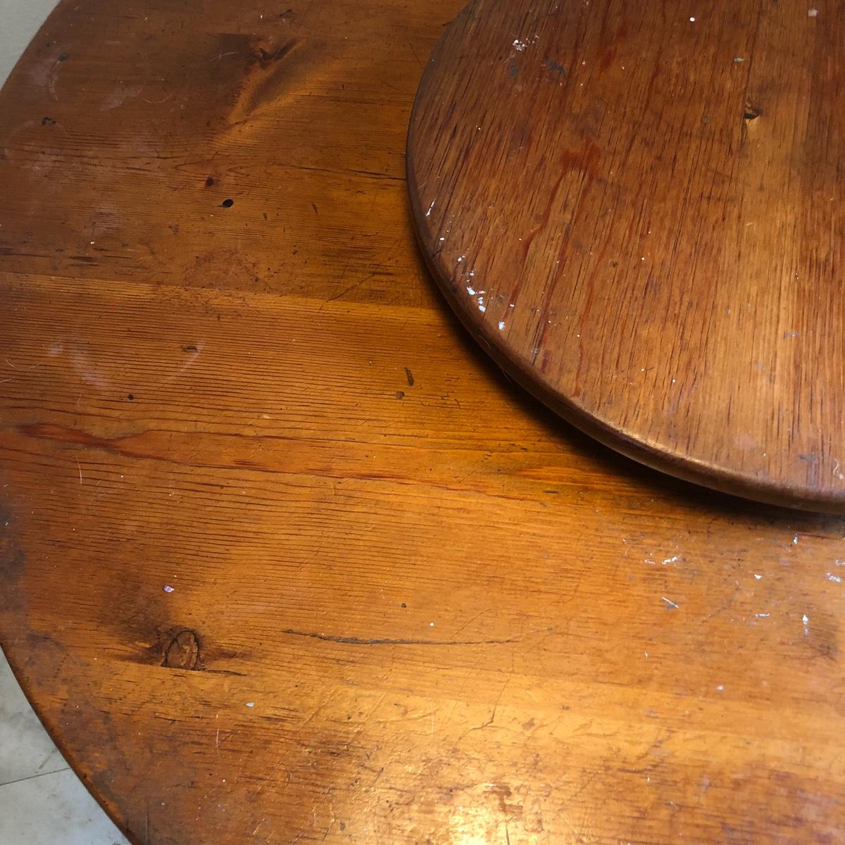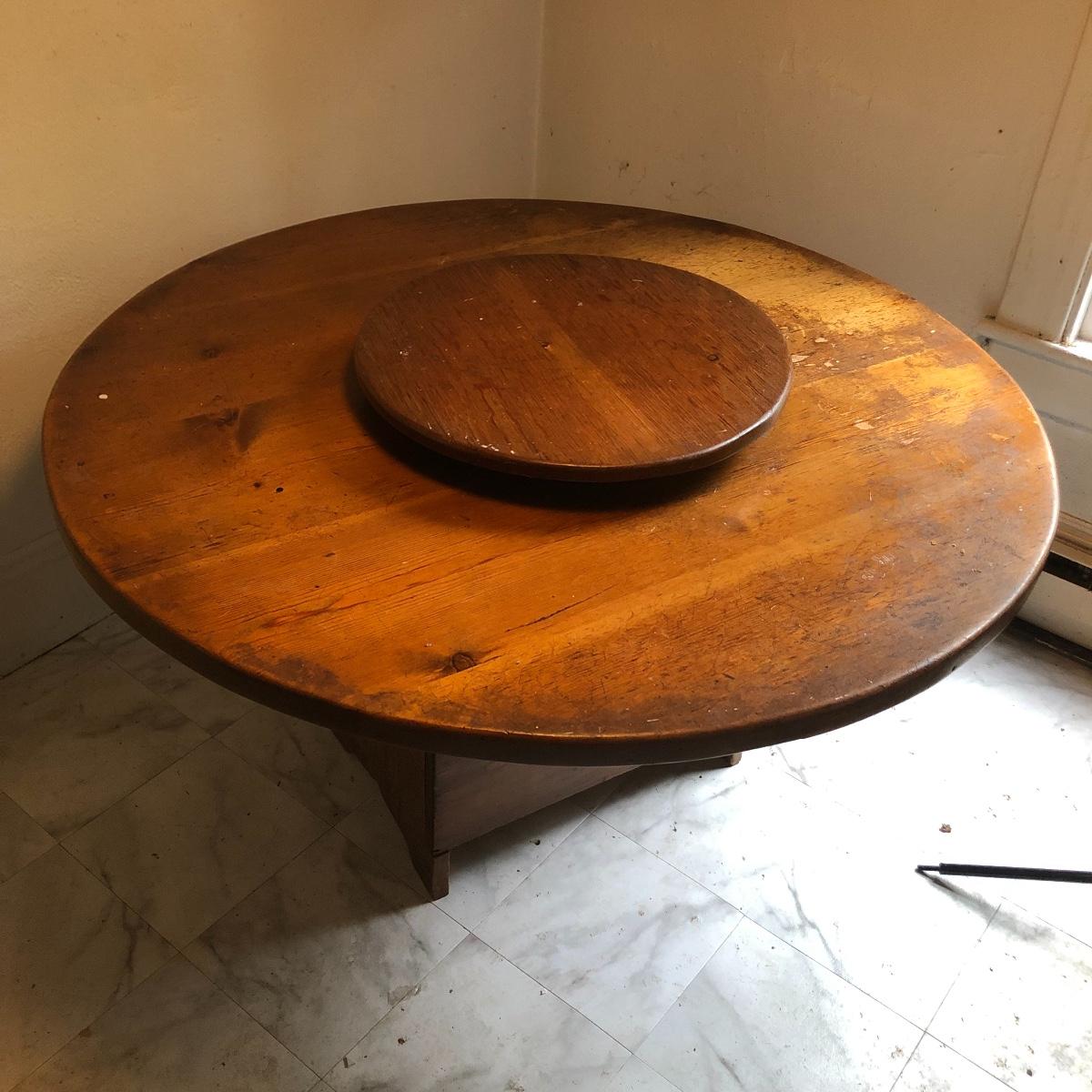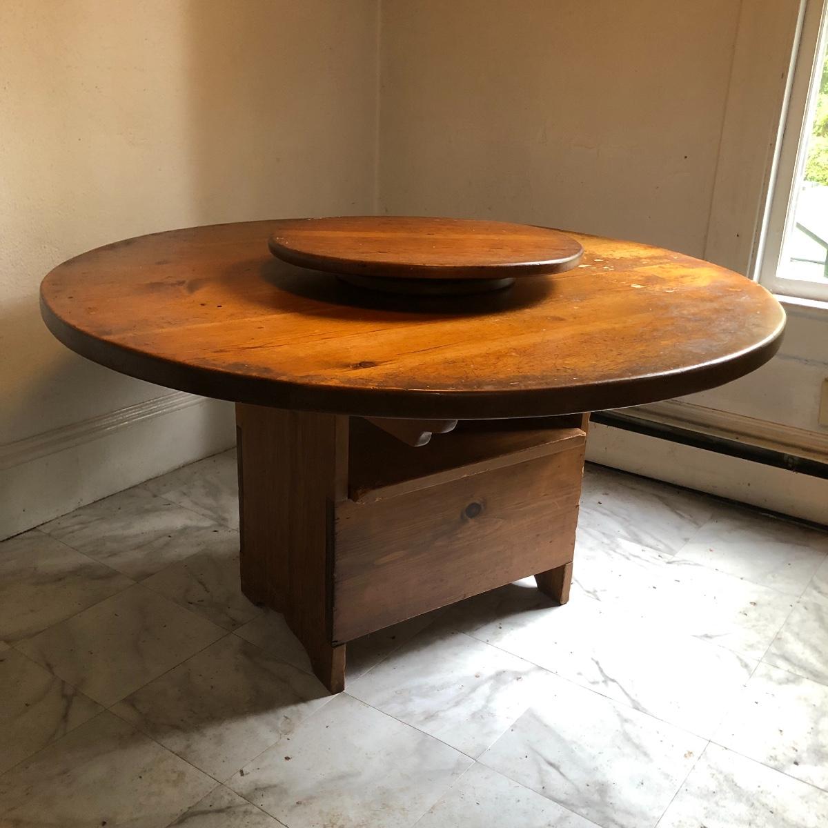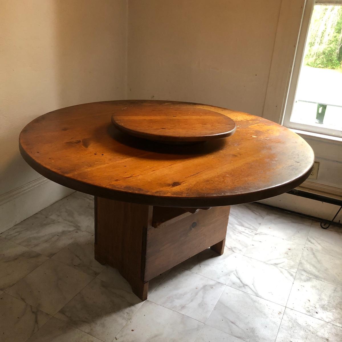 This exquisite and unique dining table is a well built solid wood piece that is in overall good condition; it will need some surface refinishing to restore it which will be so worth the effort as this table is as good as they get and a rare find. In addition to the lazy Susan in the center (measures 23.5” d x 4” tall) it has a good sized storage box with hinged lid that has been built in to the tables base (measures 14” x 22” x 12”.