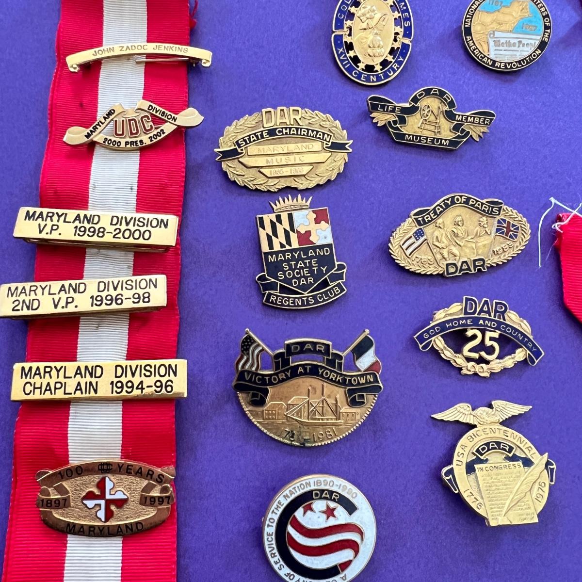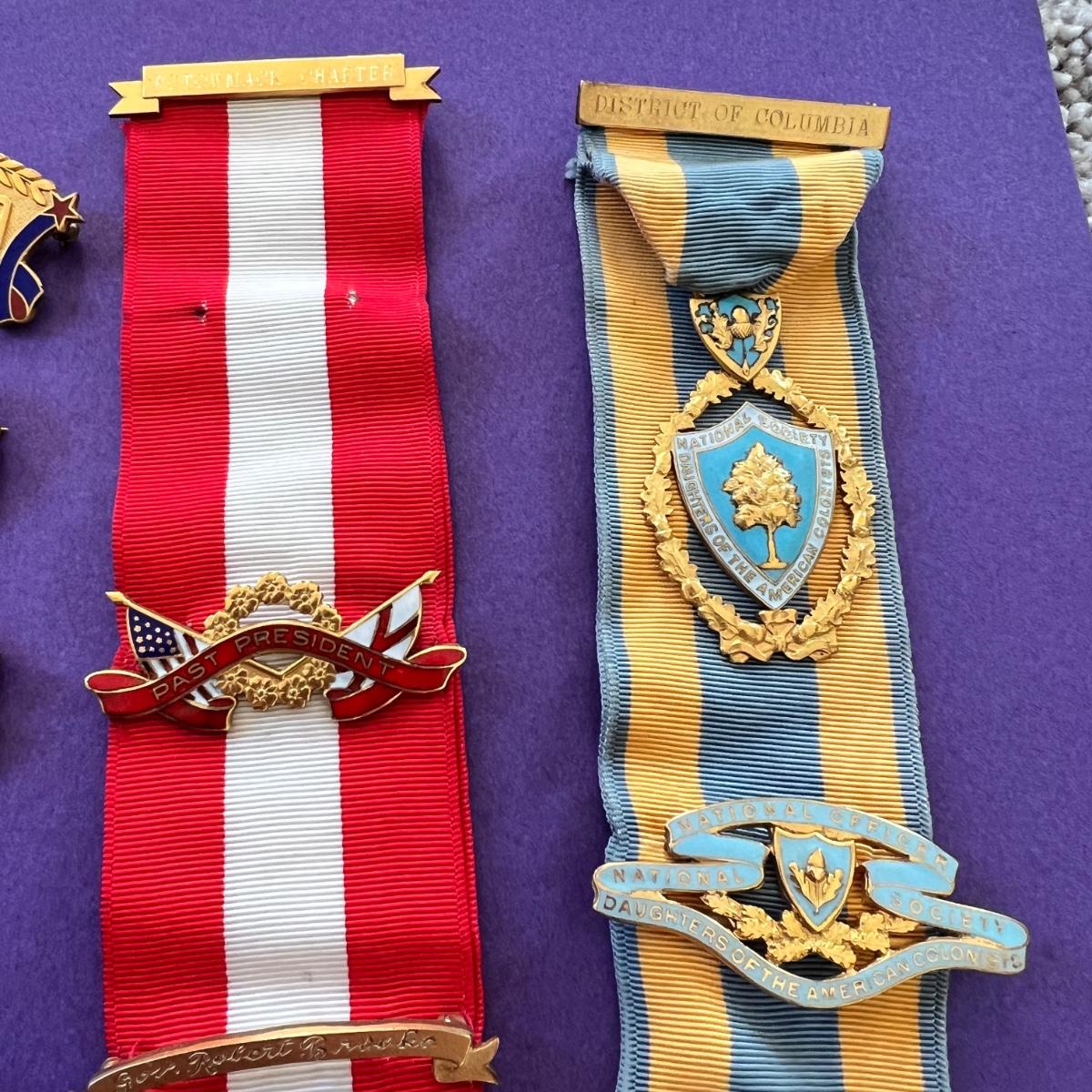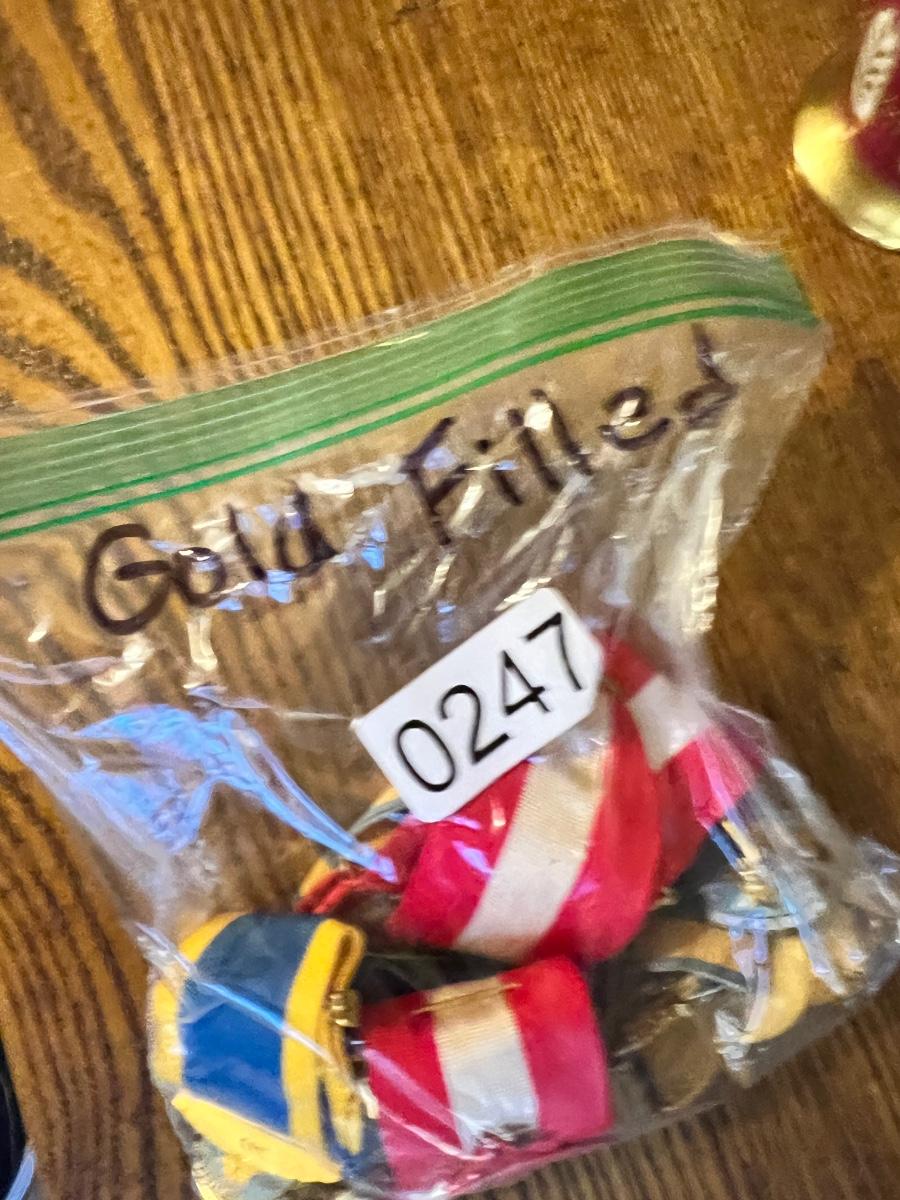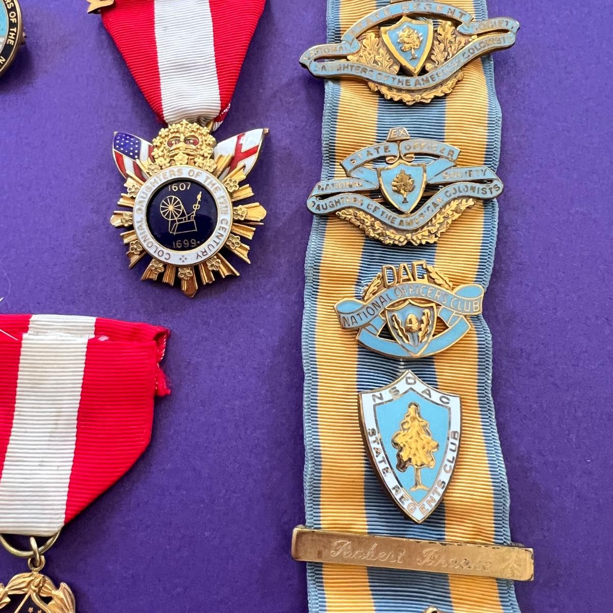Large lot of badges, ribbons, metals. All are marked gold filled. We are auctioning other lots of similar badges in 10k and 14k gold.