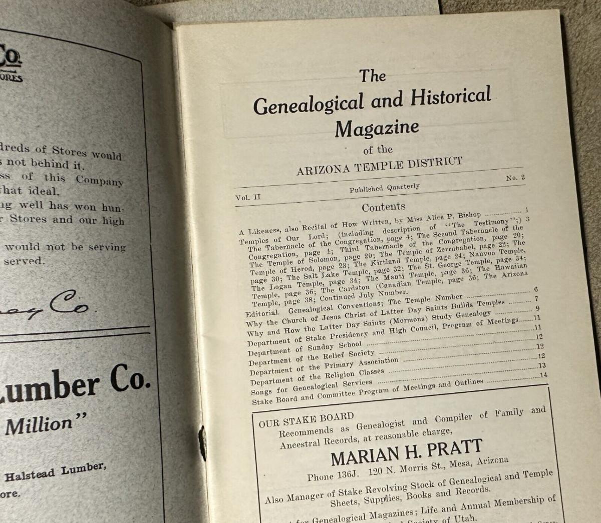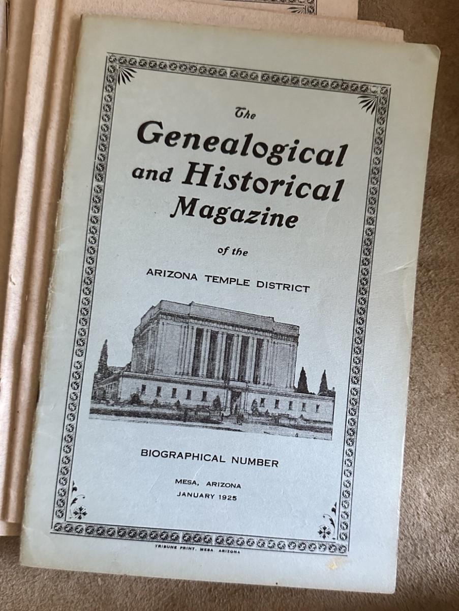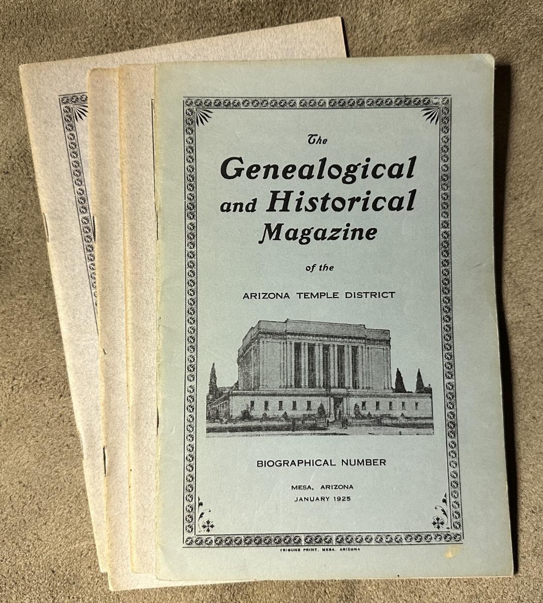 In good condition with light normal use here is a complete year of The Genealogical and Historical Magazine of the ARIZONA TEMPLE DISTRICT..published by the L.D.S. Church in 1925..Published quarterly in Mesa, Arizona..4 issues Volume II Nos. 1-4...Second year of publication...Paperback..