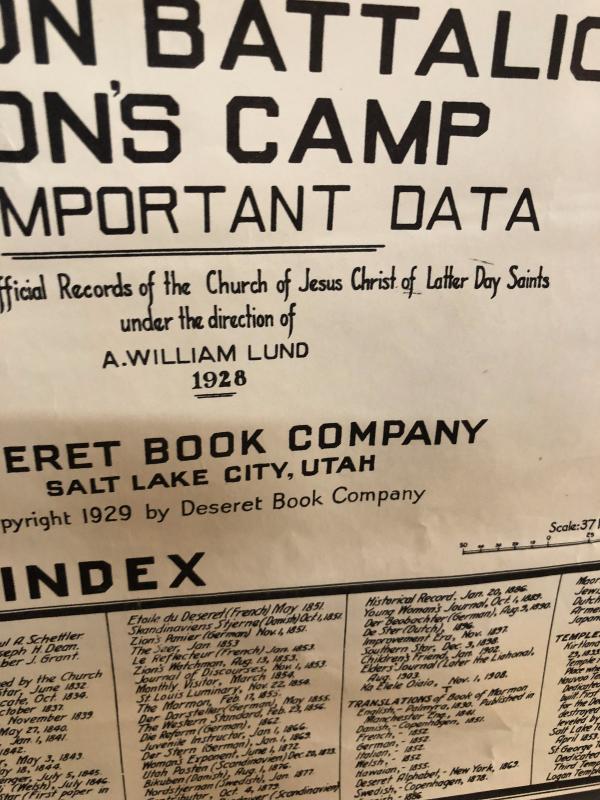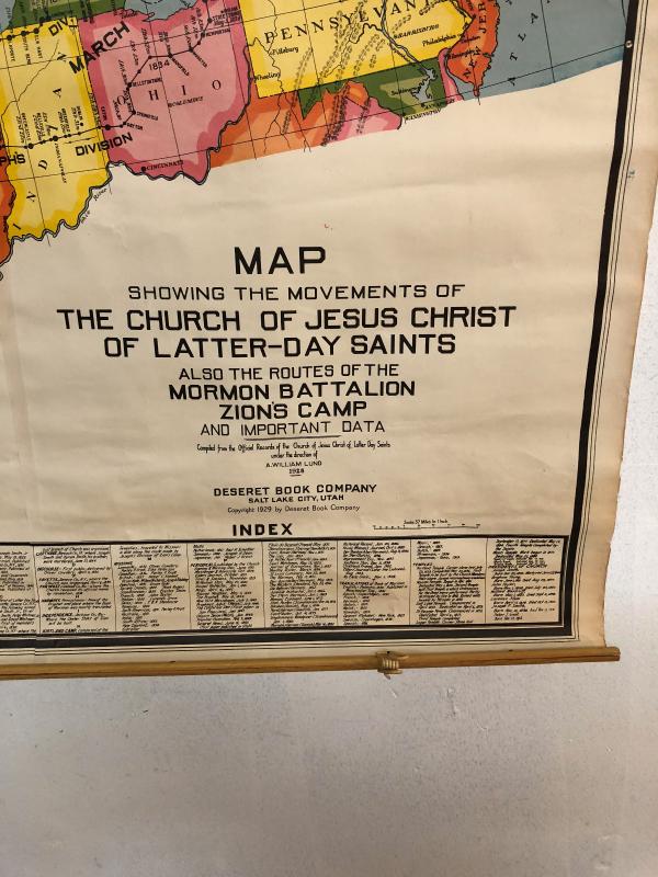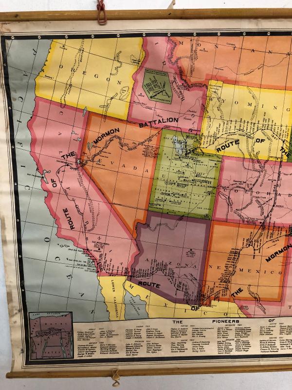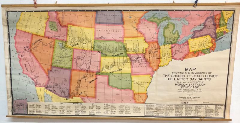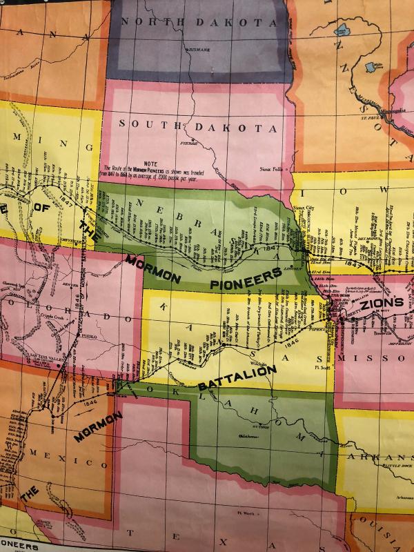 Colorful map of the LDS migration to the Salt lake valley as well as the movement of the Mormon Battalion. Measures 58" by 18"