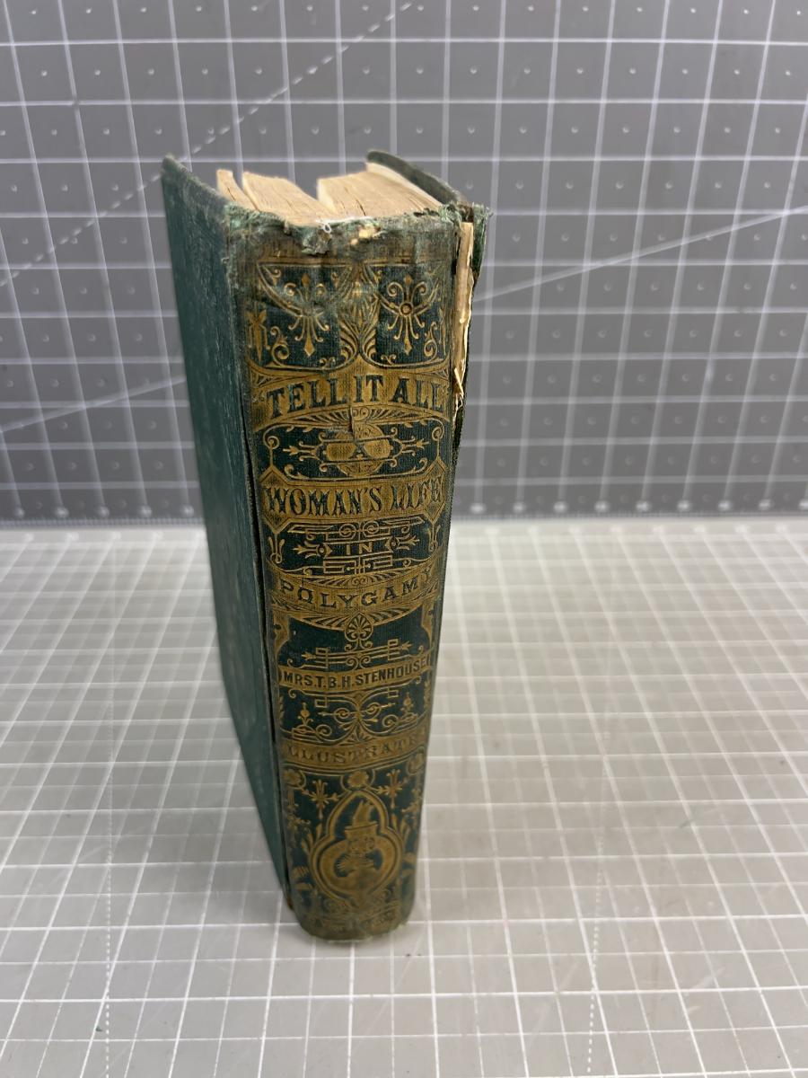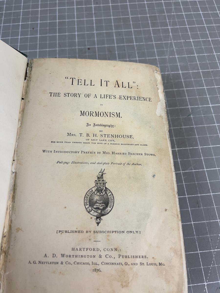 Tell It All: The story of a life's experience in Mormonism...an autobiography...In its day quite a sensational expose of Mormonism and a plea for women to be freed from the institution of multiple marriage...written by an Englishwoman Fanny Stenhouse who arrived in Utah in 1857 with her hsband, newspaperman T.B.H. Stenhouse...a missionary and elder of the Mormon Church and a practicing polygamist...after twenty years of marriage she wrote her unvarnished "true history of a real Mormon woman"...A correspondent of Mrs. Harriet Beecher Stowe("Uncle Tom's Cabin") who wrote the sympathetic preface...Gilt title..some cover wear..beginning of binding seapration and foxing througout on this 1876 first edition published by A.D. Worthington & Co. of Hartford, Conn...Illustrations by the author...Complete 523pp.