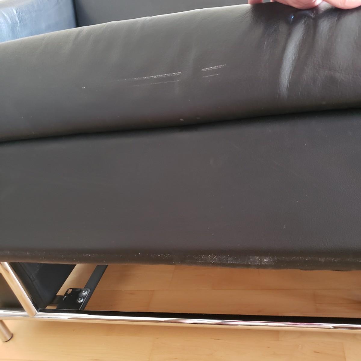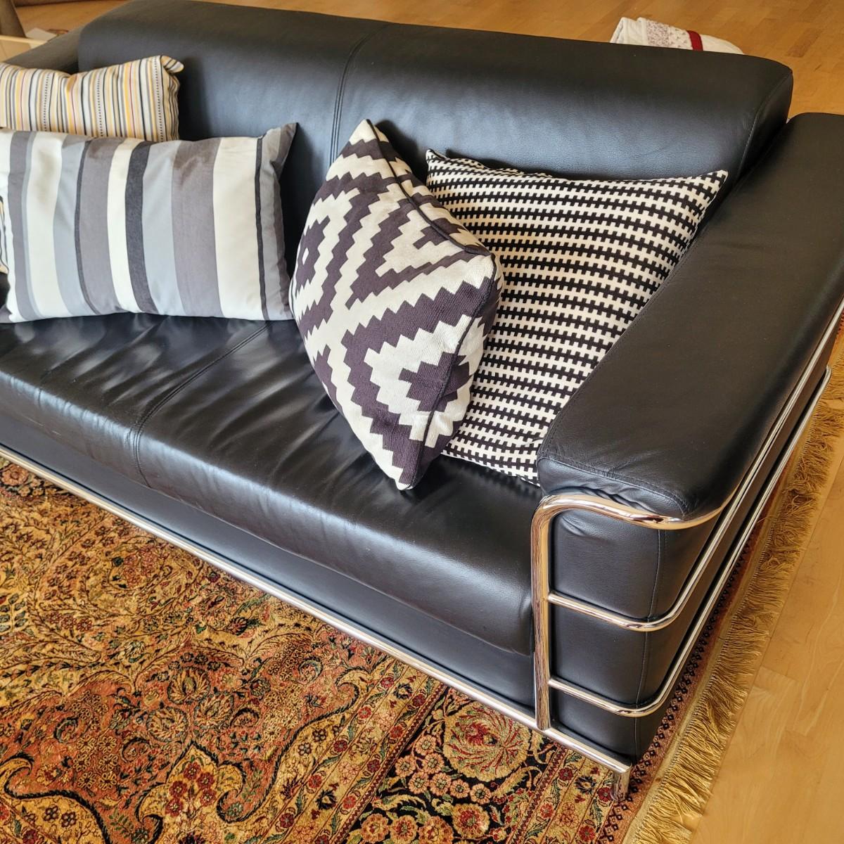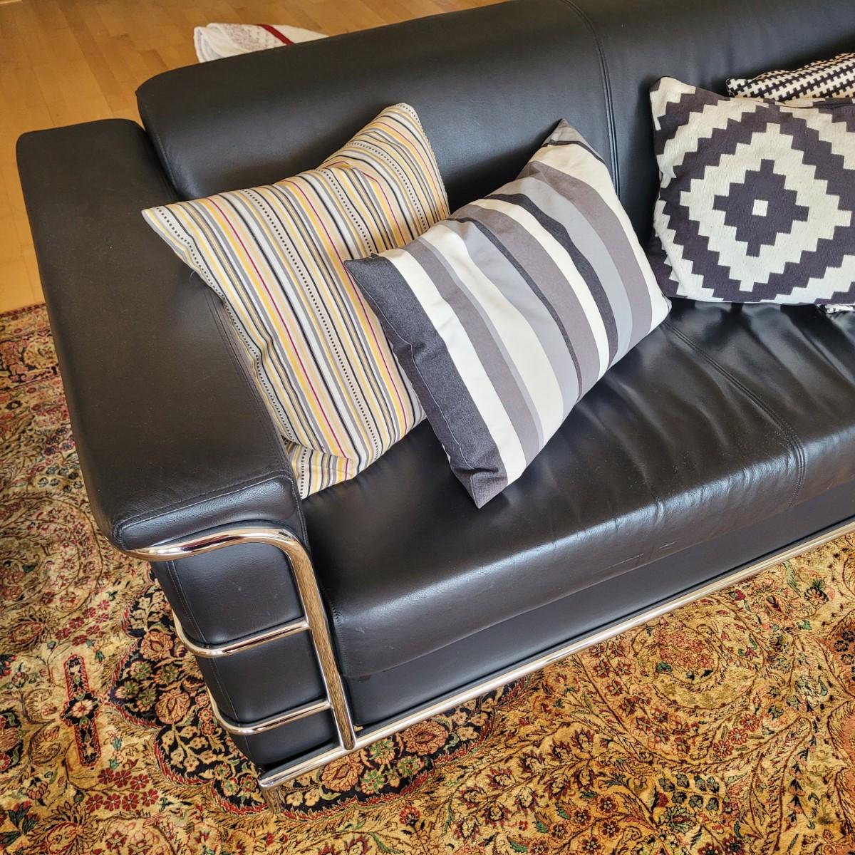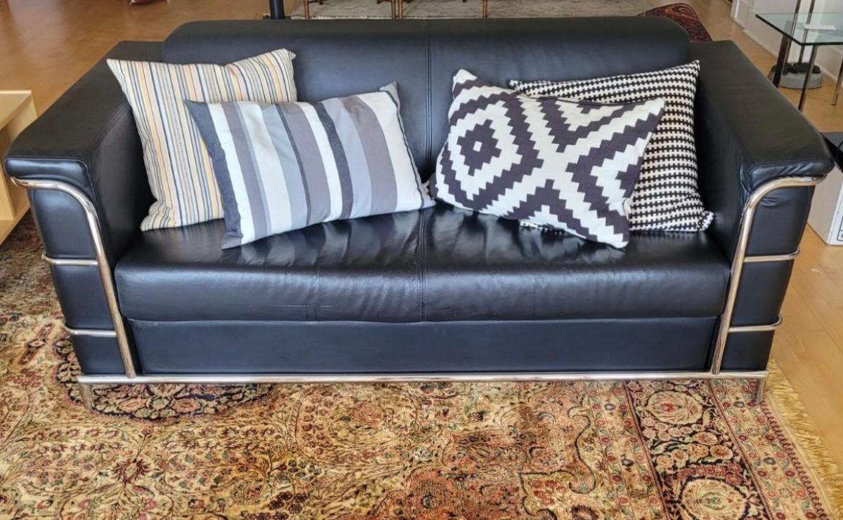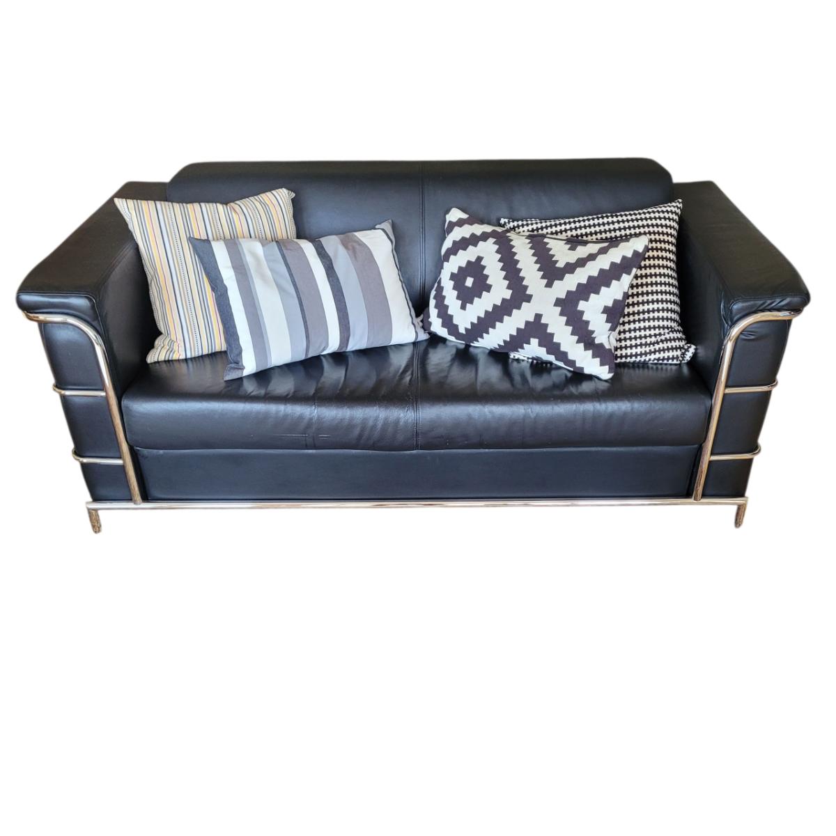 This lot includes a black leather couch with a chrome frame and four throw pillows. The couch is made from black bonded leather and features chrome tubing throughout. The bottom cushion is connected to the entire bottom, see last two pictures. The pillows match the couch, but are unique in design. The couch measures 72" x 35" x 26"H with a seat height of 16".