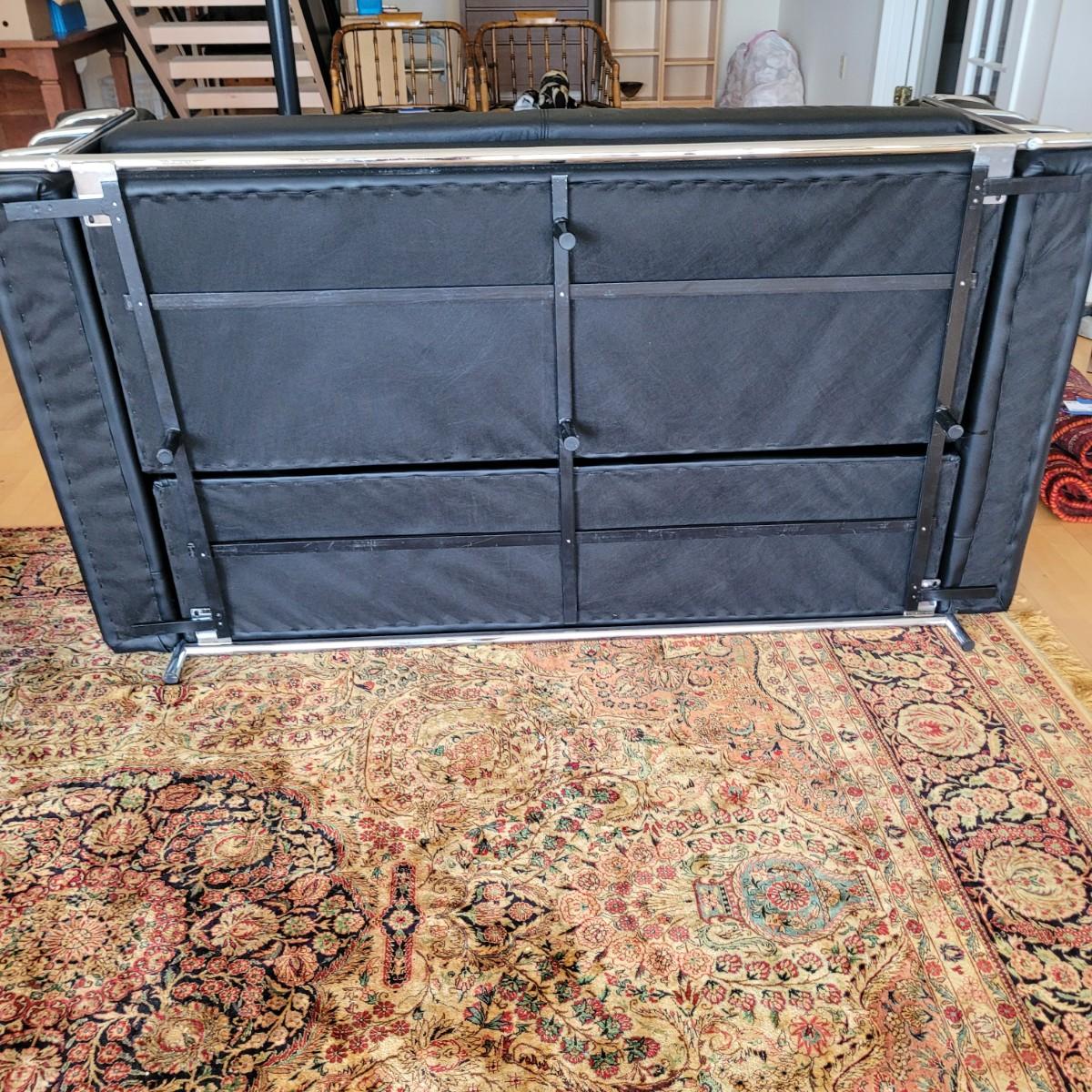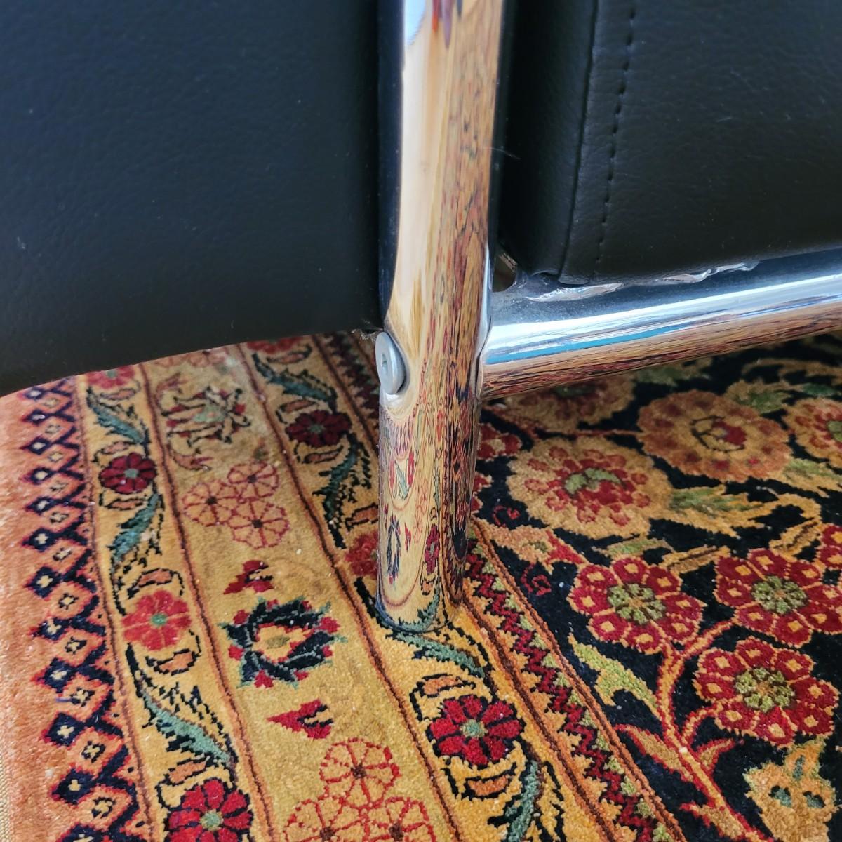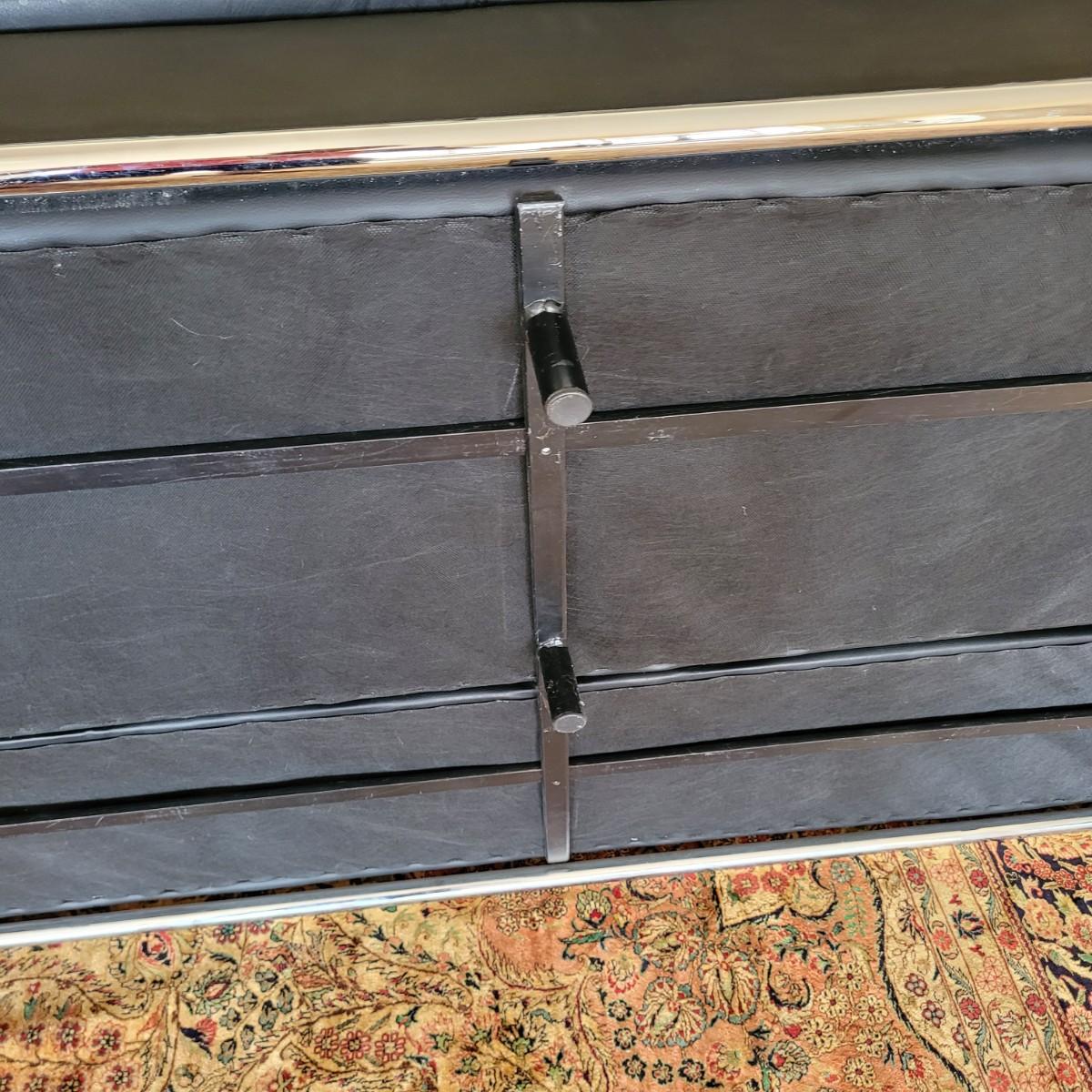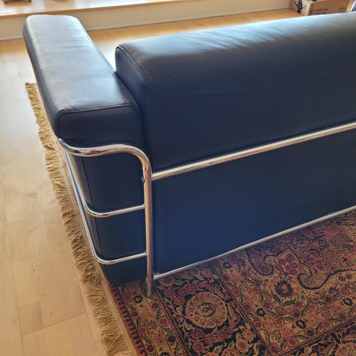 This lot includes a black leather couch with a chrome frame and four throw pillows. The couch is made from black bonded leather and features chrome tubing throughout. The bottom cushion is connected to the entire bottom, see last two pictures. The pillows match the couch, but are unique in design. The couch measures 72" x 35" x 26"H with a seat height of 16".
