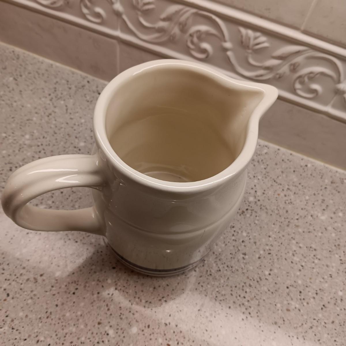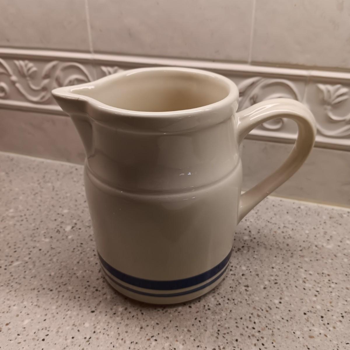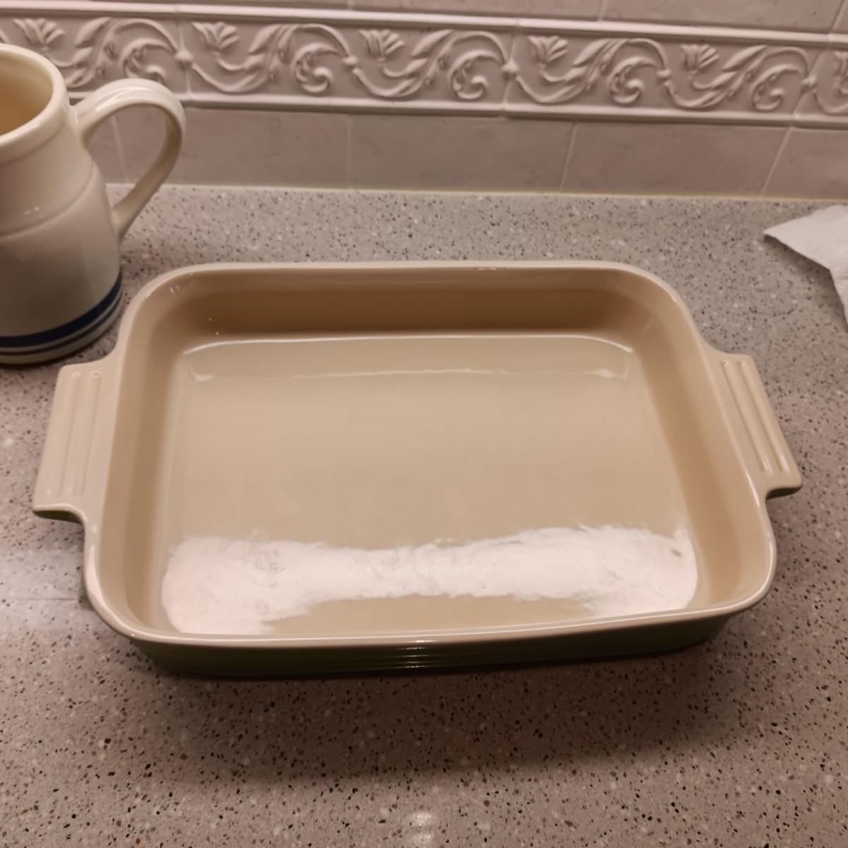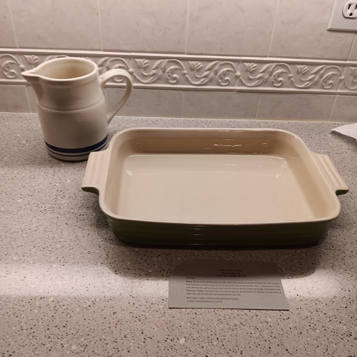 LE CREUSET BAKING DISH AND A SMALL CLAY PITCHER