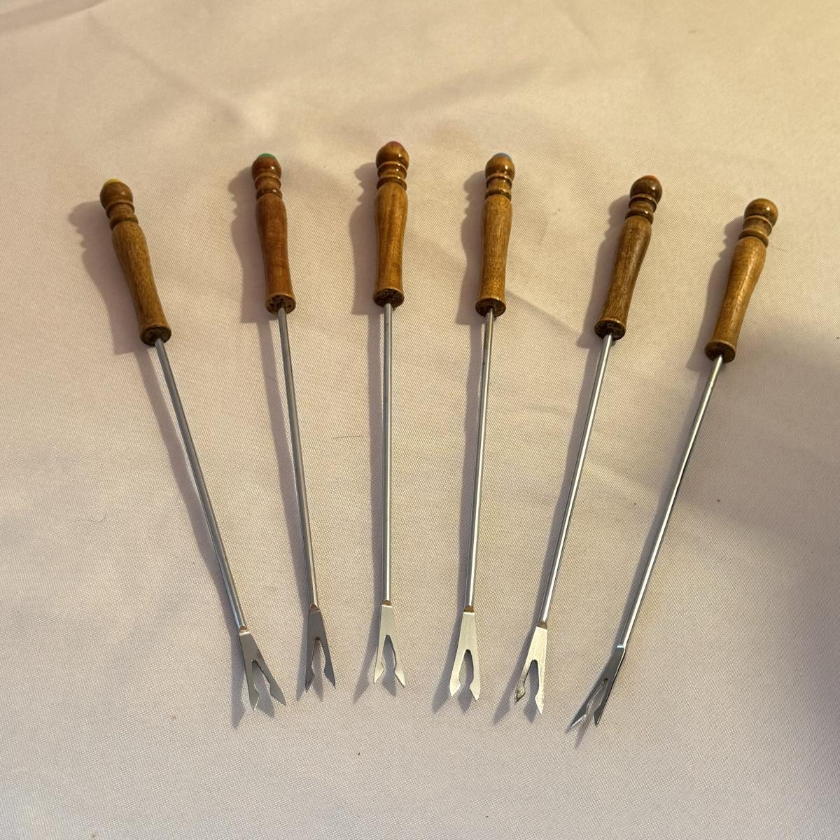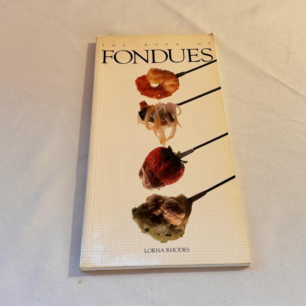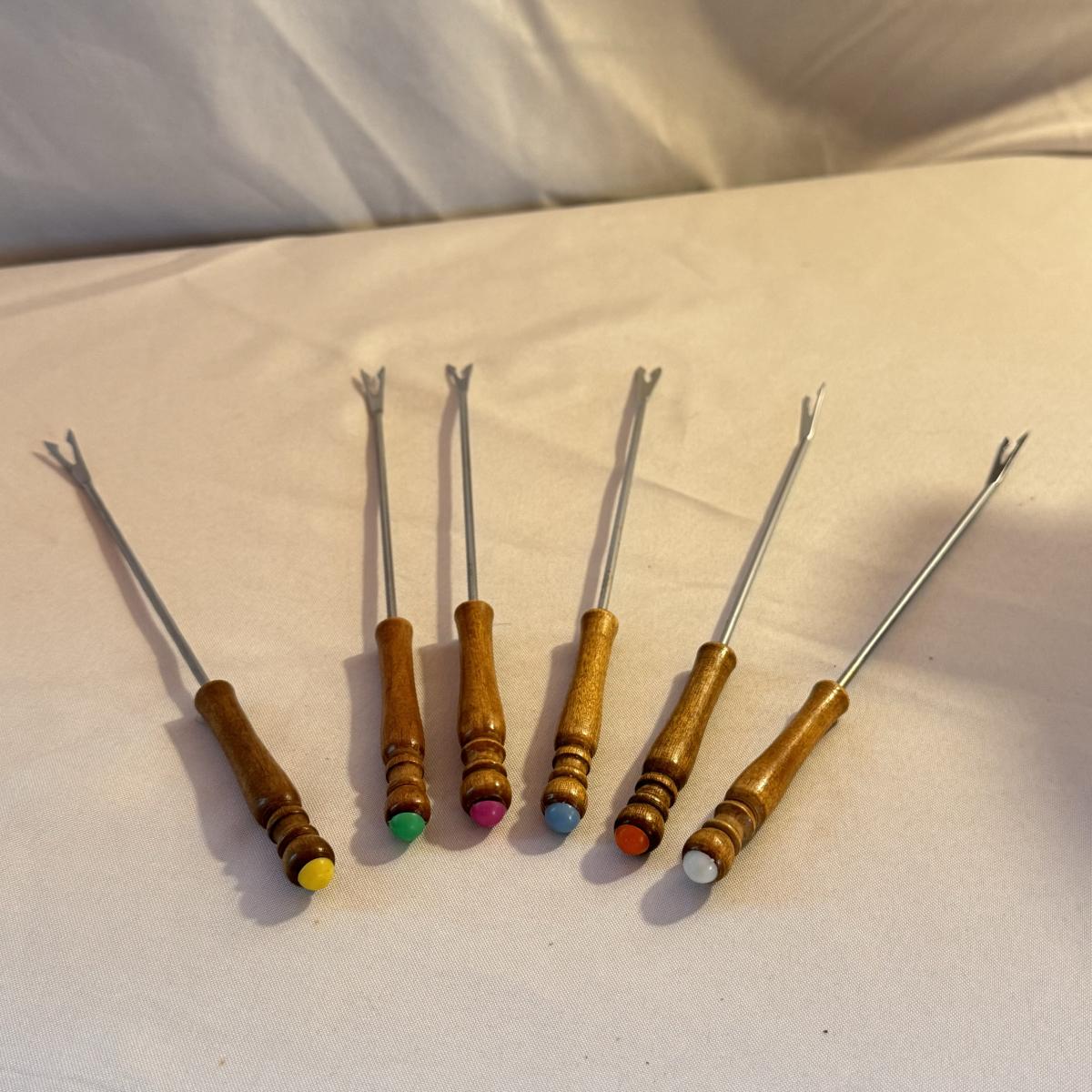 This lot includes one Le Creuset cast iron fondue set, four metal skewers with white plastic handles, six metal skewers with wooden handles, and one fondue cookbook. Shipping available.