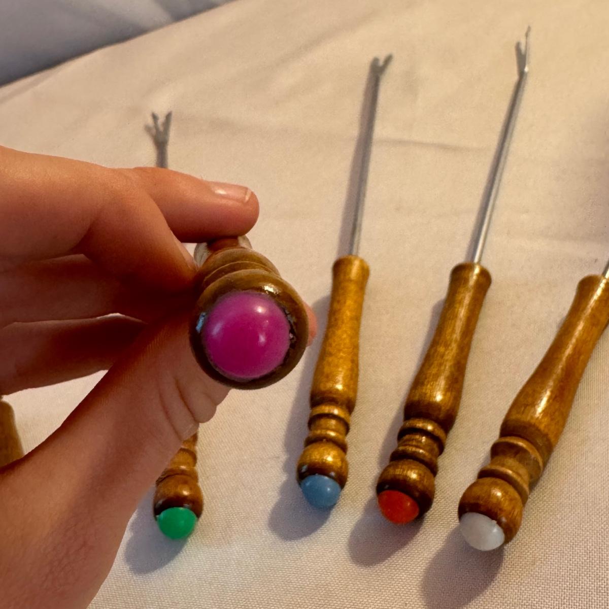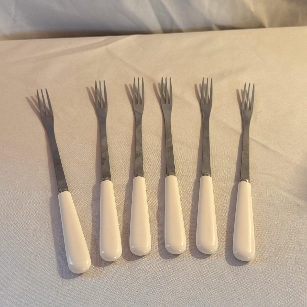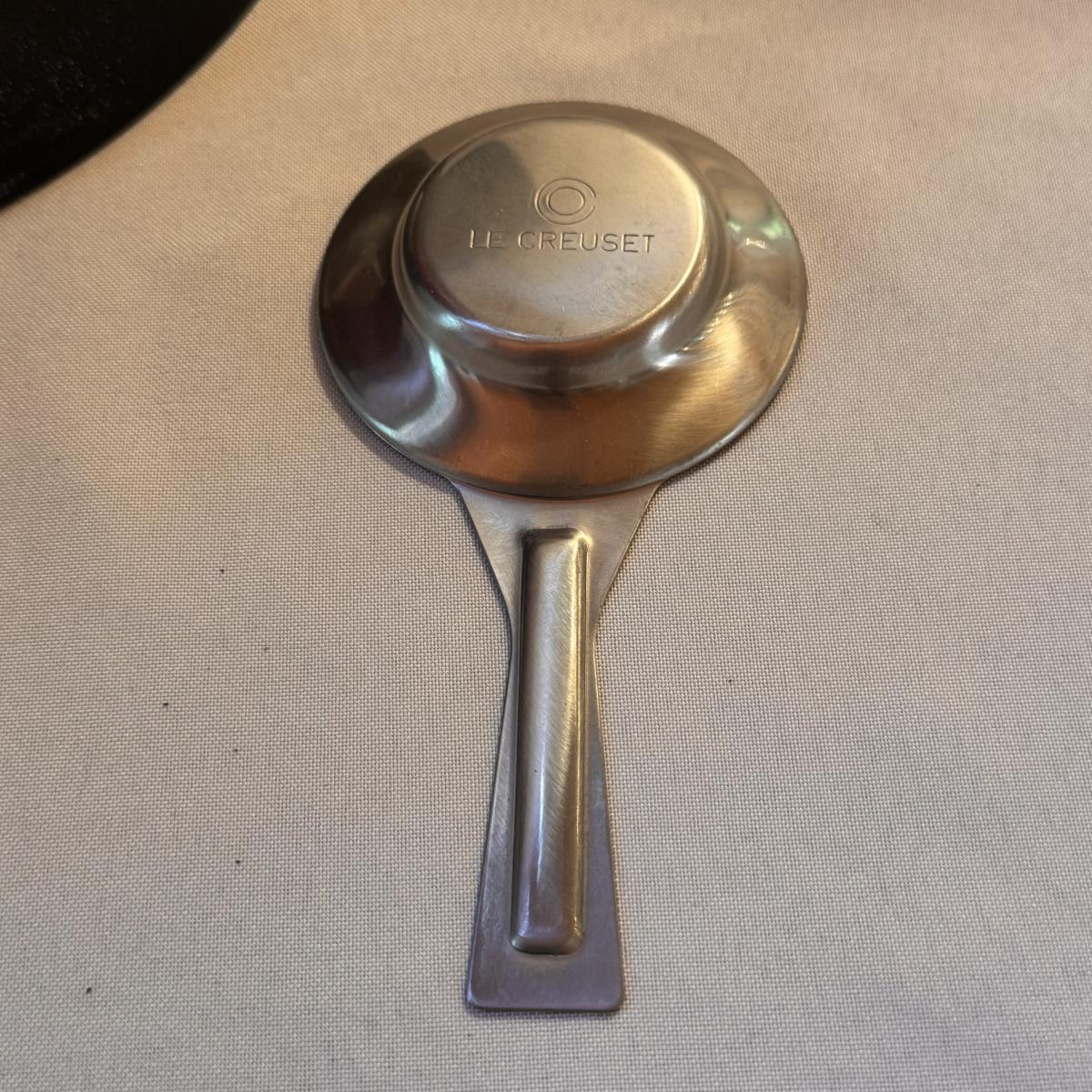 This lot includes one Le Creuset cast iron fondue set, four metal skewers with white plastic handles, six metal skewers with wooden handles, and one fondue cookbook. Shipping available.