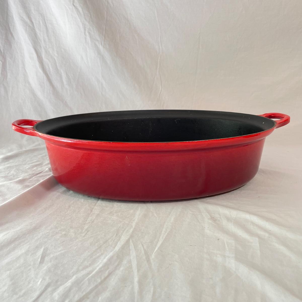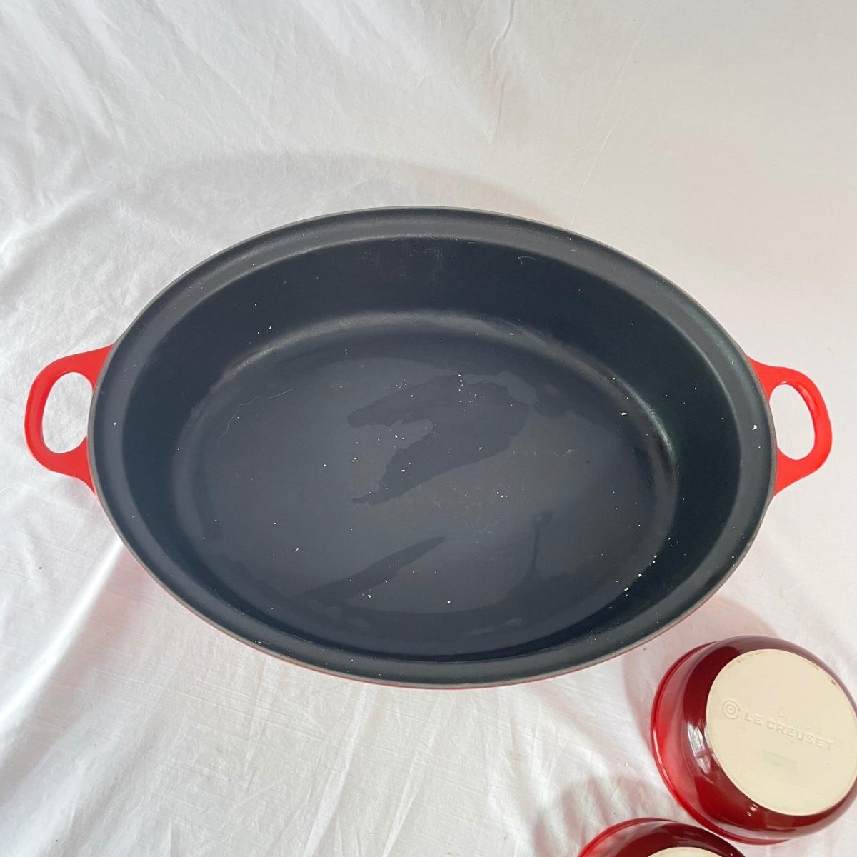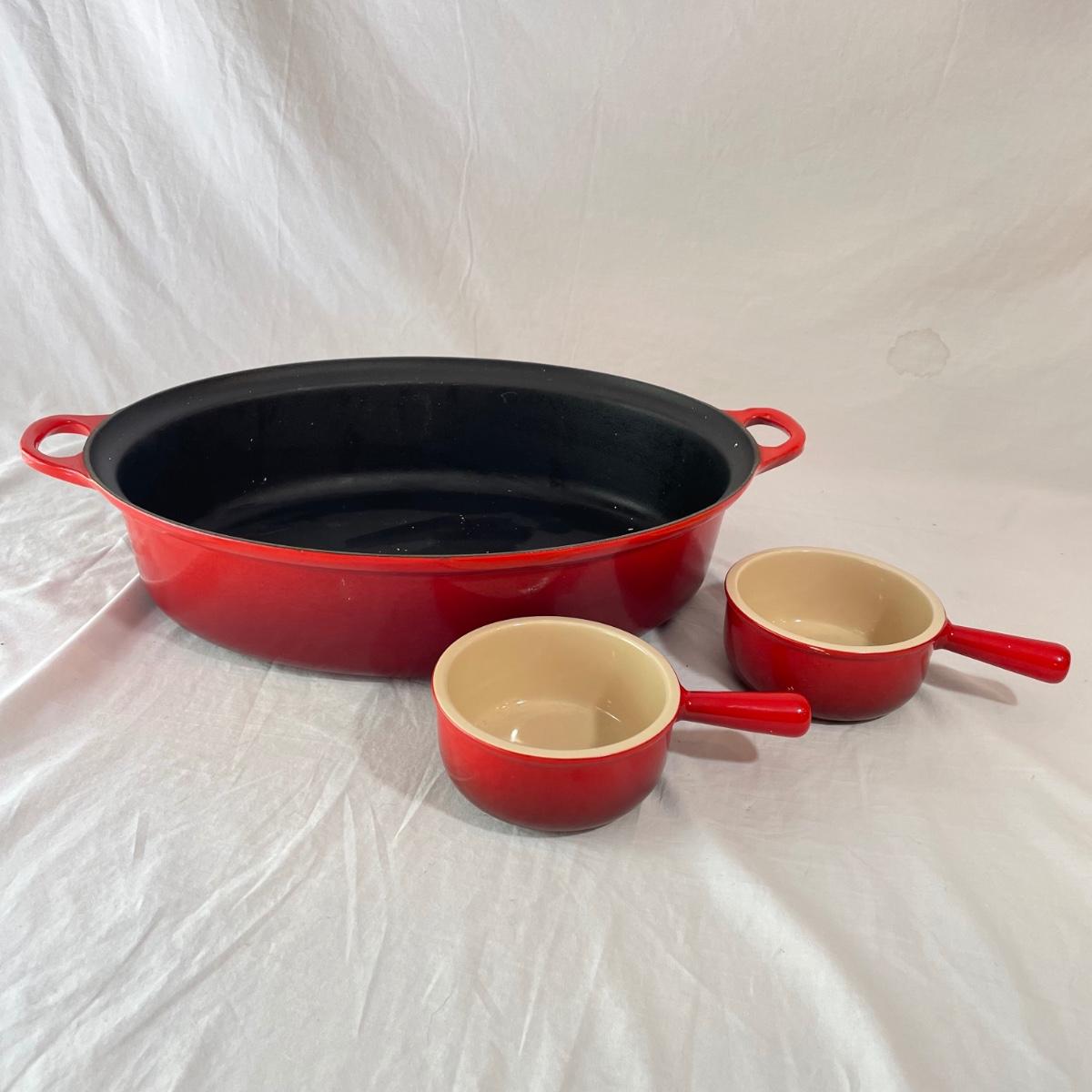 Large #45 Le Creuset roasting pan in the signature red hue and two soup crocks with handles. Roasting pan is 17” x 13” x 4”H. See images. Shipping available.