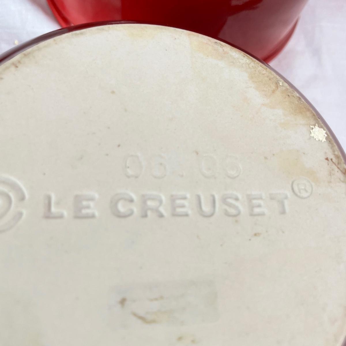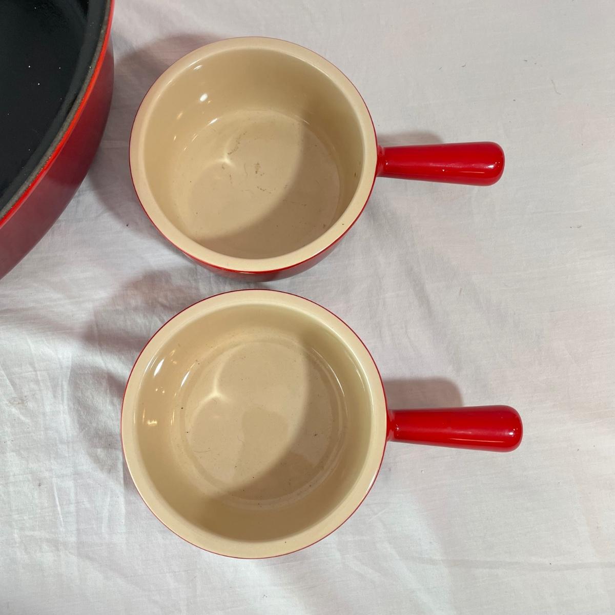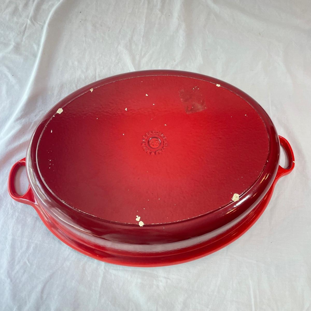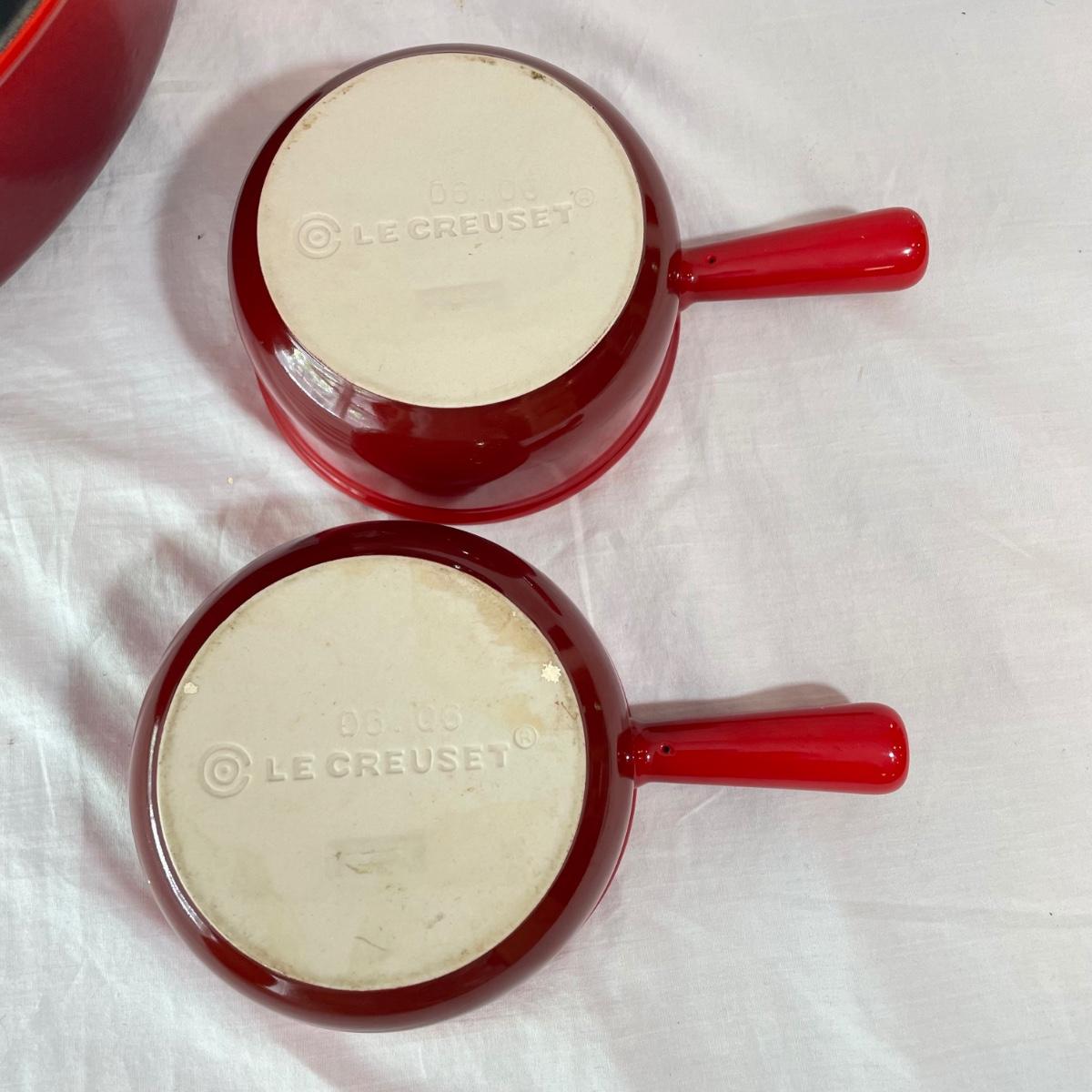 Large #45 Le Creuset roasting pan in the signature red hue and two soup crocks with handles. Roasting pan is 17” x 13” x 4”H. See images. Shipping available.