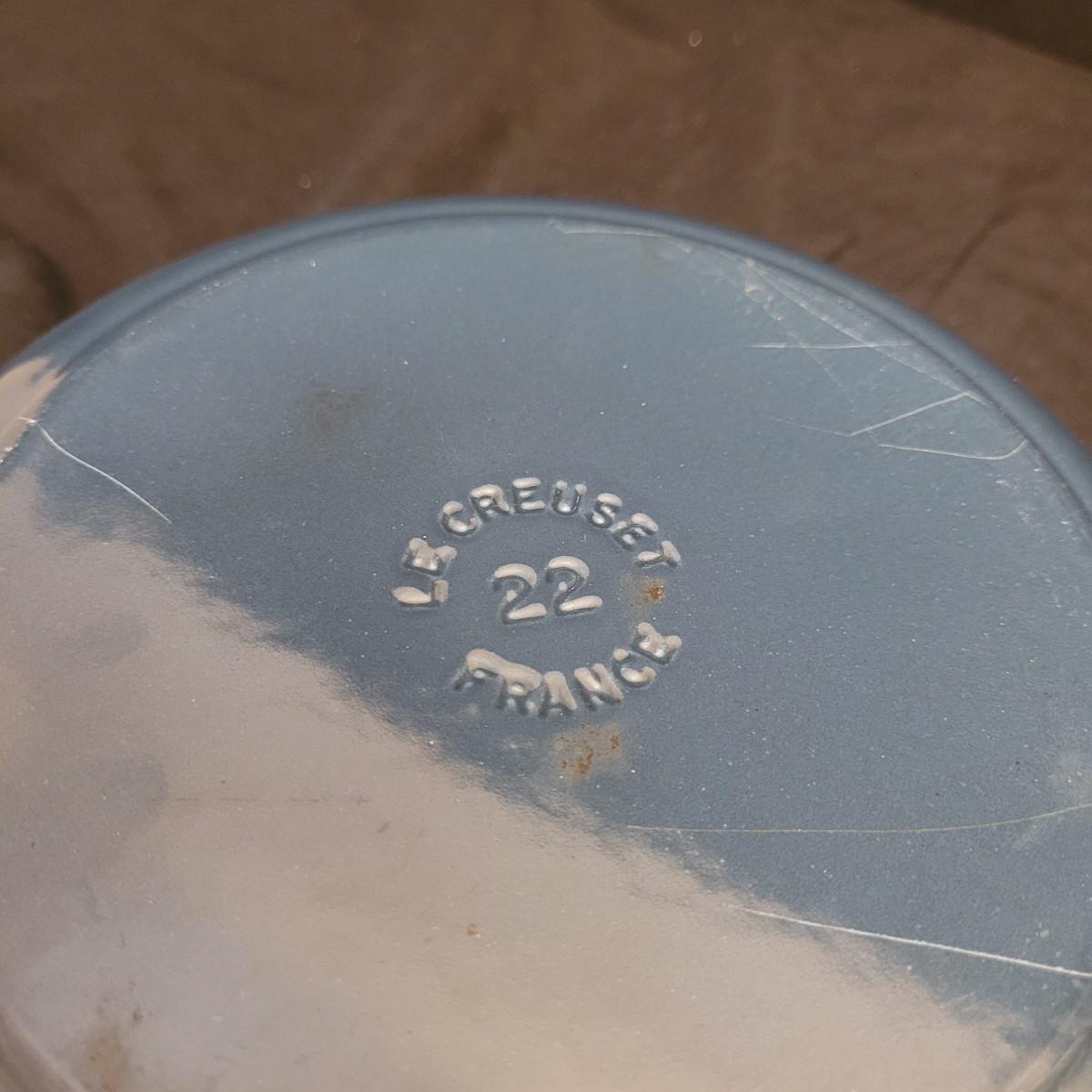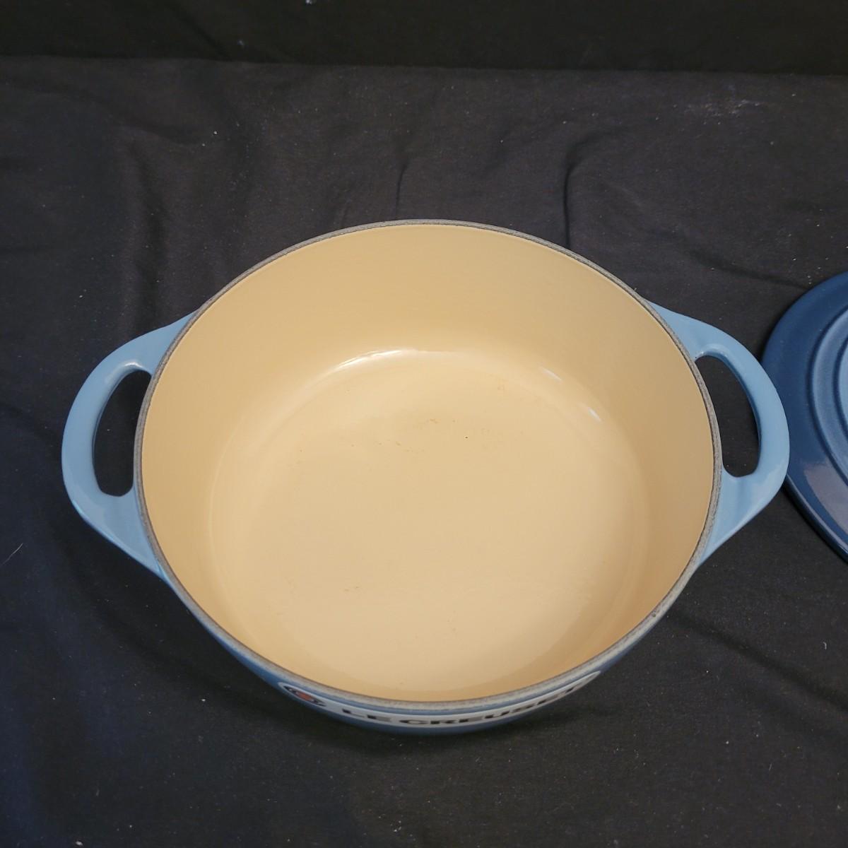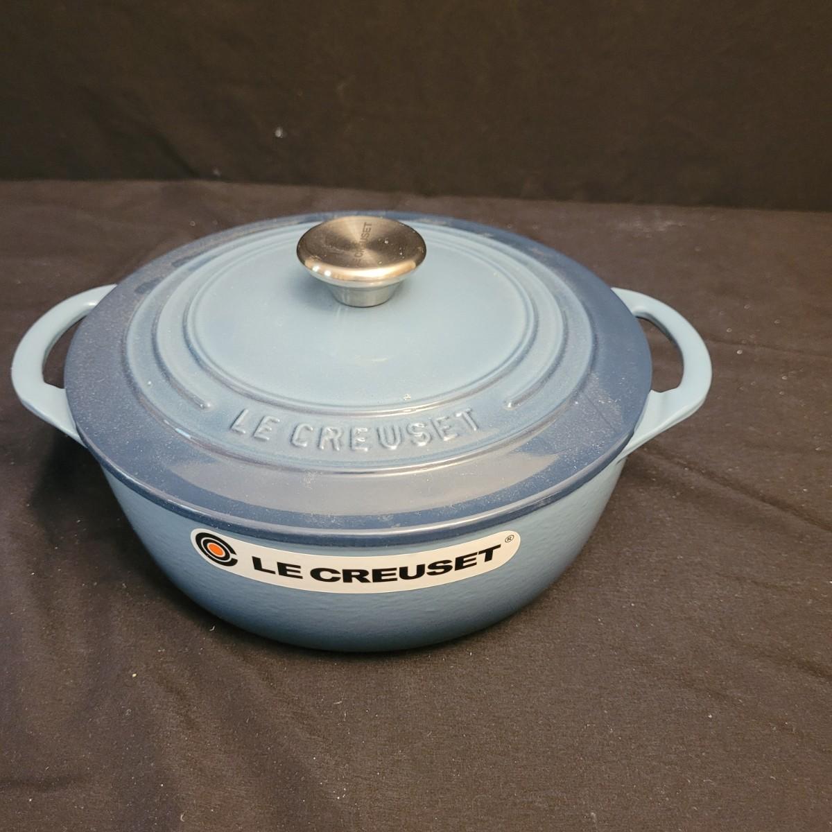 This lovely blue Le Creuset dutch oven measures approximately 9”D x 3”H. Shipping available.