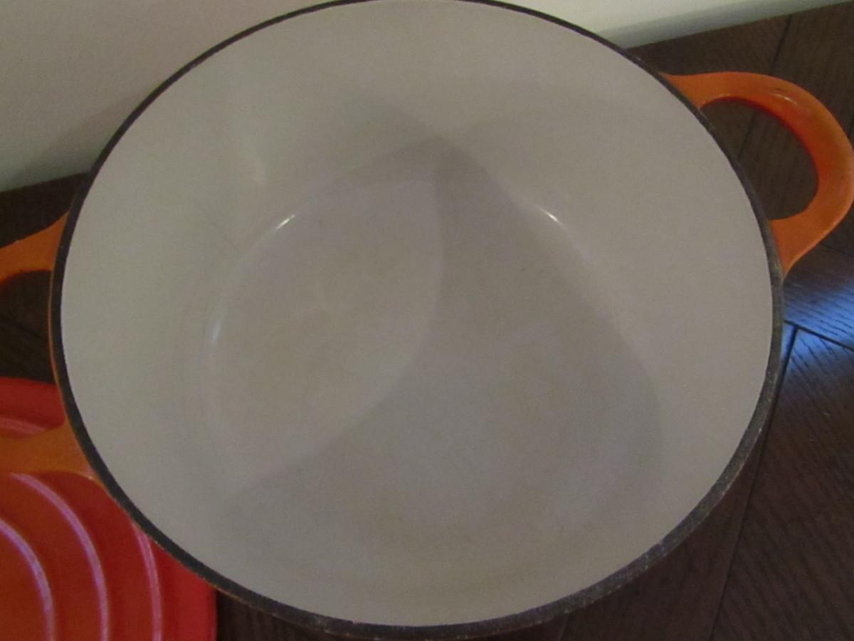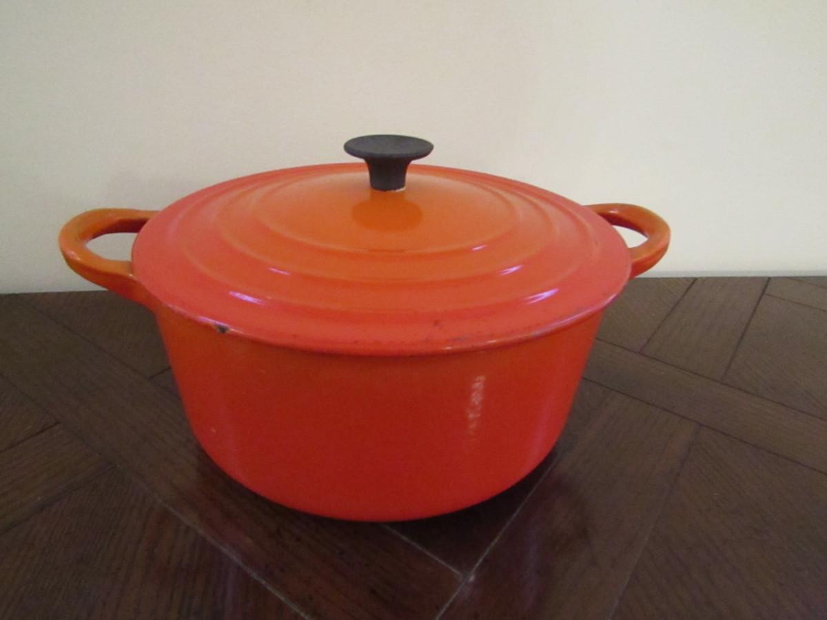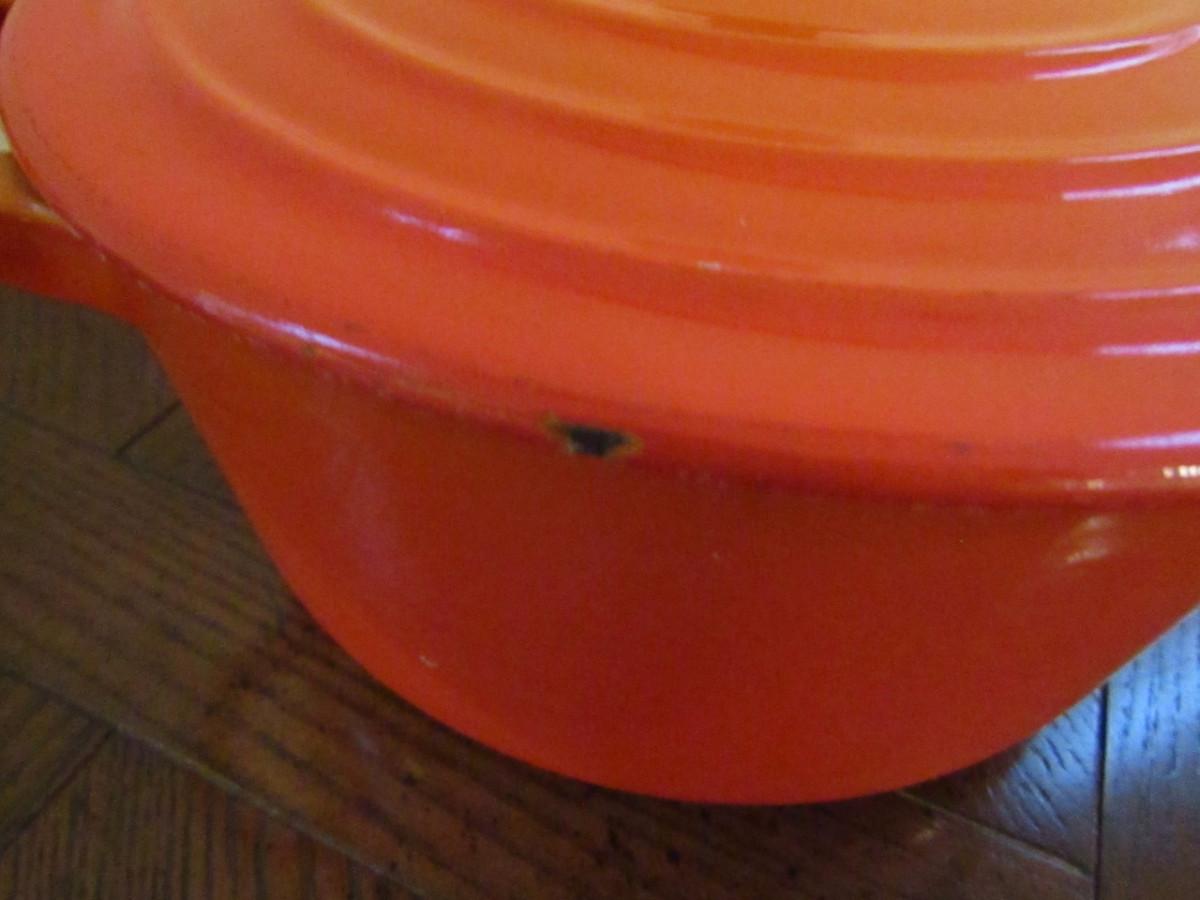 Le Creuset Covered Dutch Oven Size B- Approx 7 1/4" in Diameter. Please see all pictures- some chipping of enamel.