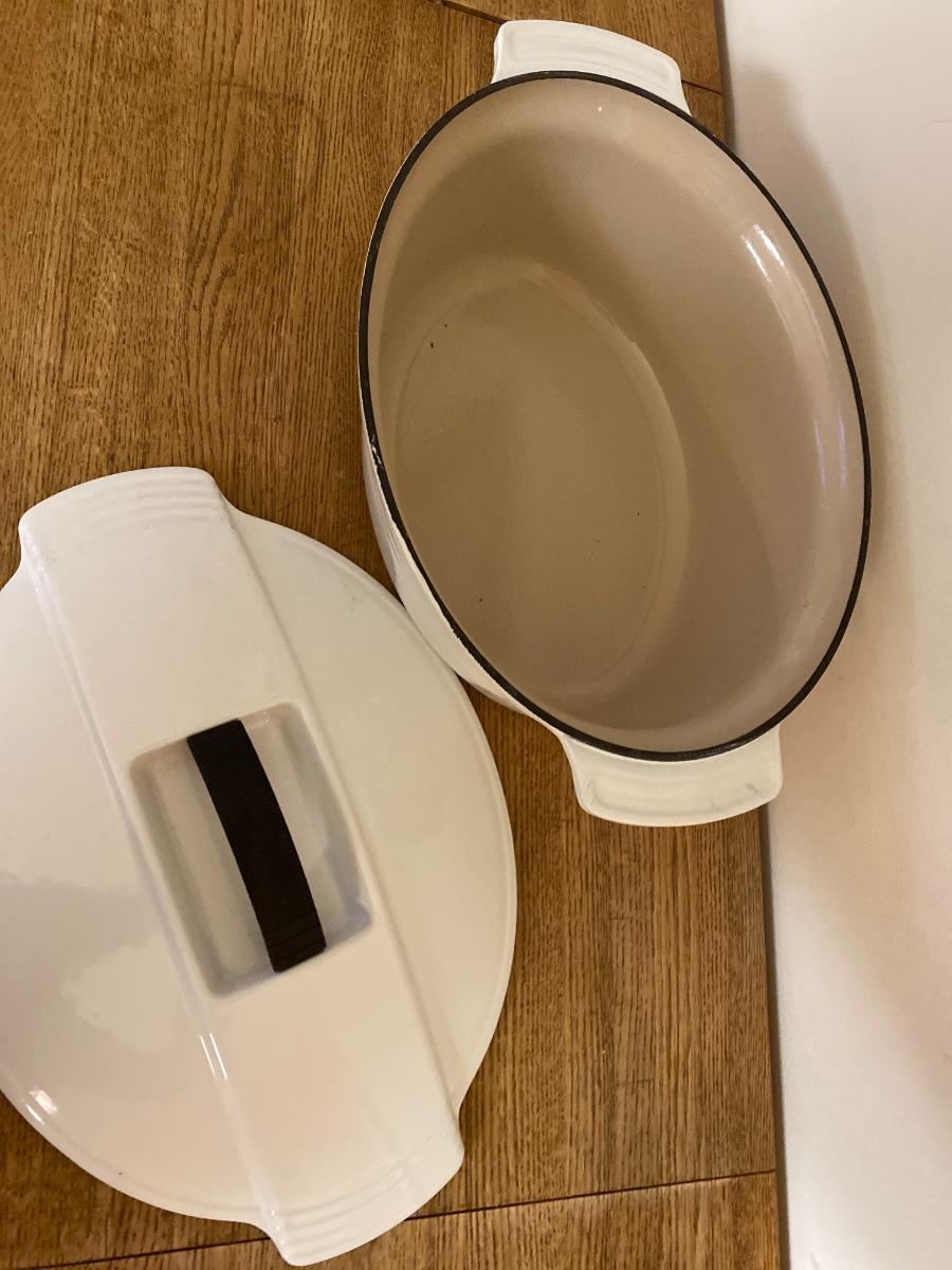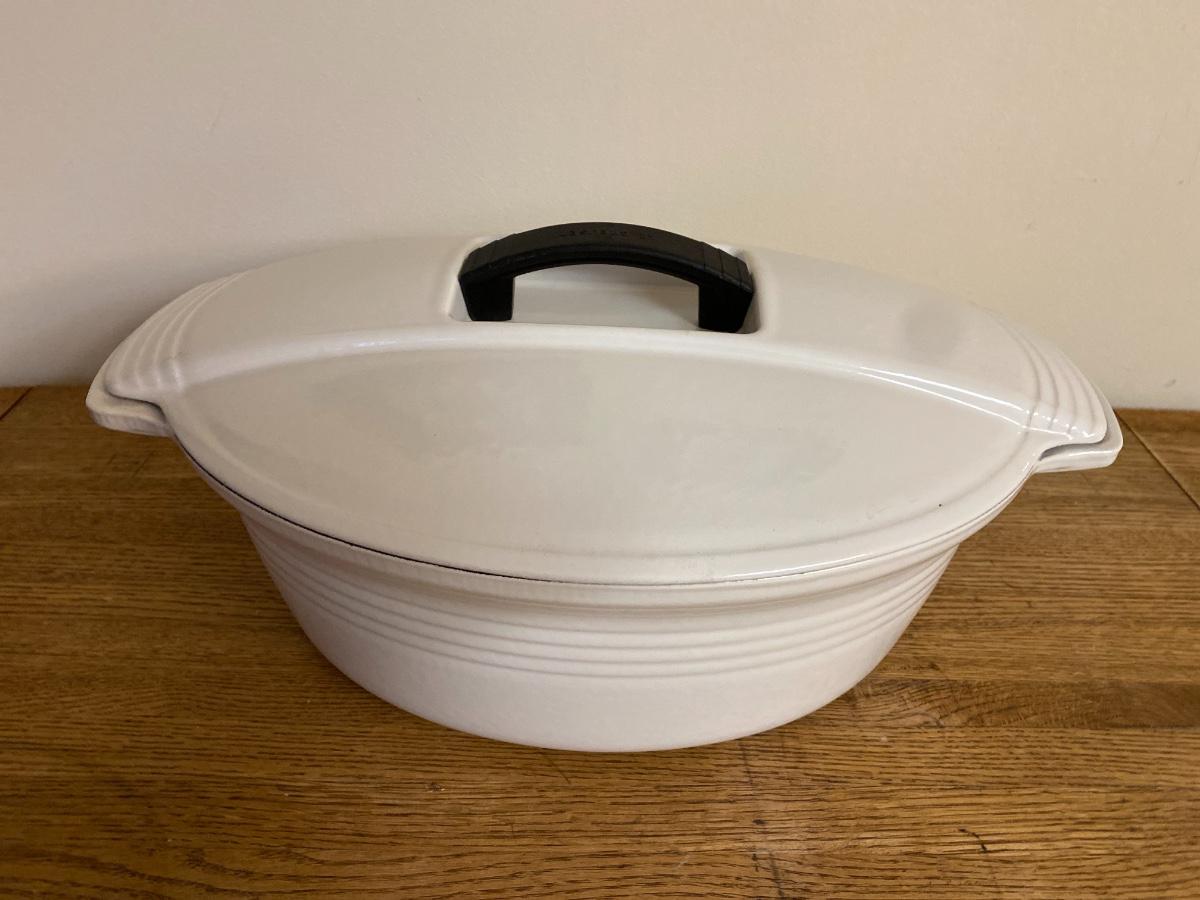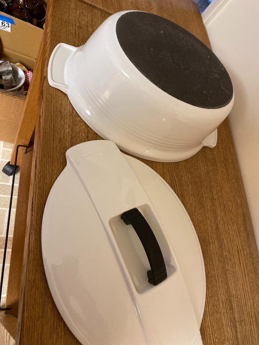 Large white pot with lid. Measures 15”w x 11”d x 6”h. On kitchen counter.