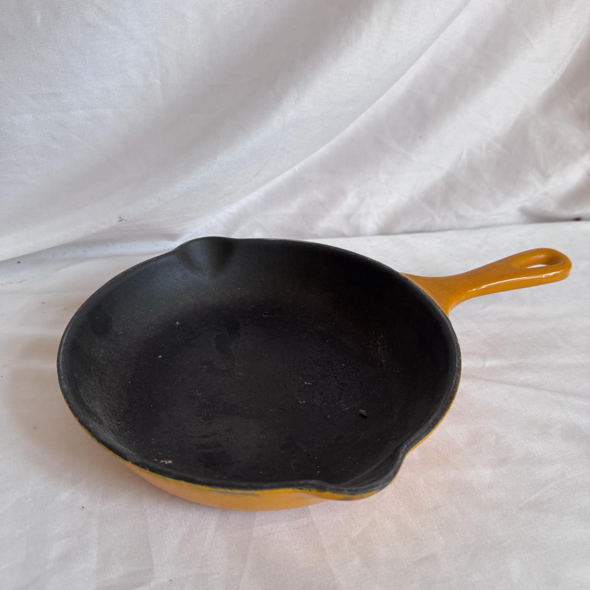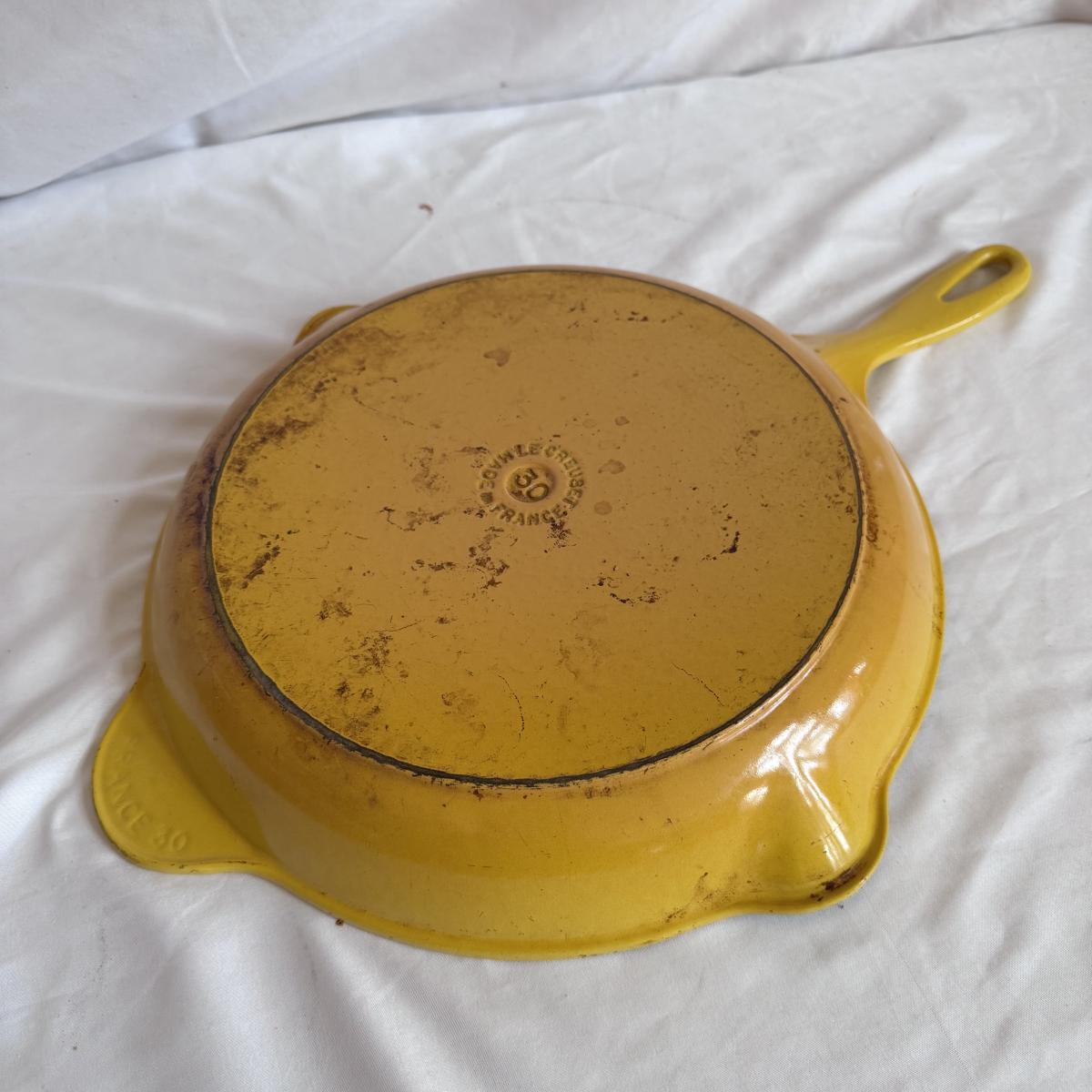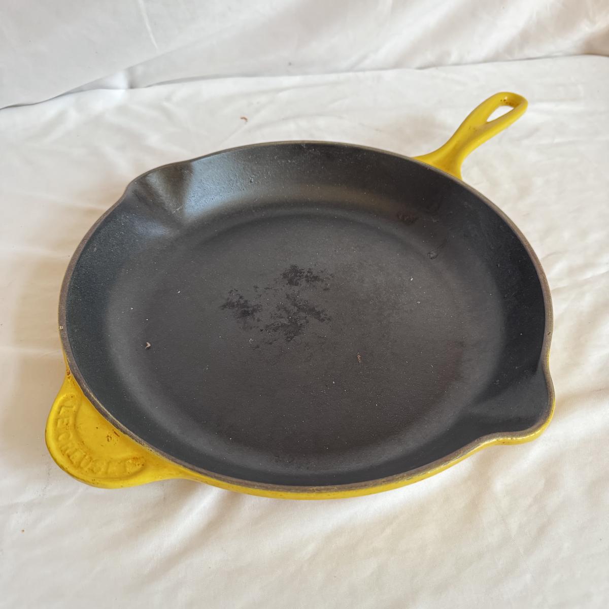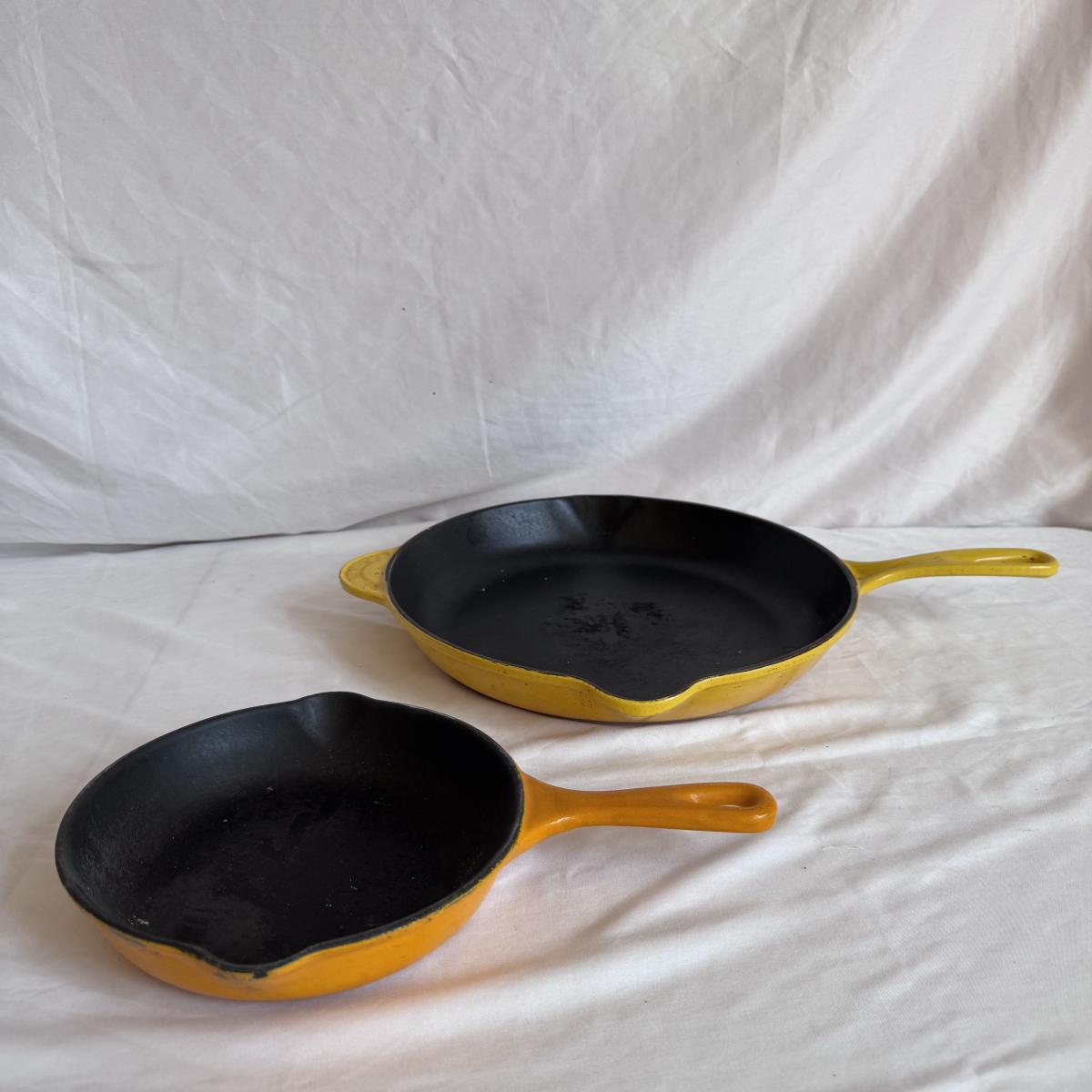 This lot includes two yellow Le Creuset enameled cast iron skillets. The smallest skillet measures 12” x 8” x 2”H. The largest measures 19” x 13.5” x 1.95”H. Shipping available.