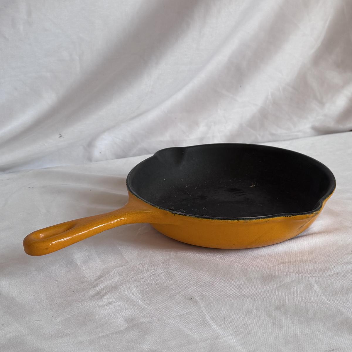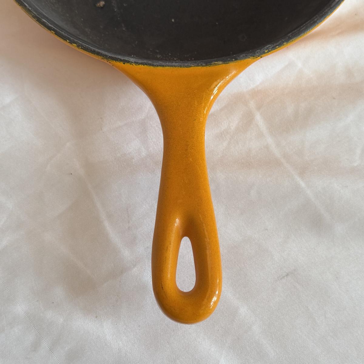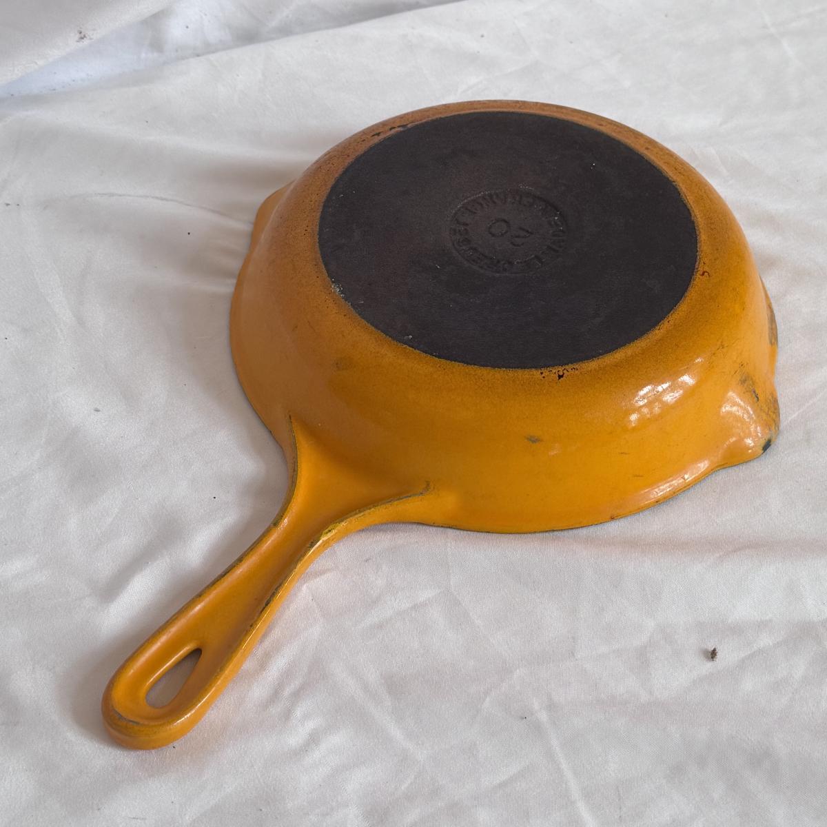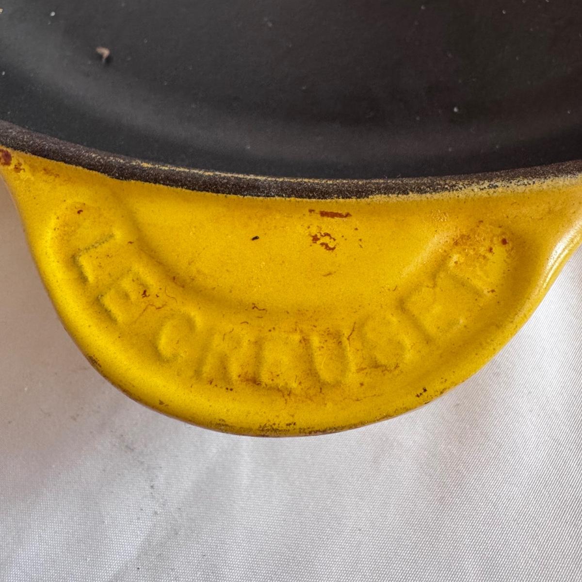 This lot includes two yellow Le Creuset enameled cast iron skillets. The smallest skillet measures 12” x 8” x 2”H. The largest measures 19” x 13.5” x 1.95”H. Shipping available.