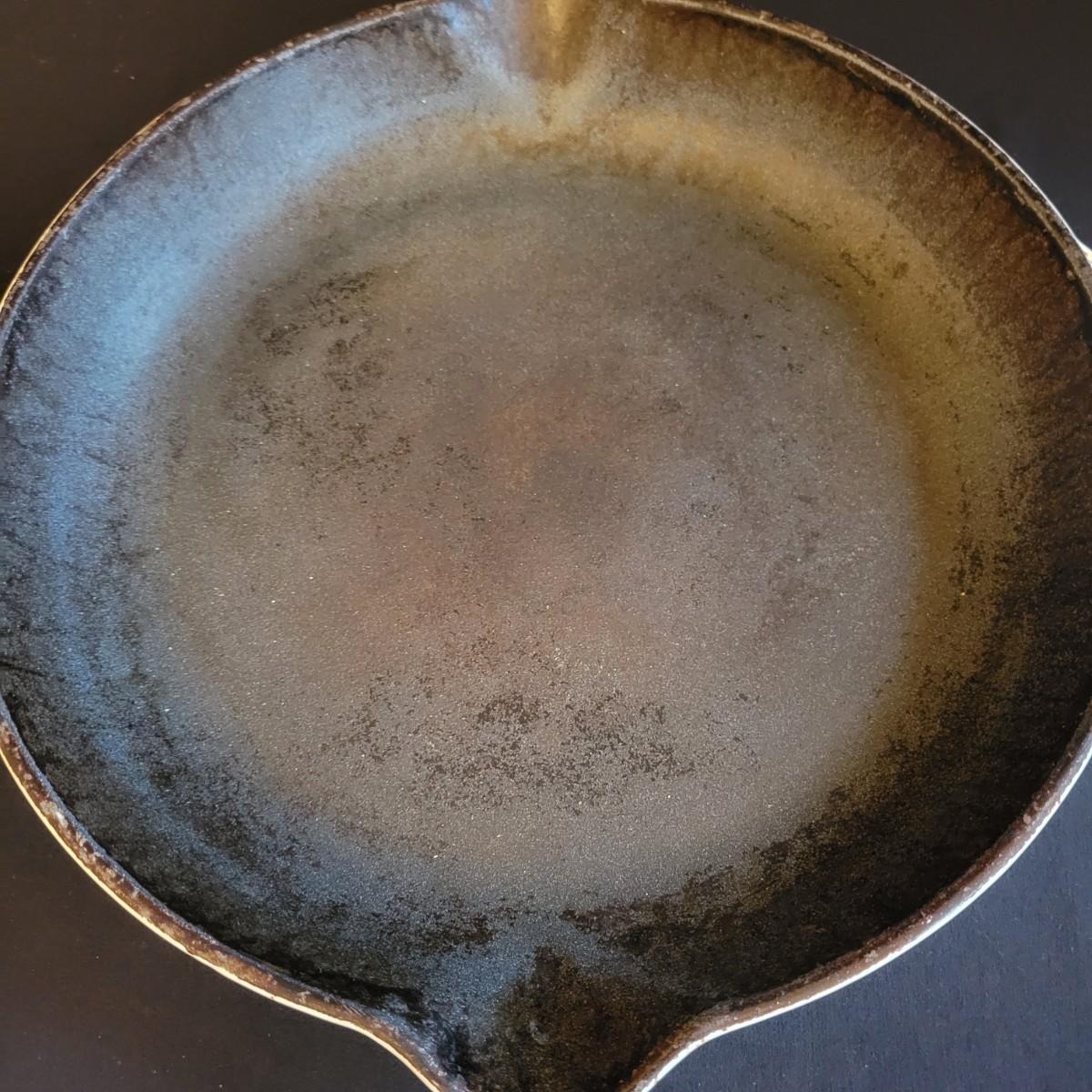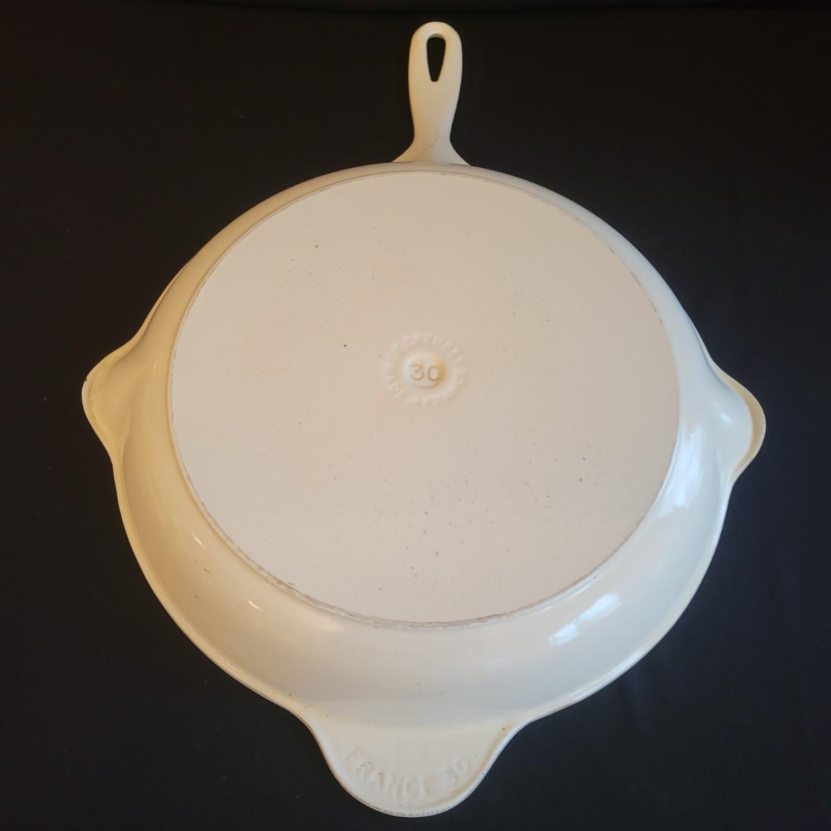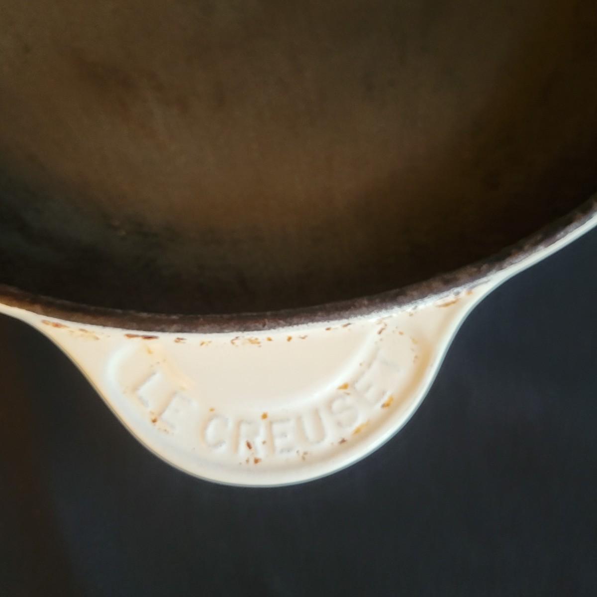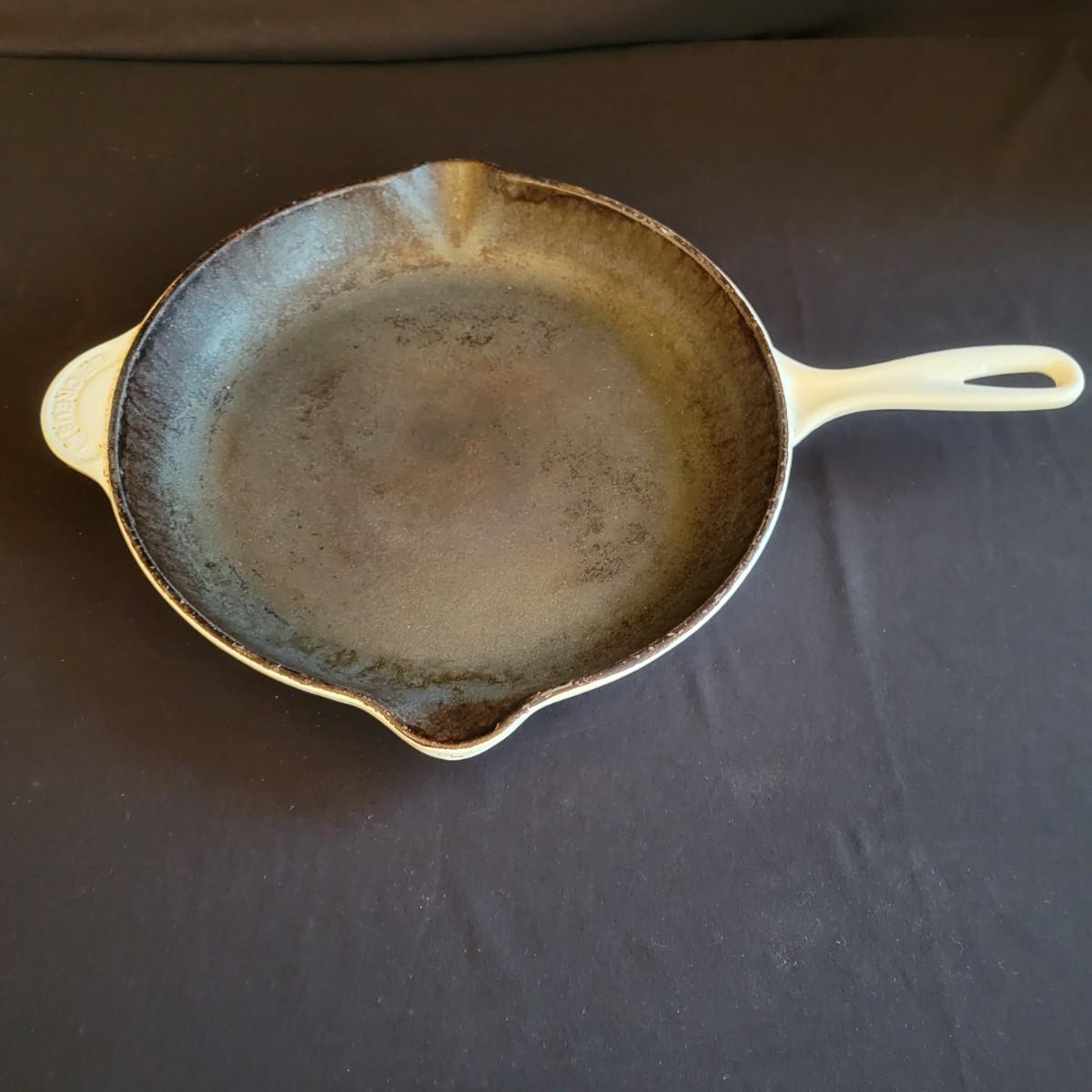 A Le Creuset enameled cast iron skill that shows some use. Skillet measures approximately 12.5"D x 2"D. Local pickup only