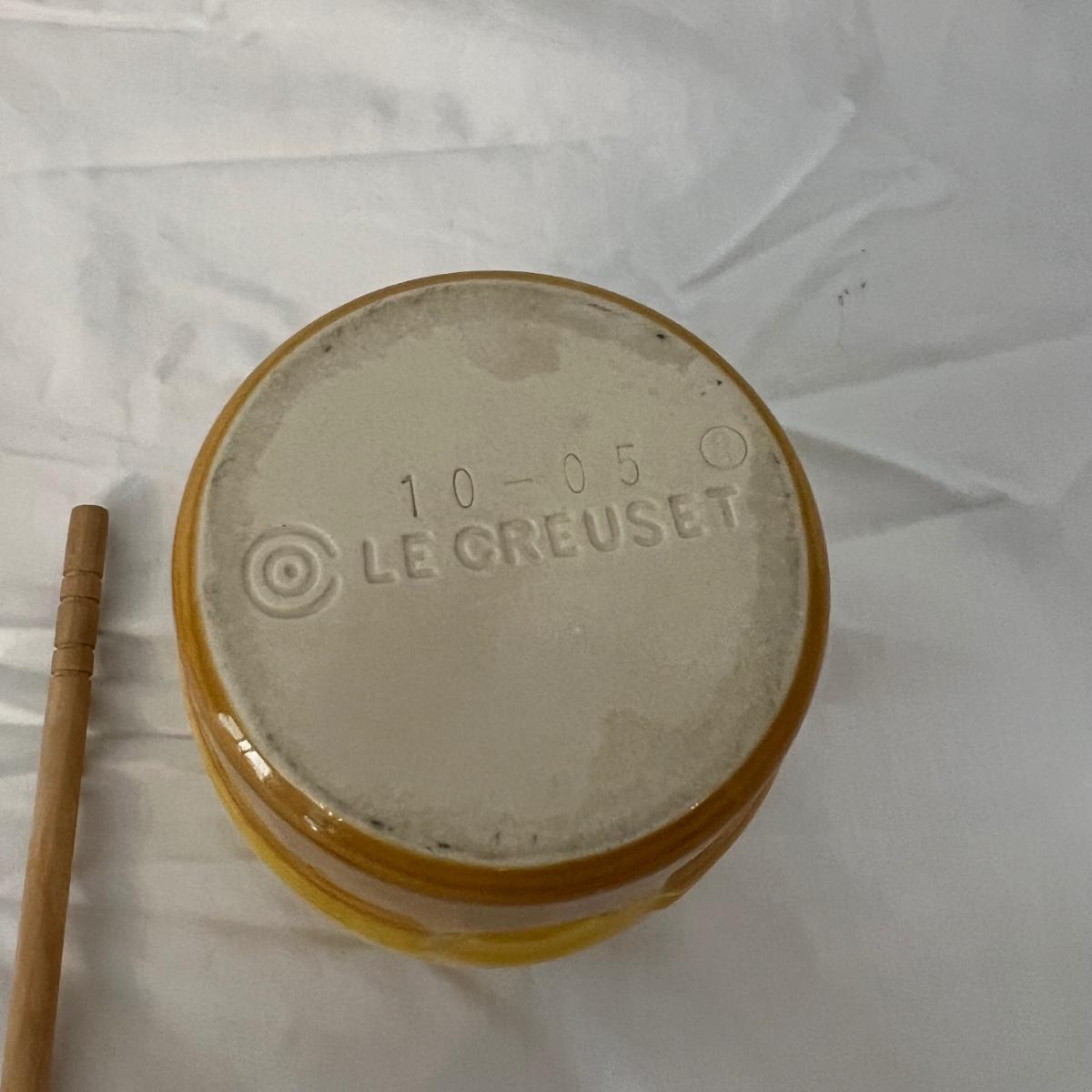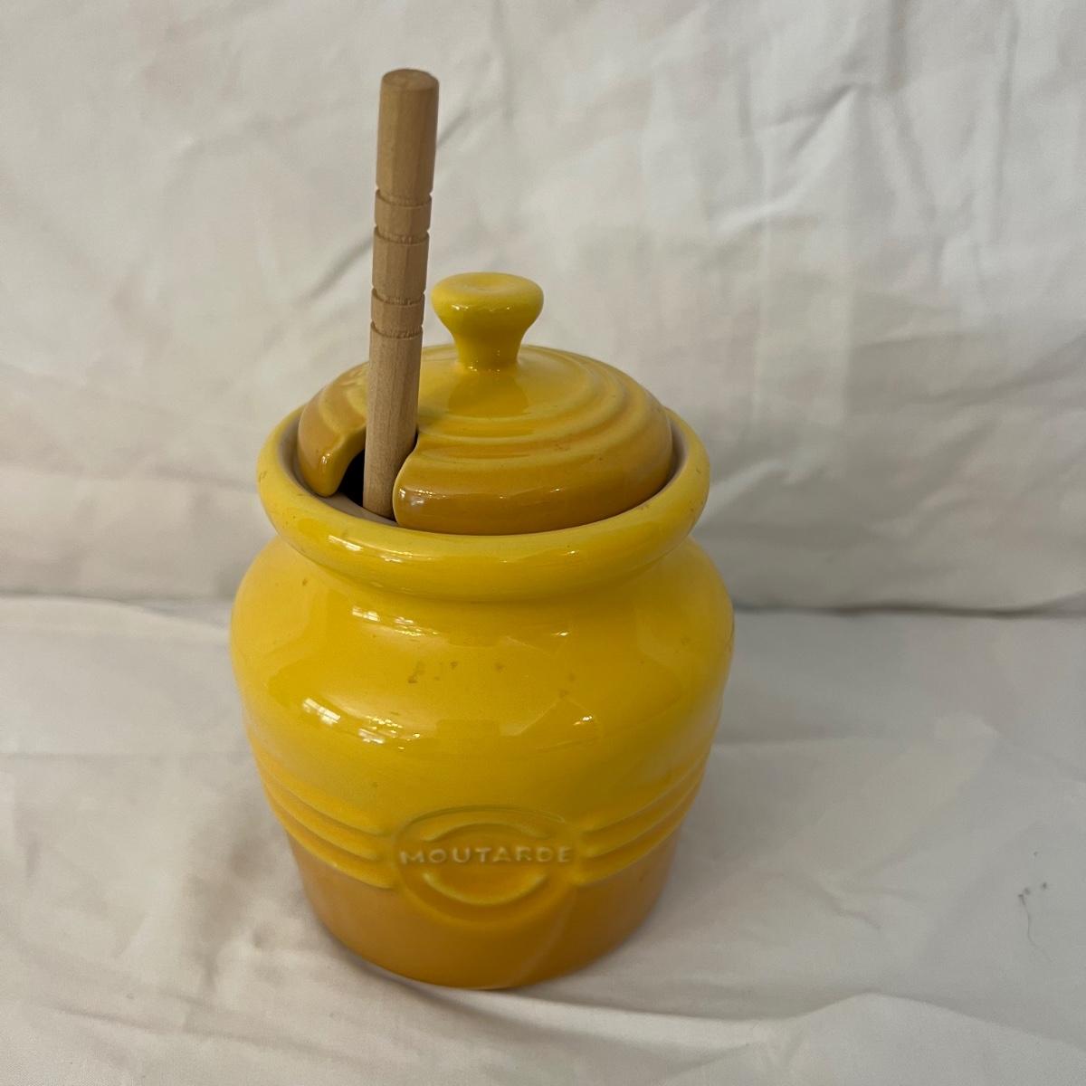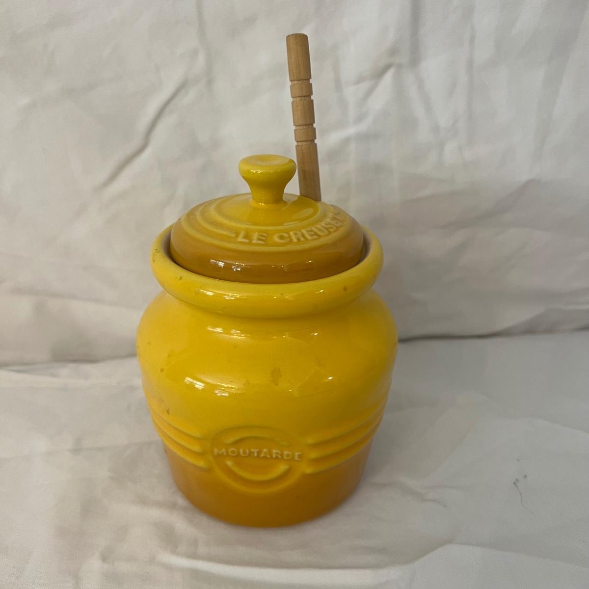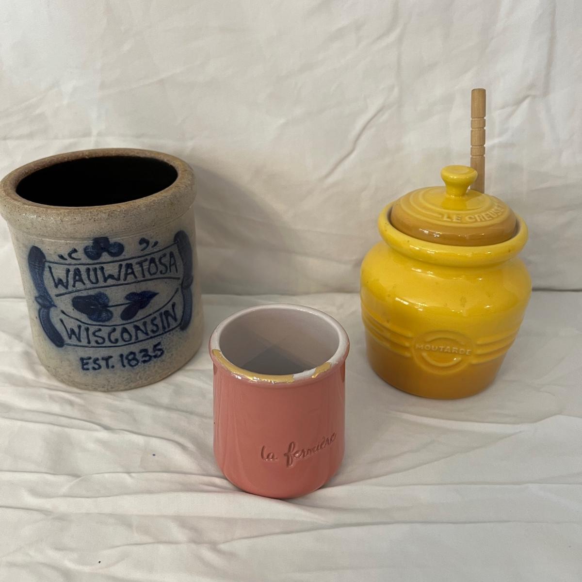 Three ceramic kitchen storage containers. The Le Creuset honey pot is approximately 5"H x 4"D. Wauwatosa Wisconsin container is 4.75"H x 4.25"D and the La Fermiere cup is 3"H x 2.5"D.
