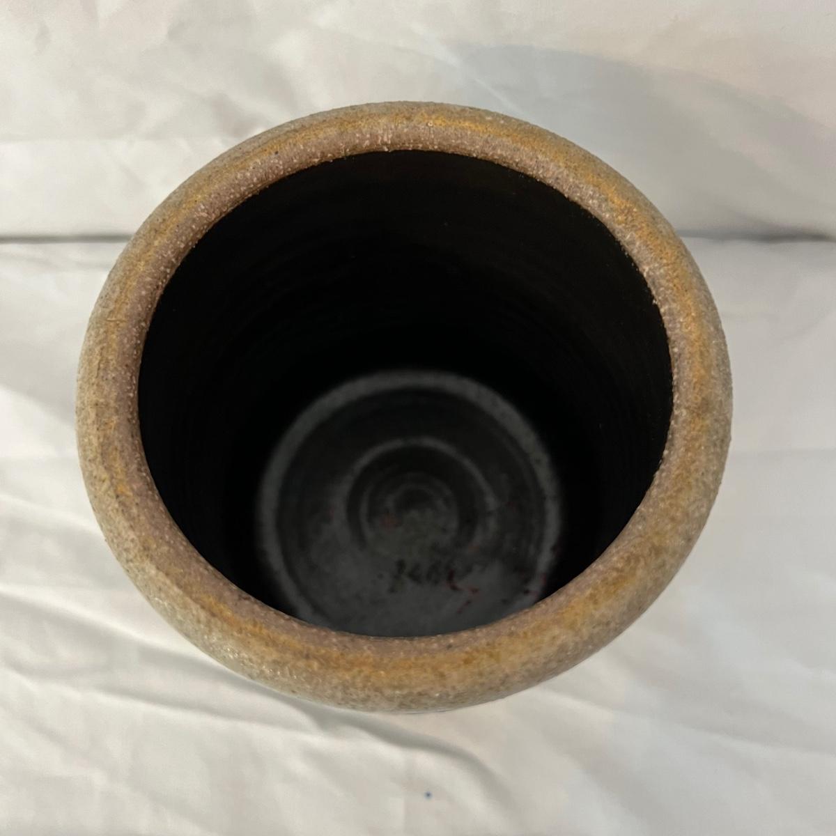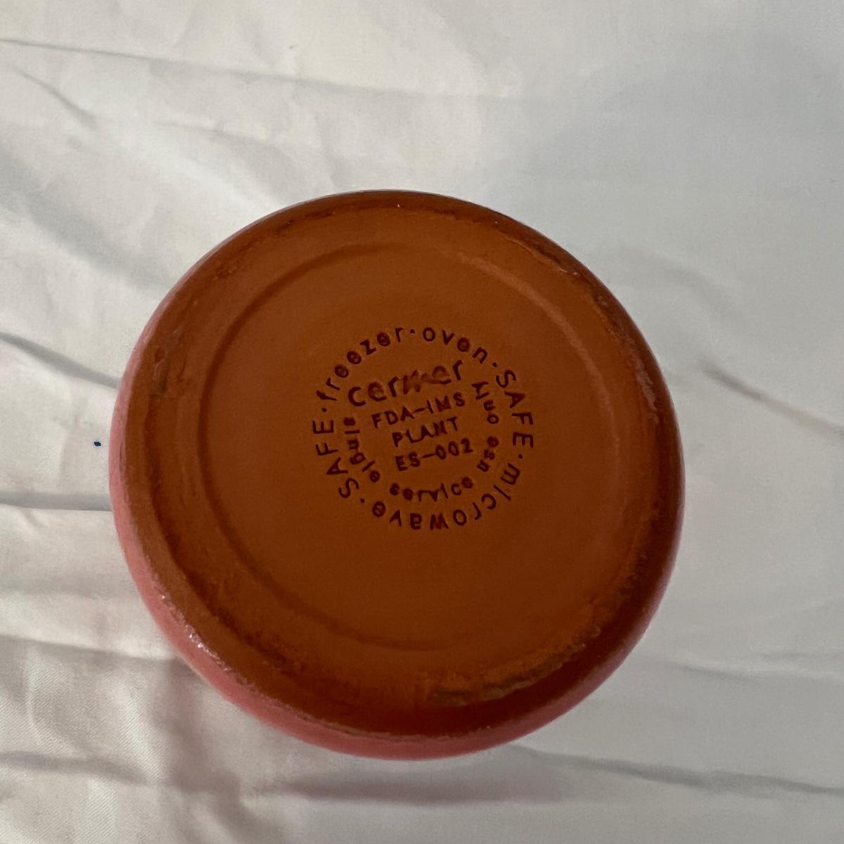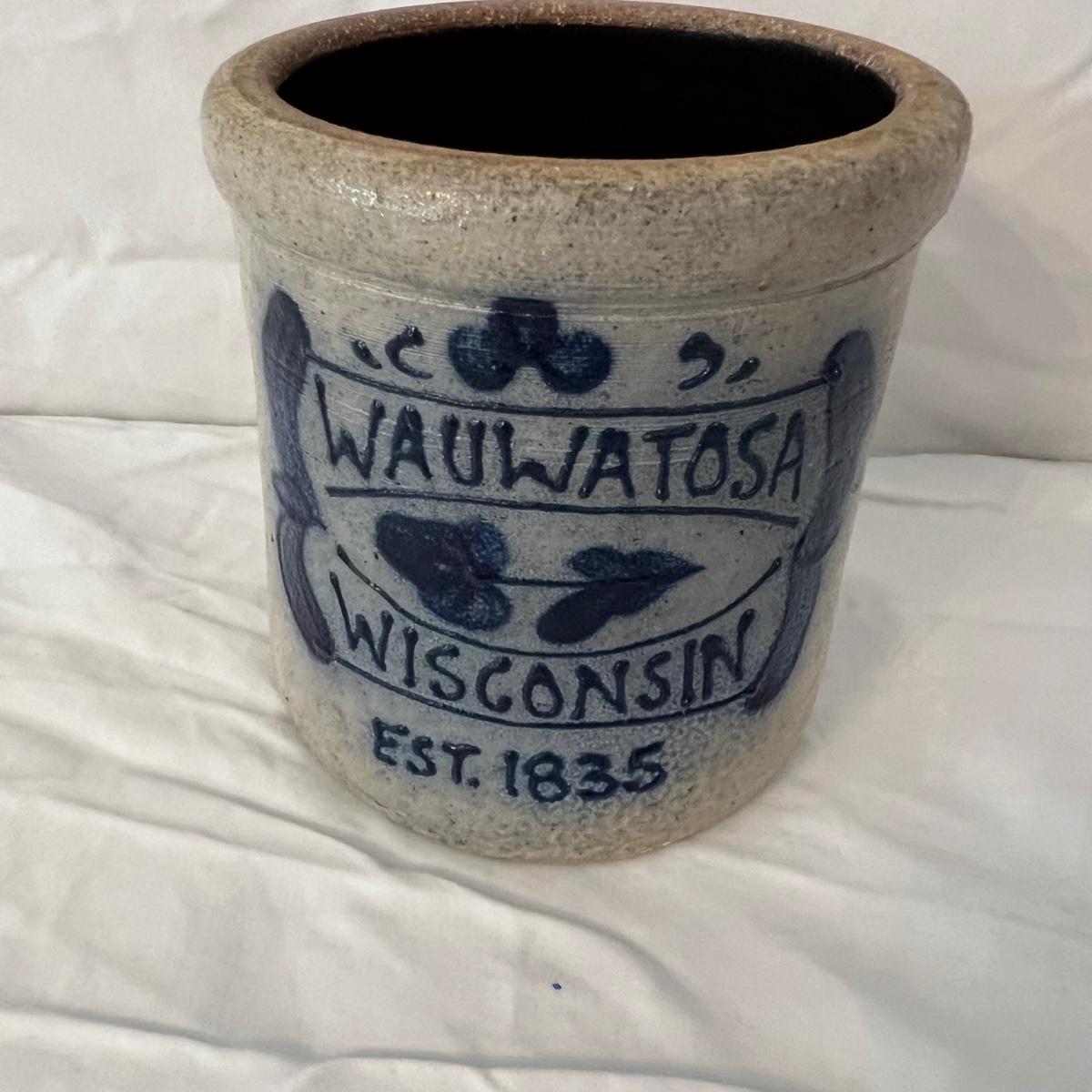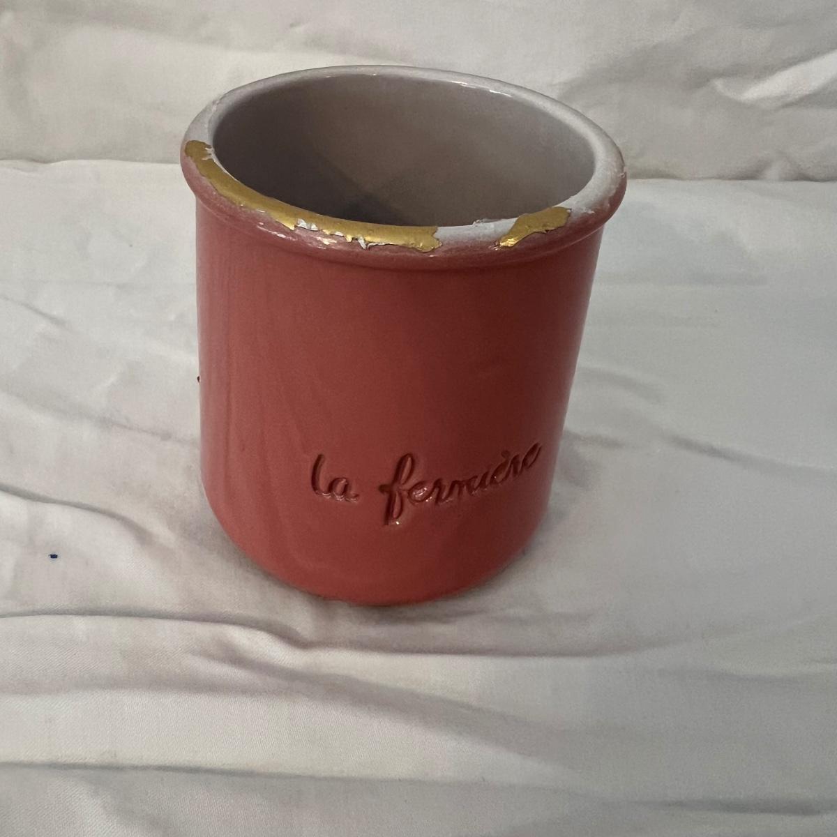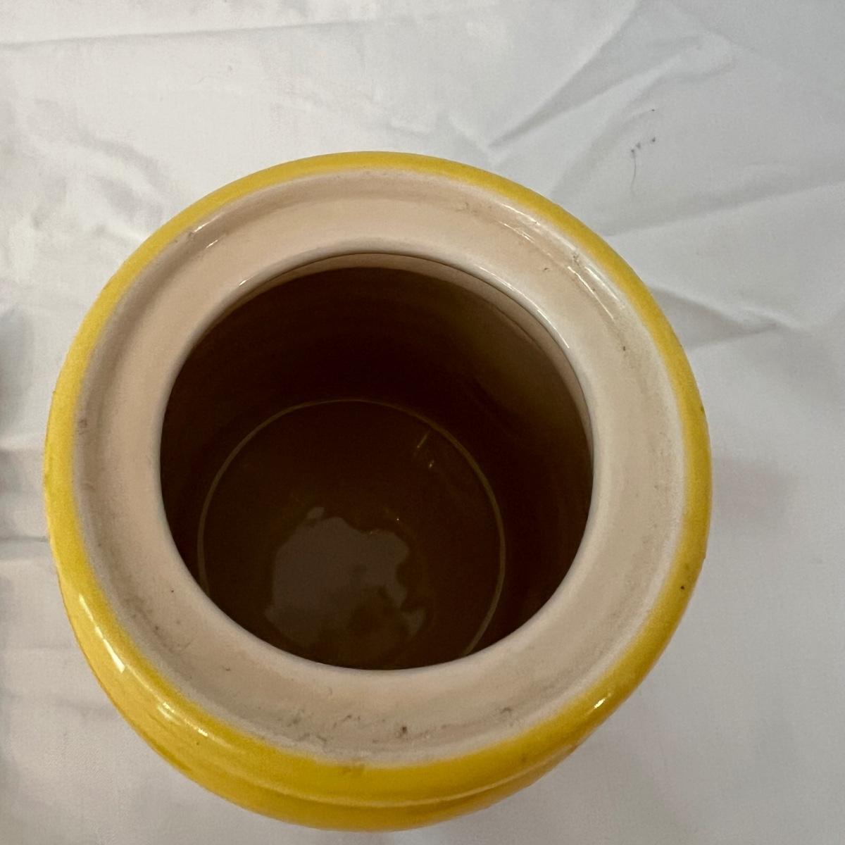 Three ceramic kitchen storage containers. The Le Creuset honey pot is approximately 5"H x 4"D. Wauwatosa Wisconsin container is 4.75"H x 4.25"D and the La Fermiere cup is 3"H x 2.5"D.