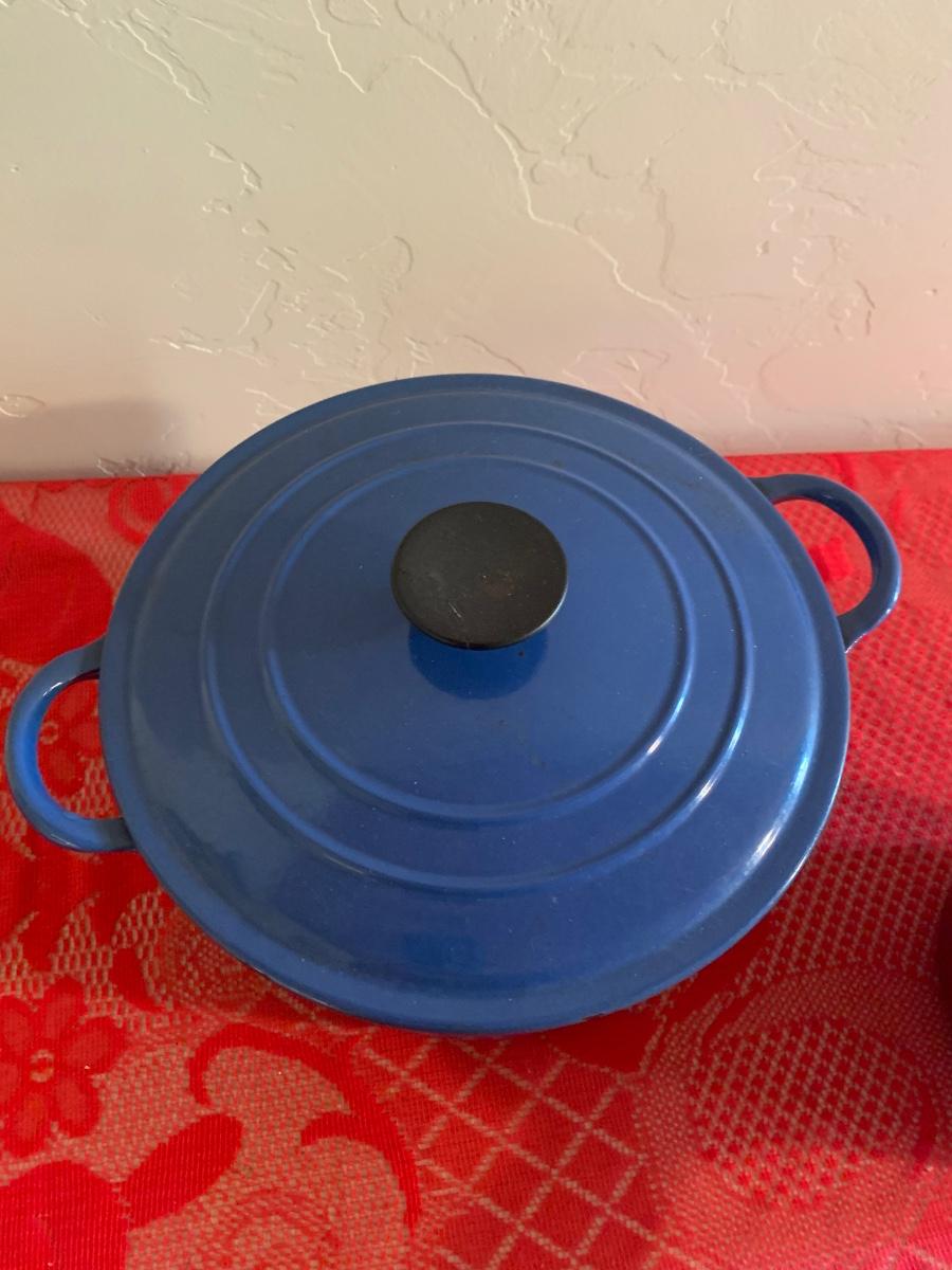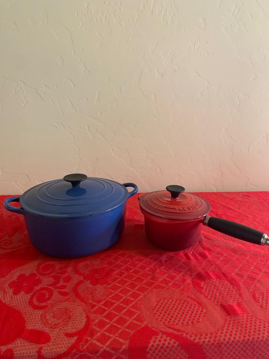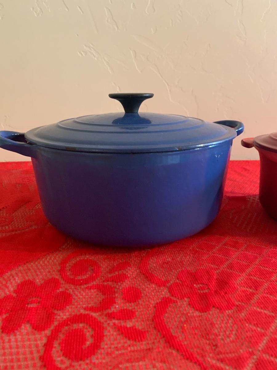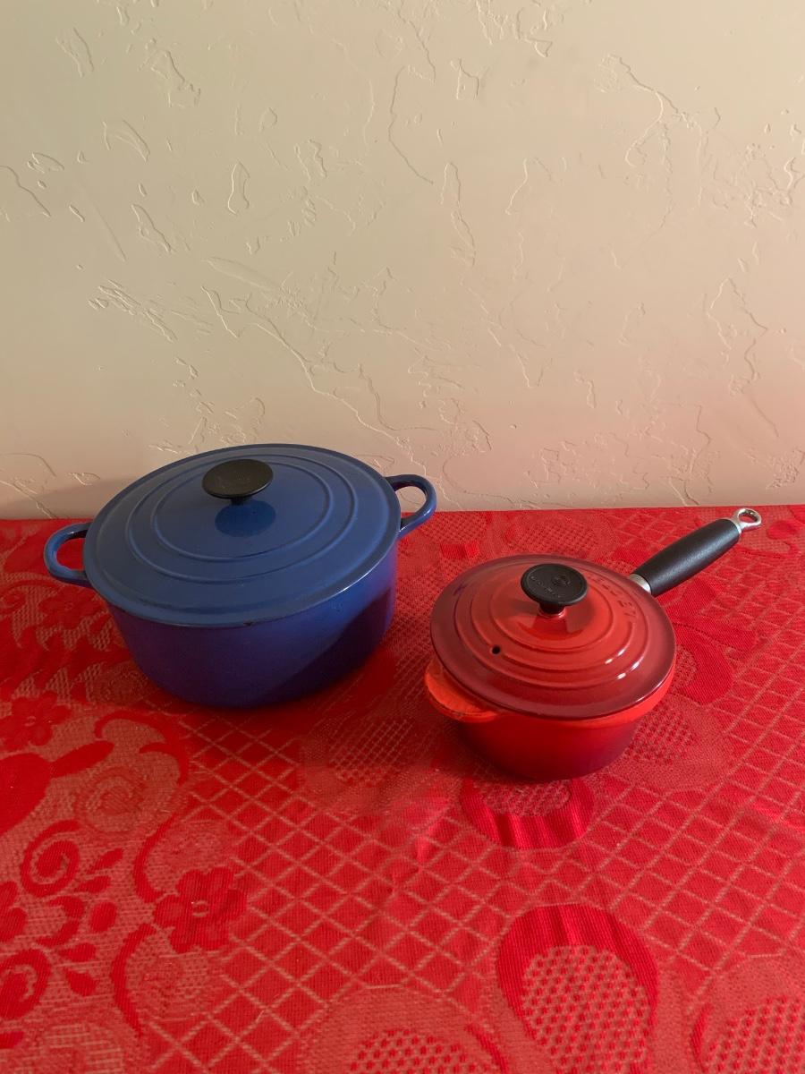 Lot includes two Le Ceuset pots. Blue dutch oven is very well seasoned measures 9.5” dial, 4.5” tall. Red saucepan is used but great condition has lid and handle.