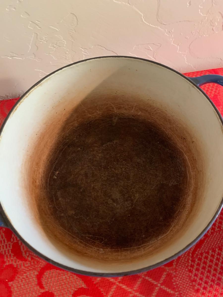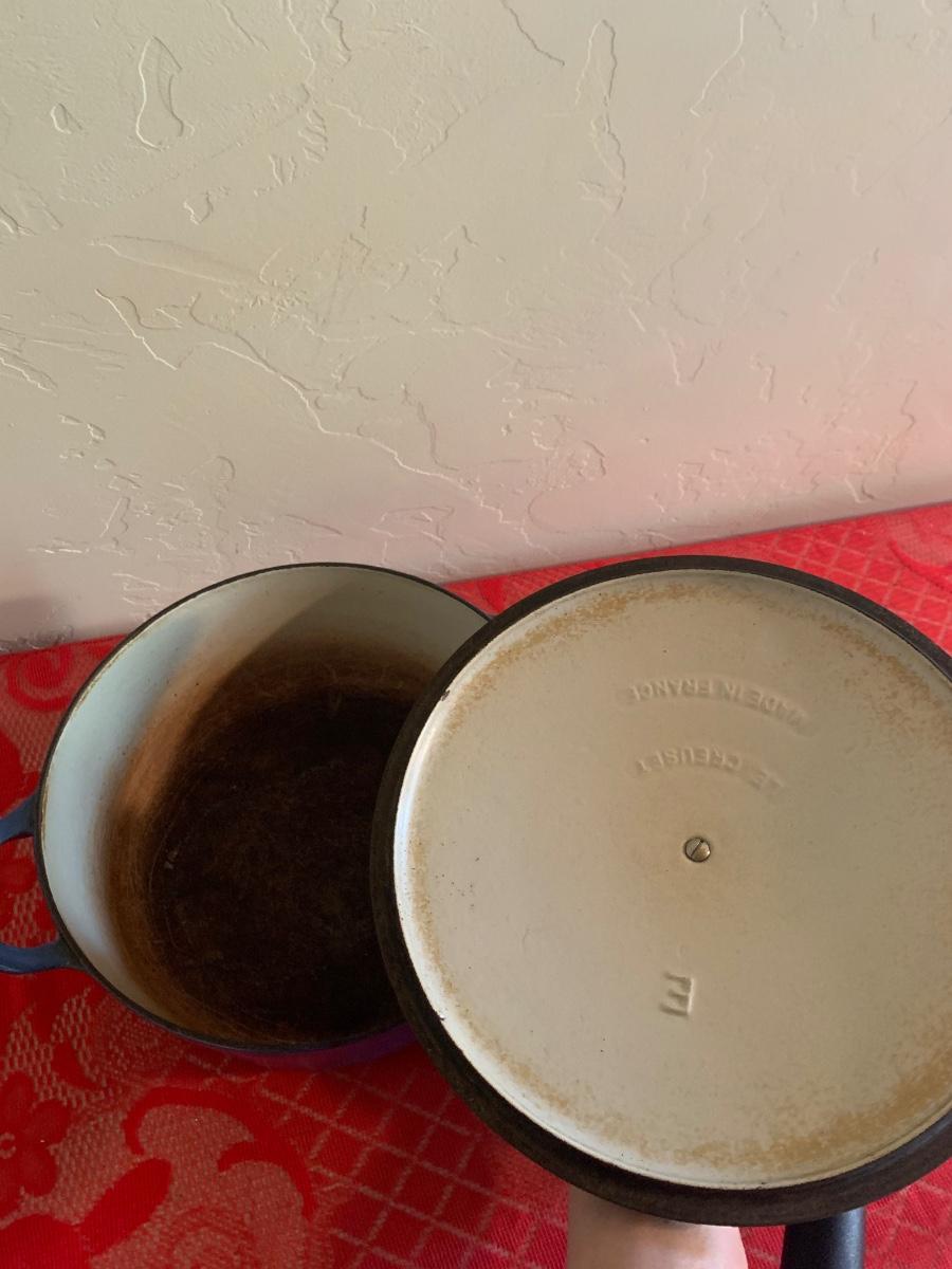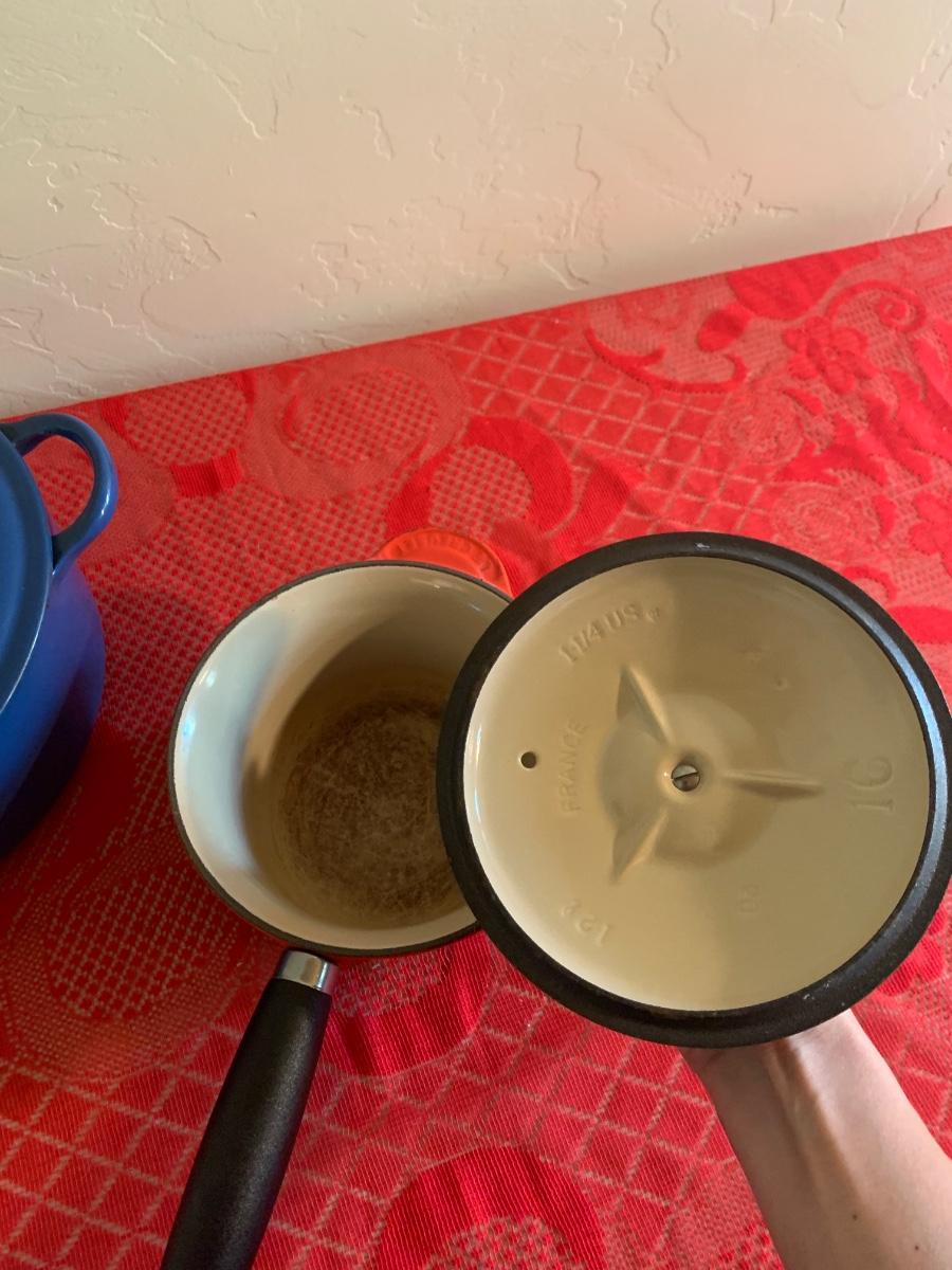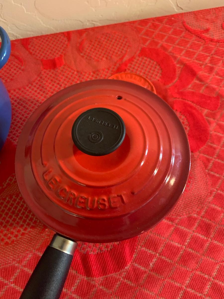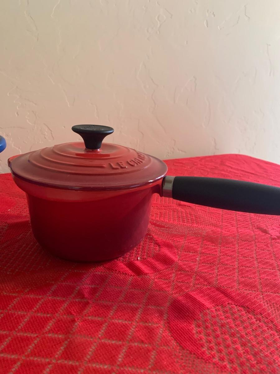 Lot includes two Le Ceuset pots. Blue dutch oven is very well seasoned measures 9.5” dial, 4.5” tall. Red saucepan is used but great condition has lid and handle.