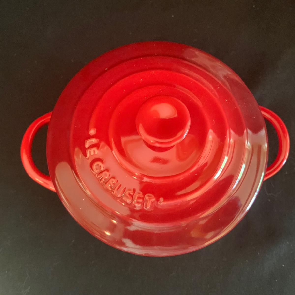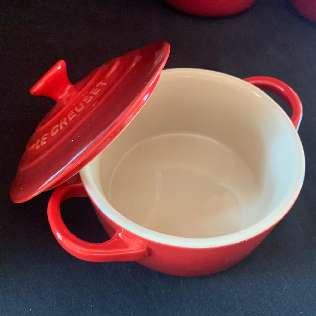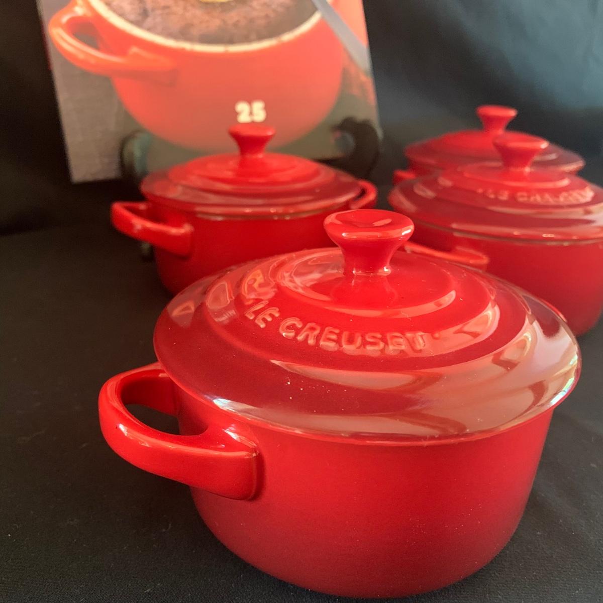 Four piece Le Creuset Mini-Cocotte set, Arcoflam France Cookware and More! This lot includes Le Creuset Mini-Cocotte set with book, four Cusinart ramekins, six unbranded soufflé dishes, four white square ramekins, six red ramekins, and one Arcoflam France cookware with glass top. Arcoflam cookware is missing the handle. Please see photos for more details. Mini Le Creuset dishes measure, 4”D x 2”H and Arcoflam dish measures approximately, 10.25”D x 6”H. Shipping available.