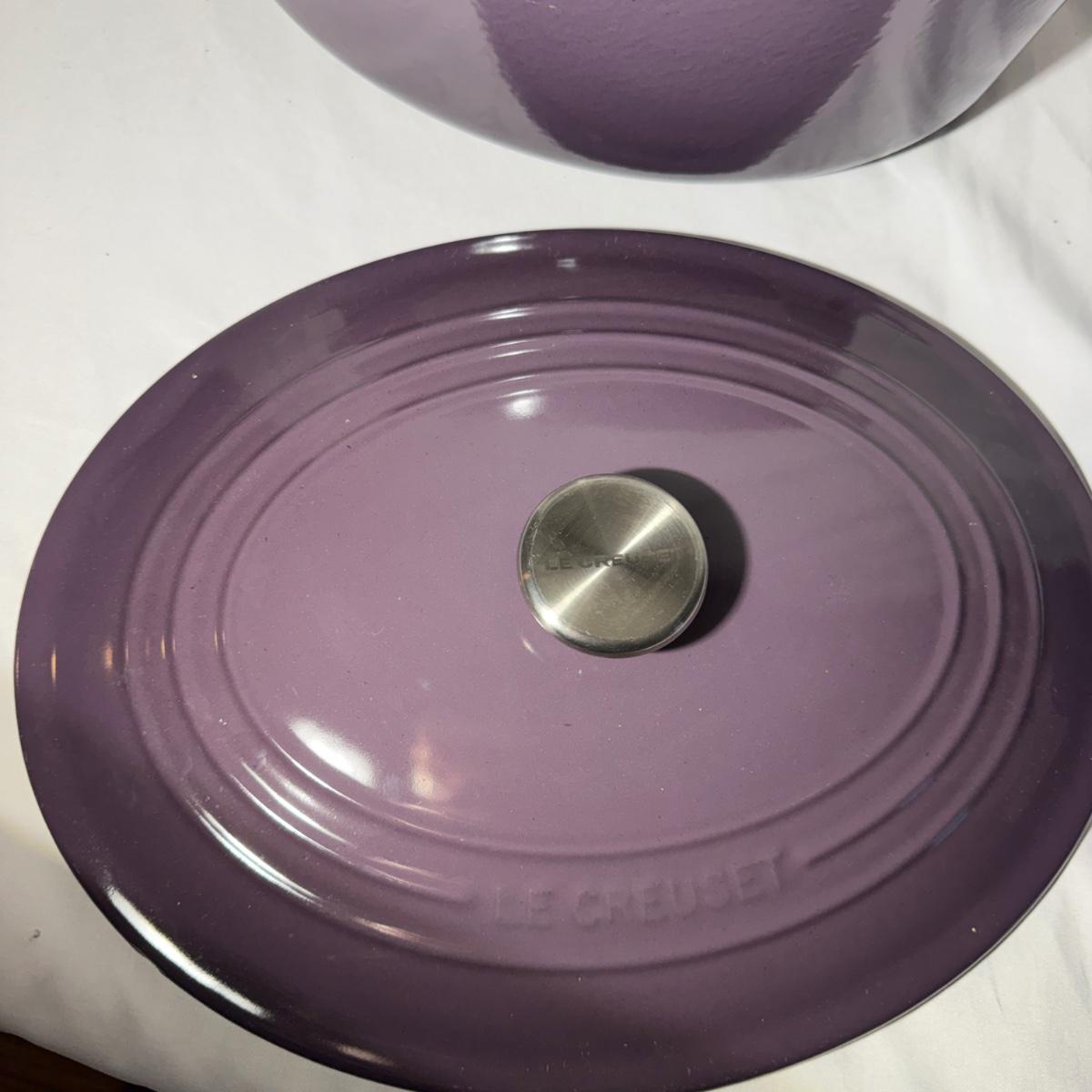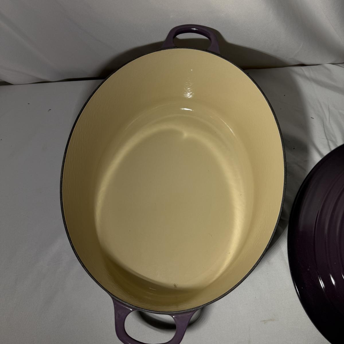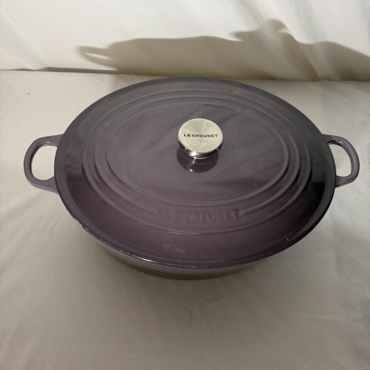 Lot includes a Le Creuset enameled cast iron oval Dutch oven that appears to be in their retired 'Cassis' color. Oven measures 17” x 12” x 8”H. Top has a few chips, see pictures.