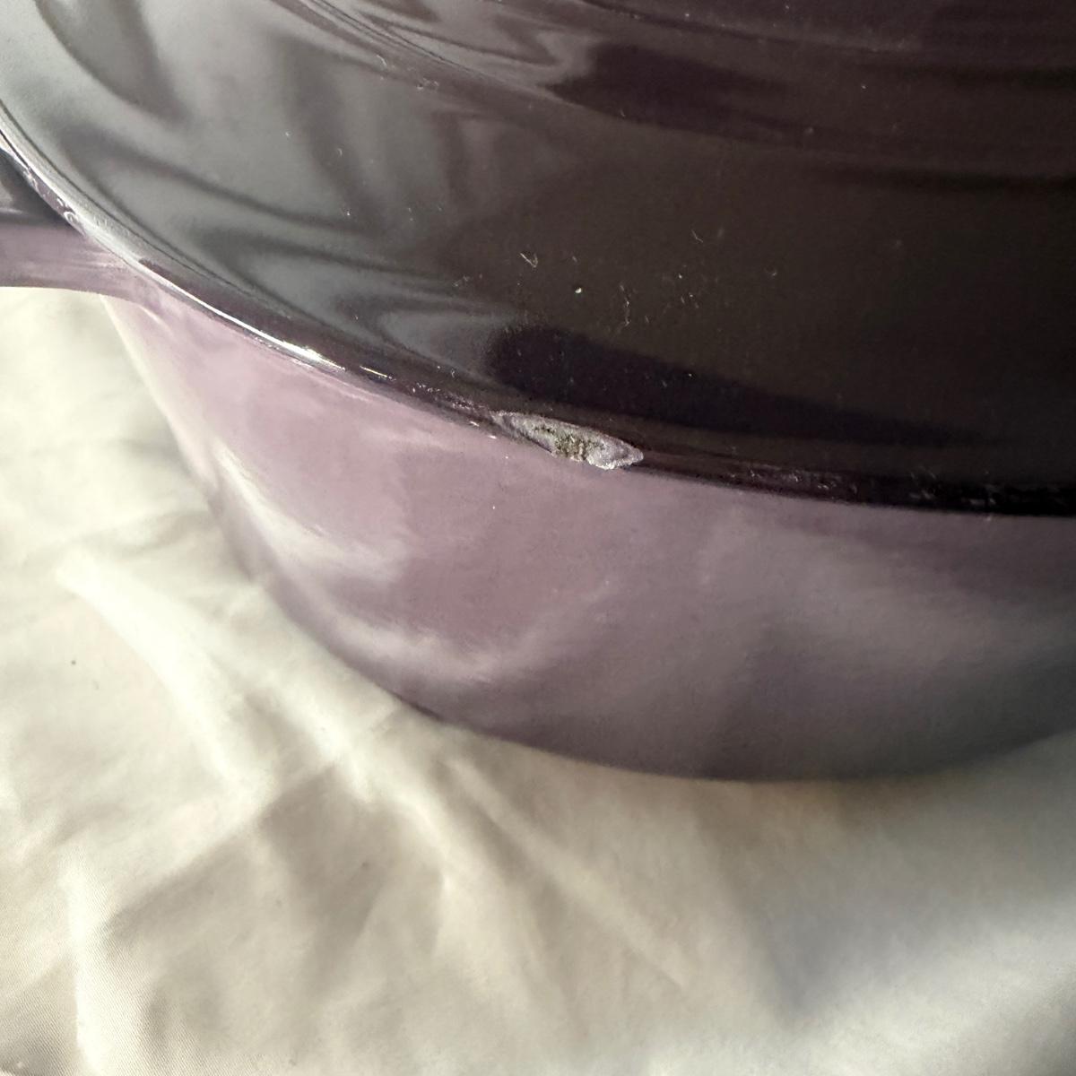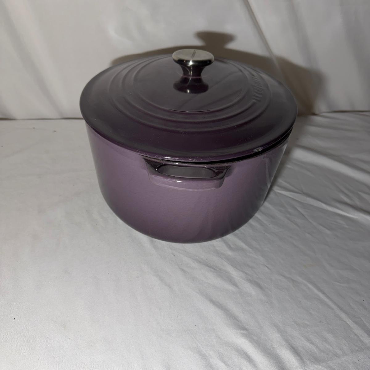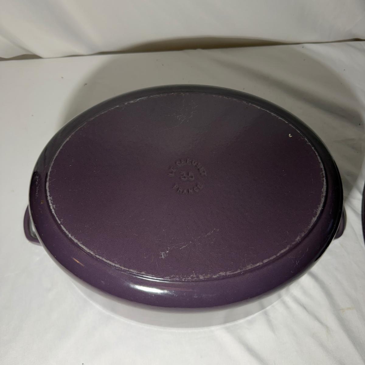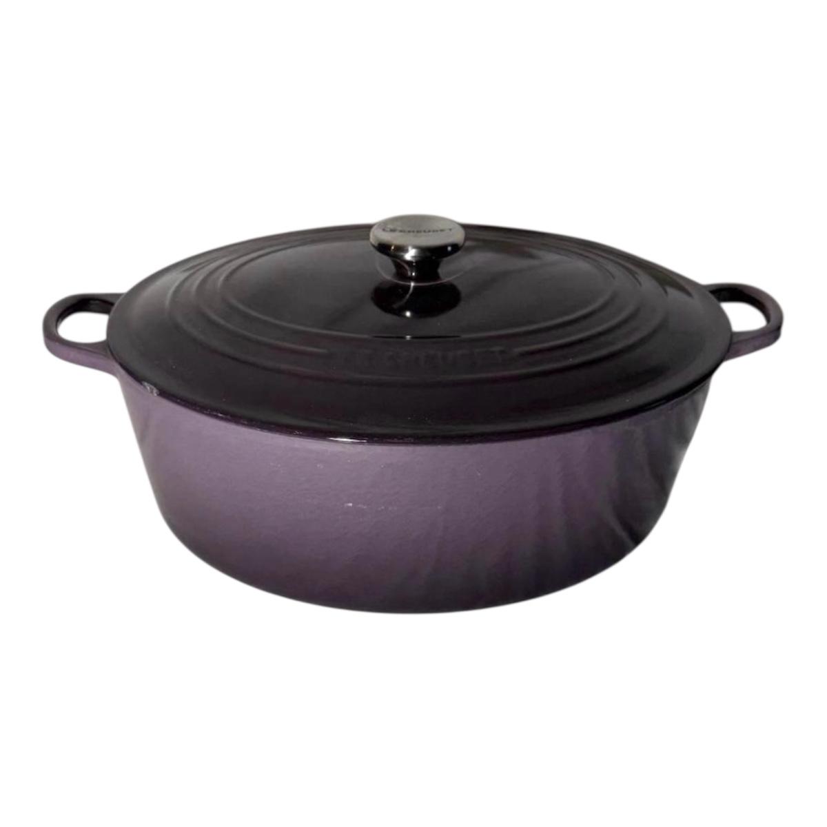 Lot includes a Le Creuset enameled cast iron oval Dutch oven that appears to be in their retired 'Cassis' color. Oven measures 17” x 12” x 8”H. Top has a few chips, see pictures.