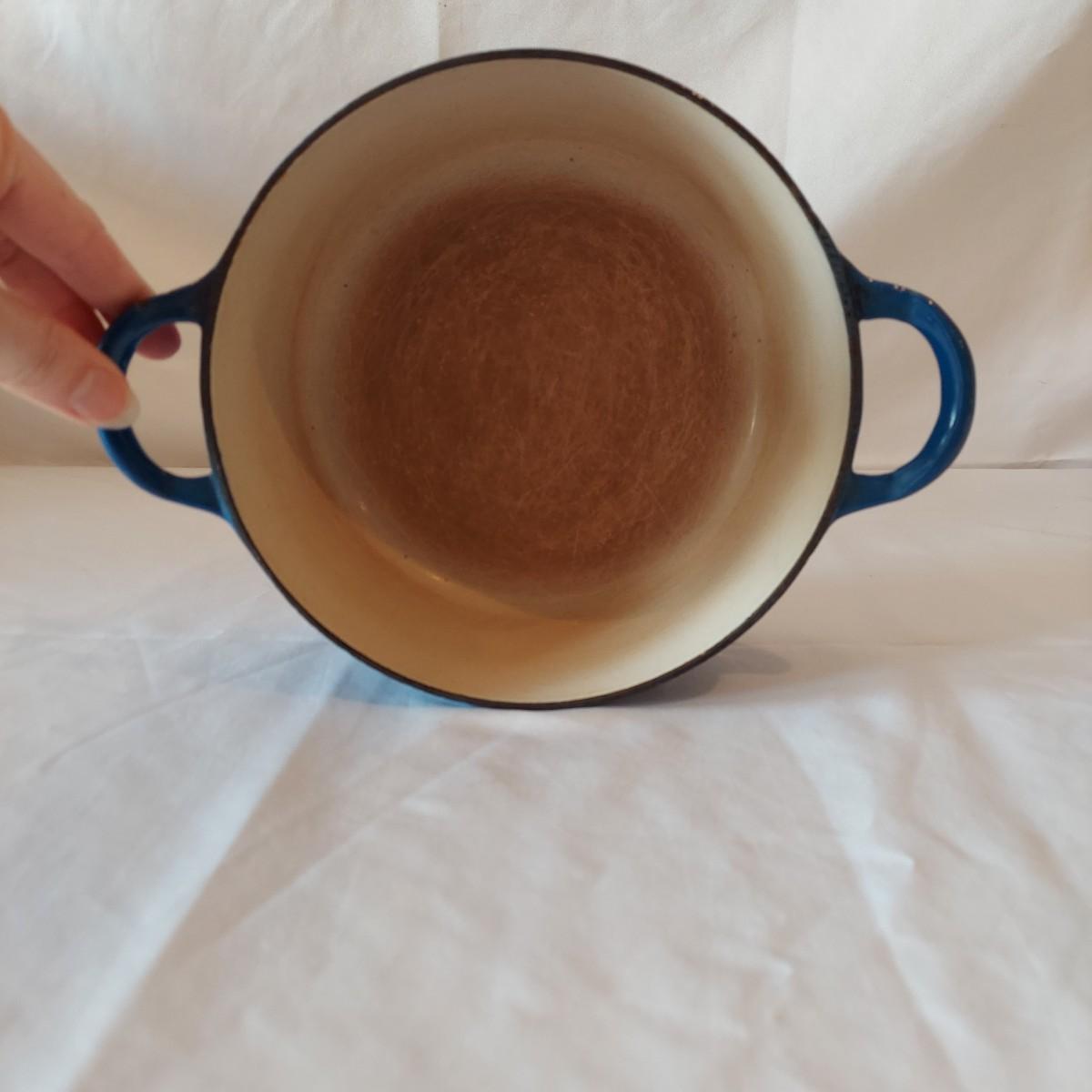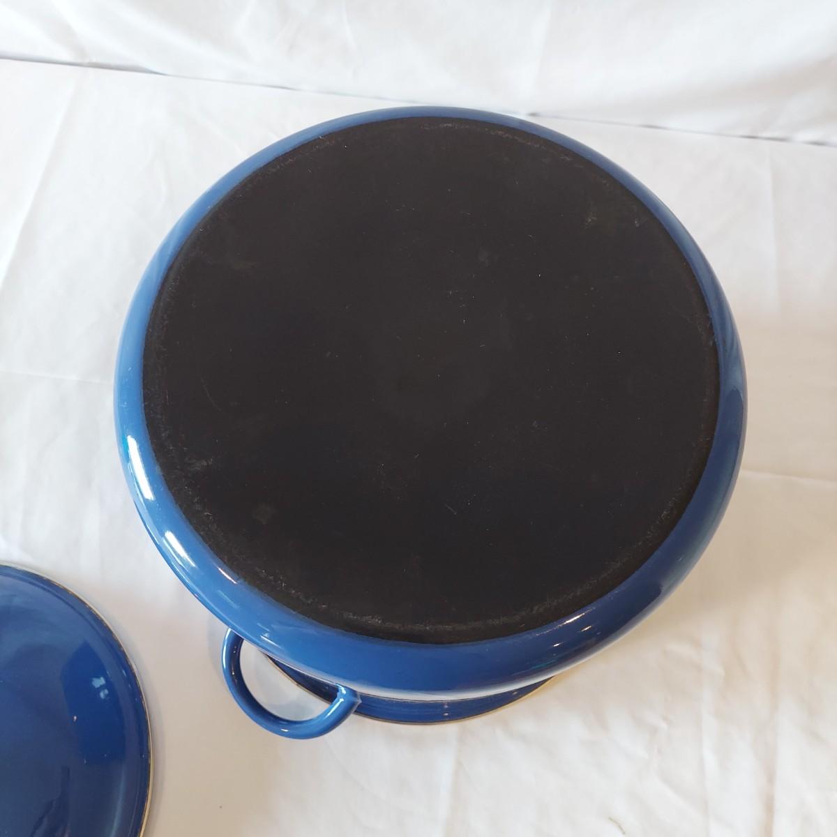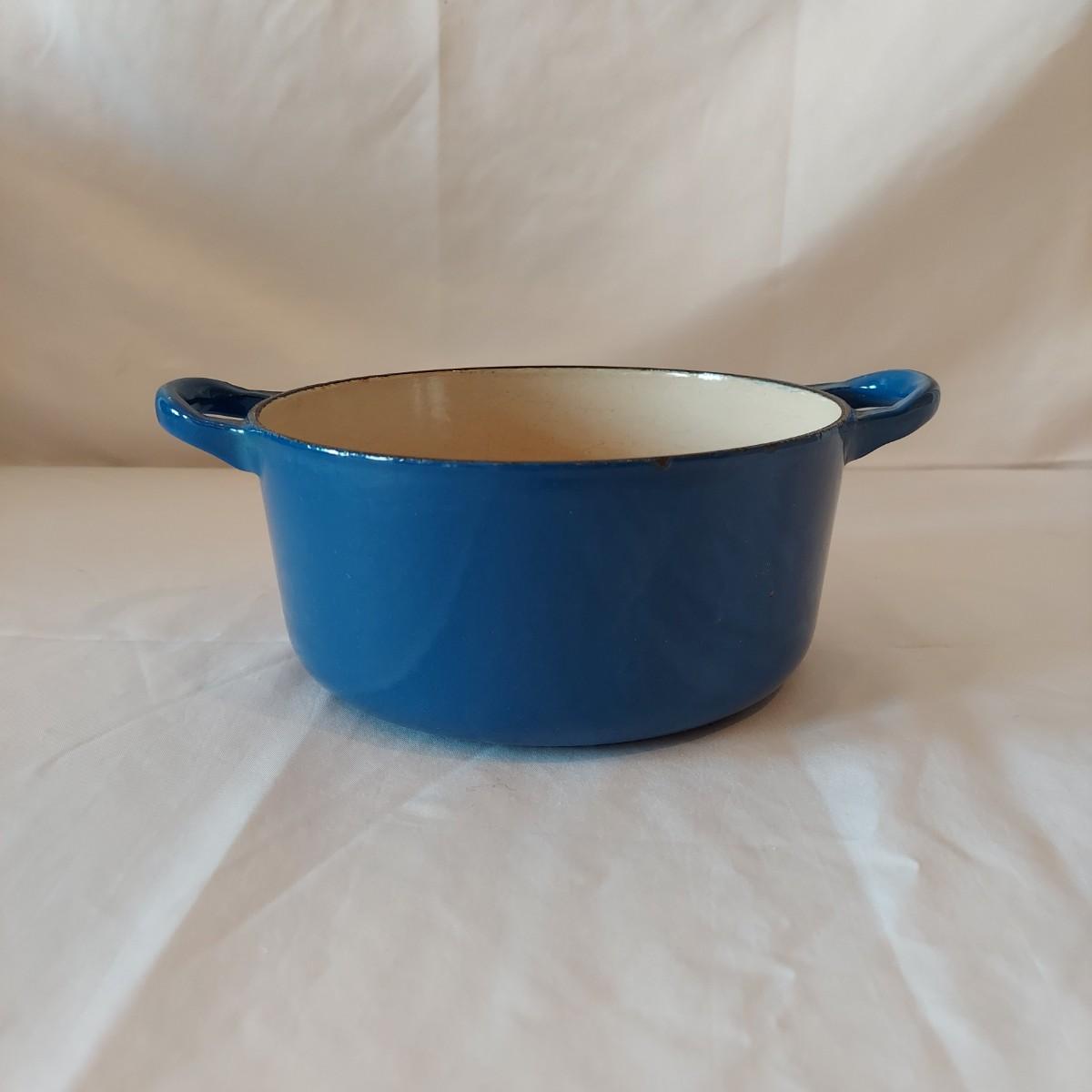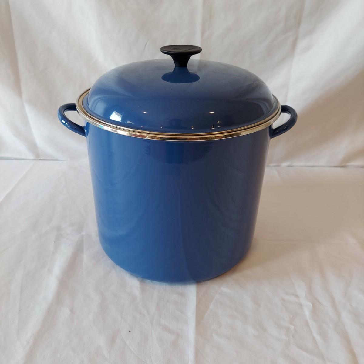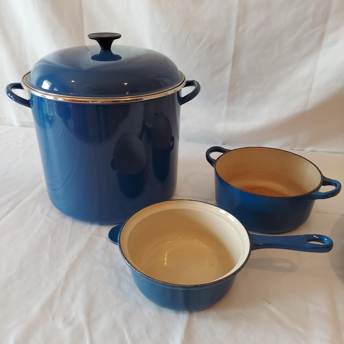 Four blue pieces of cookware. The large stockpot and oval dish are marked Le Creuset. The Stockpot is their traditional enamel coated metal and measures approximately 11"H with and 11"D. The oval dish is enamel coated ceramic. The two small pots appear to be Le Creuset enamel coated cast iron and have some scratches and staining. Shipping available