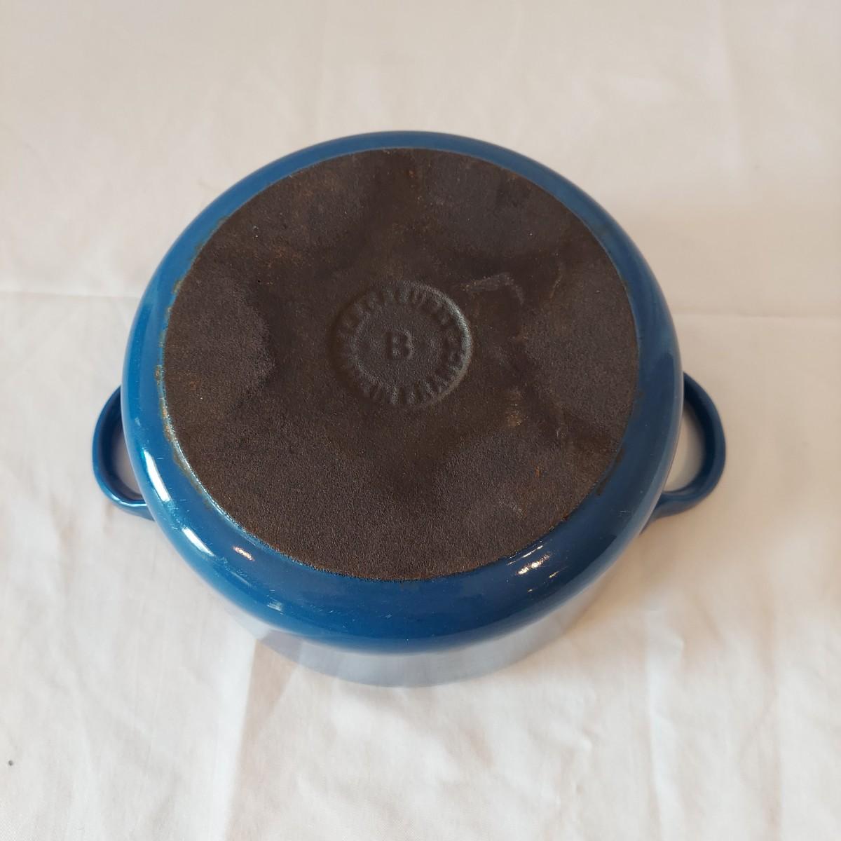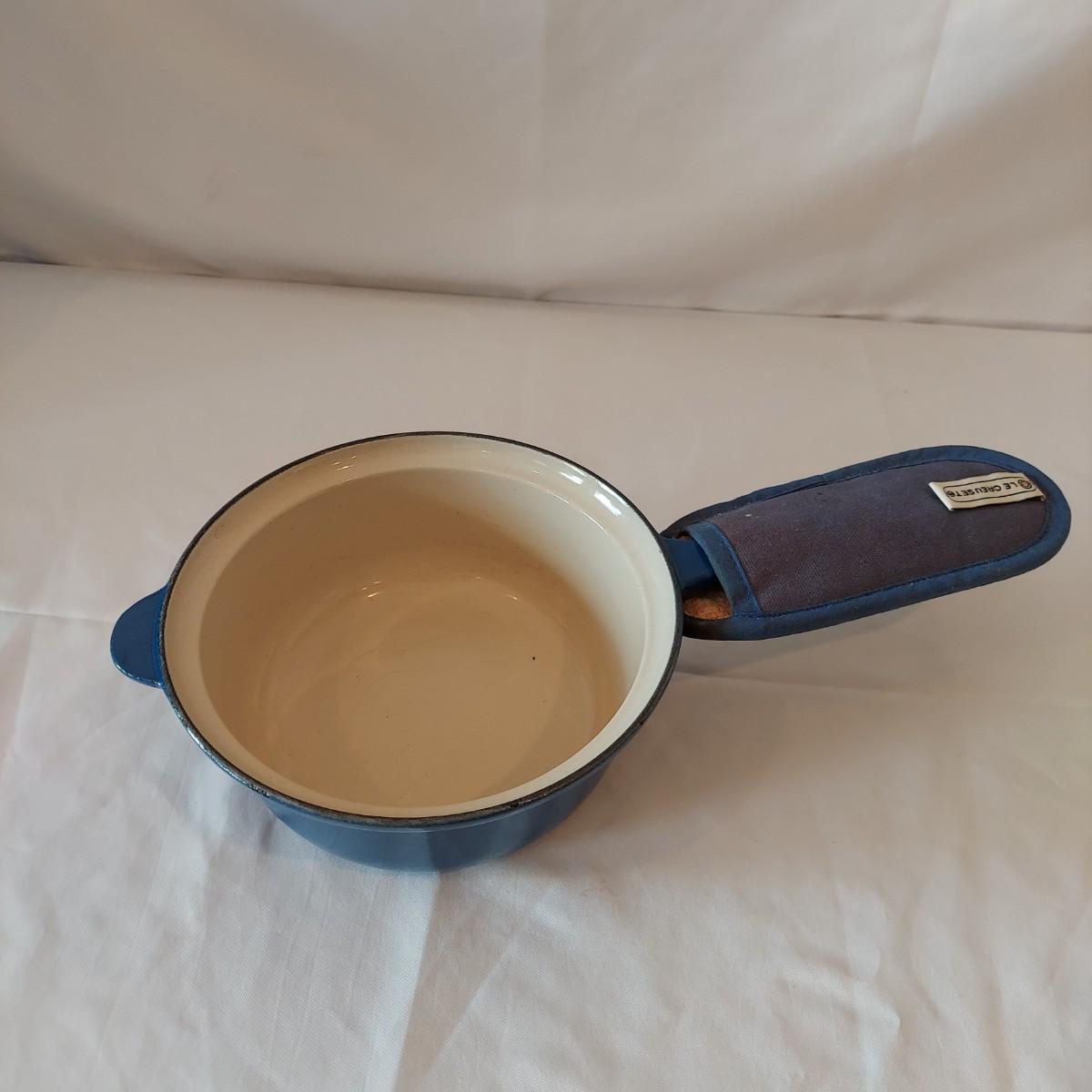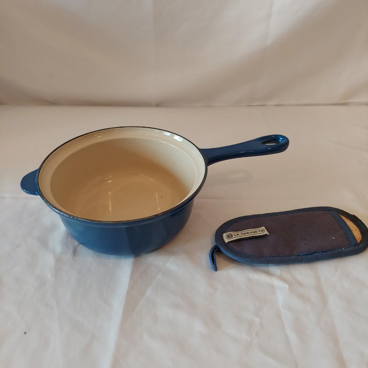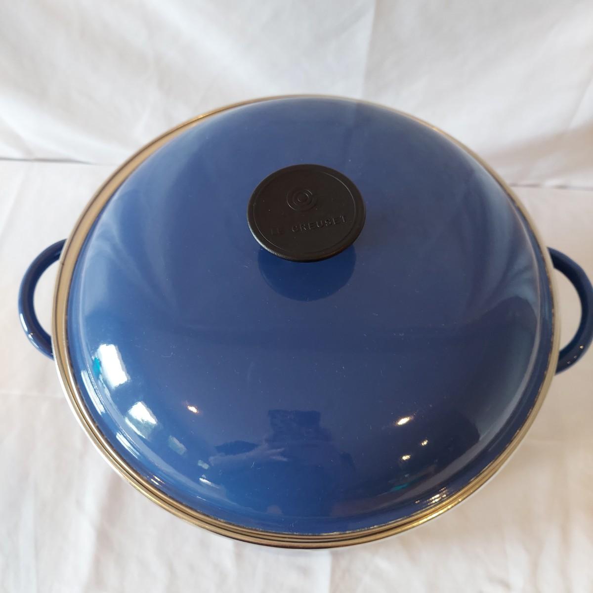 Four blue pieces of cookware. The large stockpot and oval dish are marked Le Creuset. The Stockpot is their traditional enamel coated metal and measures approximately 11"H with and 11"D. The oval dish is enamel coated ceramic. The two small pots appear to be Le Creuset enamel coated cast iron and have some scratches and staining. Shipping available