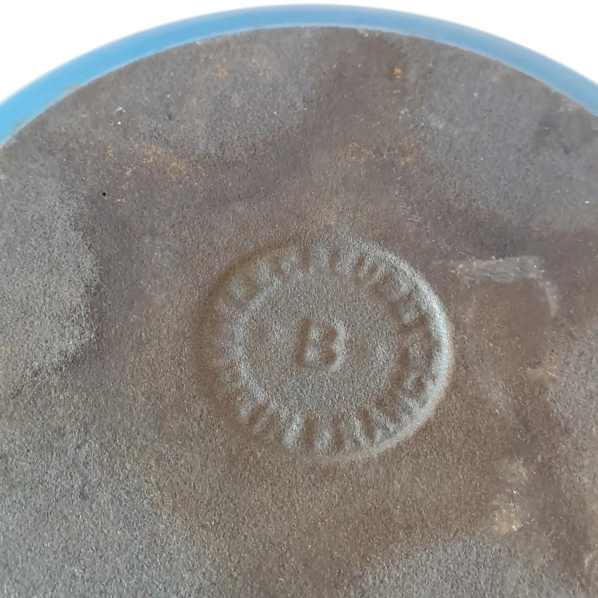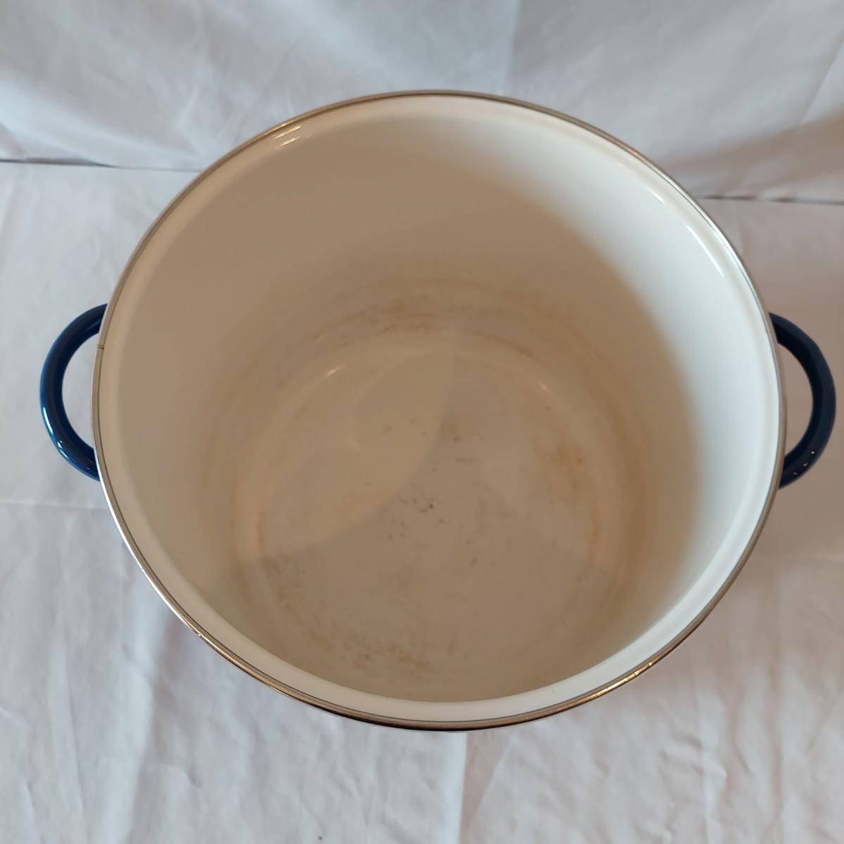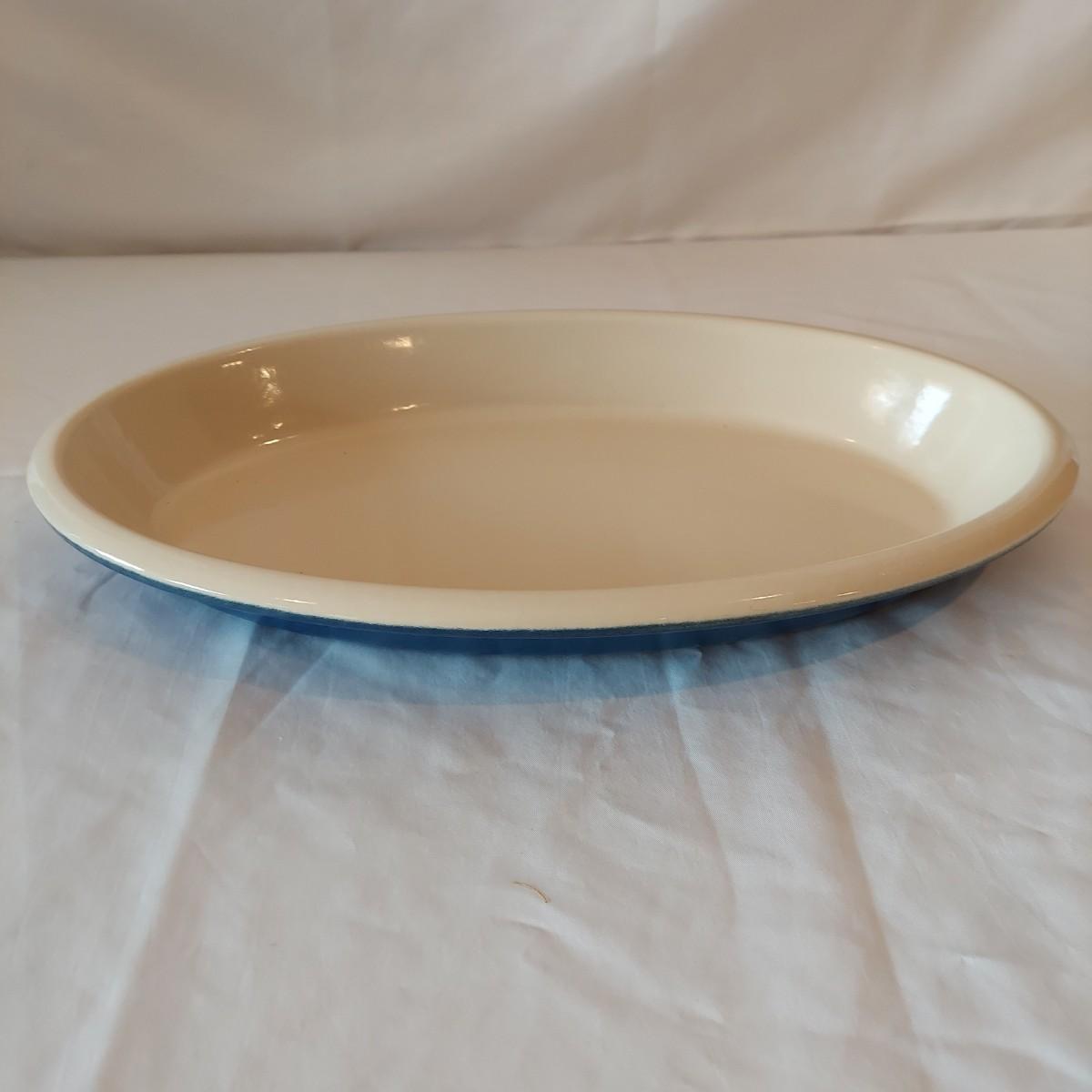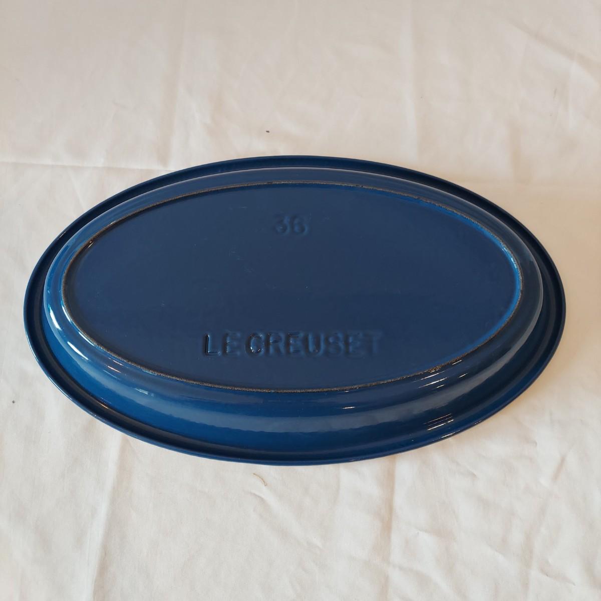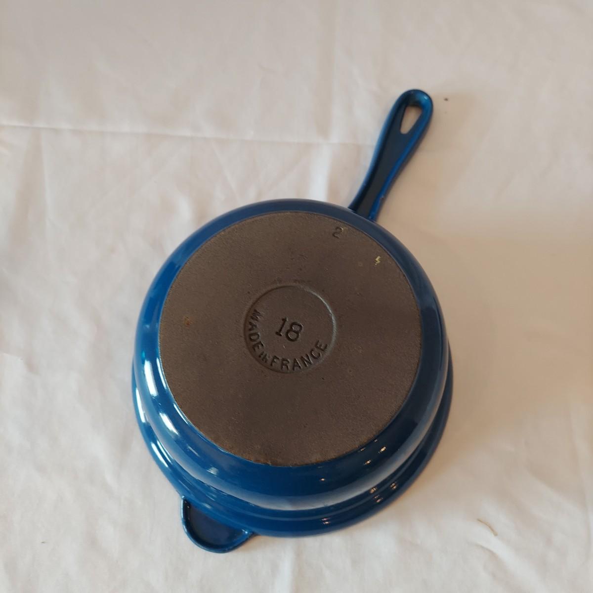 Four blue pieces of cookware. The large stockpot and oval dish are marked Le Creuset. The Stockpot is their traditional enamel coated metal and measures approximately 11"H with and 11"D. The oval dish is enamel coated ceramic. The two small pots appear to be Le Creuset enamel coated cast iron and have some scratches and staining. Shipping available