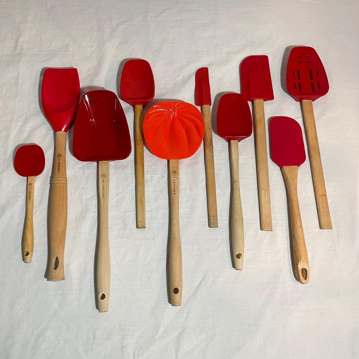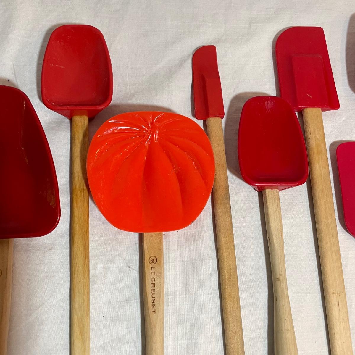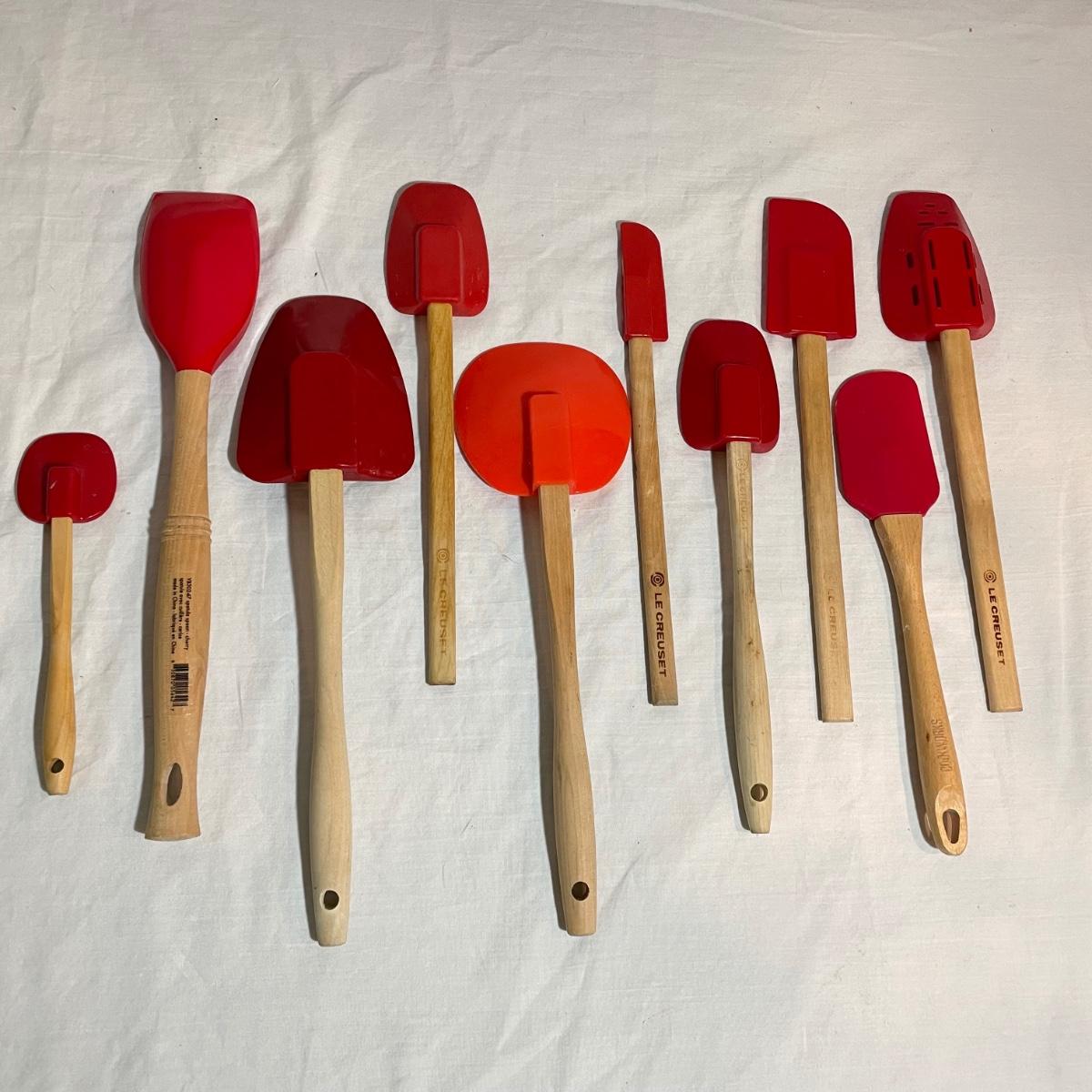 A variety of eight red Le Creuset branded spatulas plus Le Creuset apple and pumpkin themed spatulas - 10 total spatulas. The shortest (apple) spatula is 7”, the longest red spatula is 12.25”. See images. Shipping available.