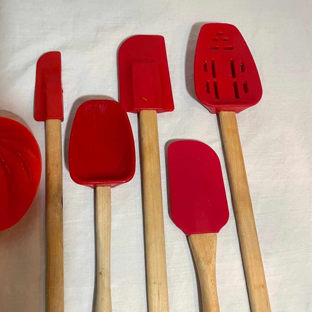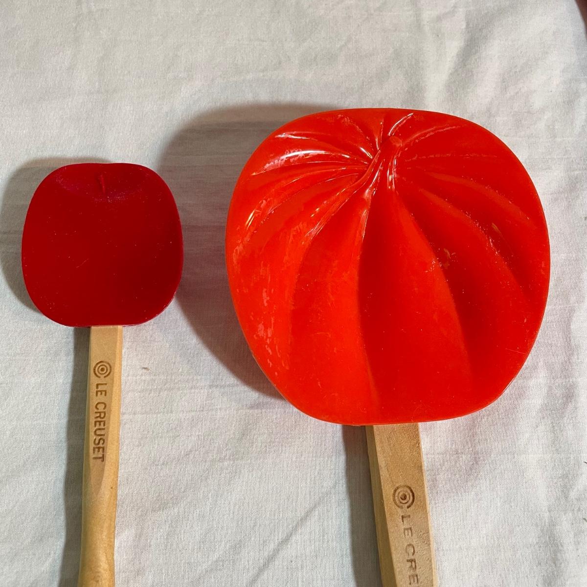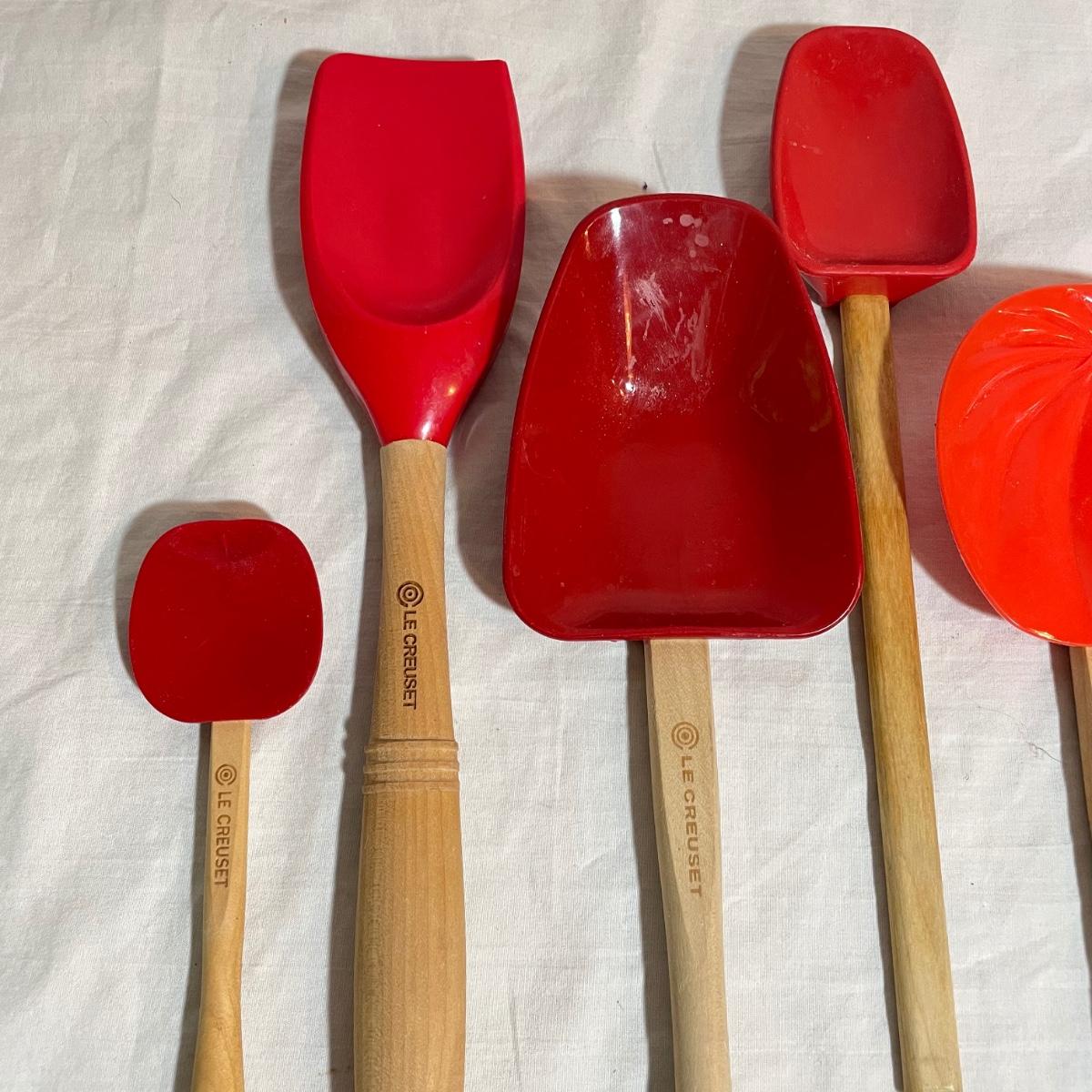 A variety of eight red Le Creuset branded spatulas plus Le Creuset apple and pumpkin themed spatulas - 10 total spatulas. The shortest (apple) spatula is 7”, the longest red spatula is 12.25”. See images. Shipping available.