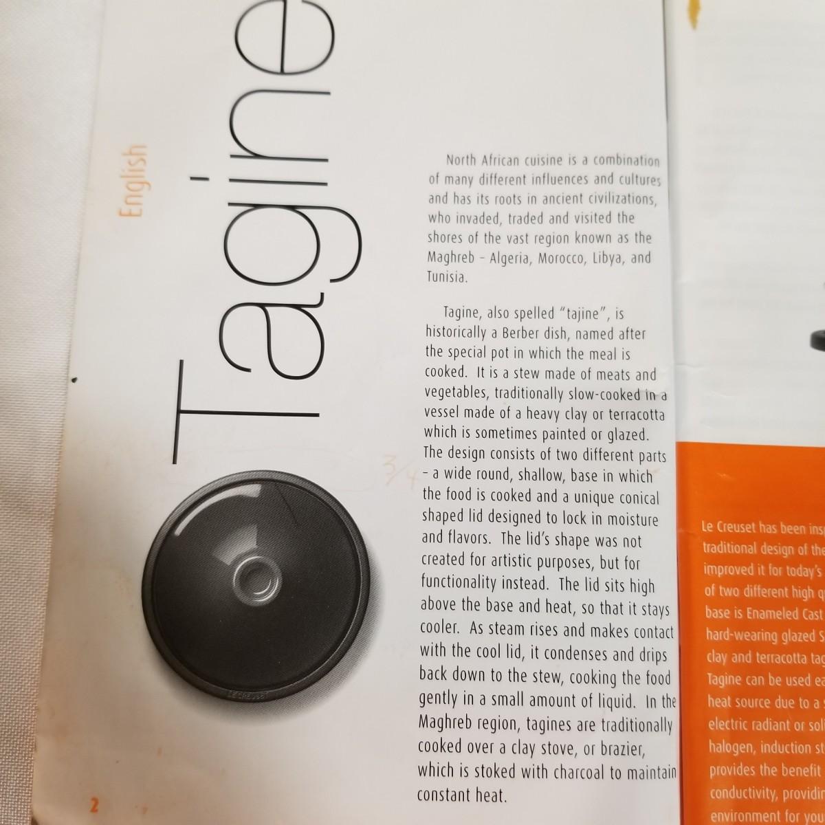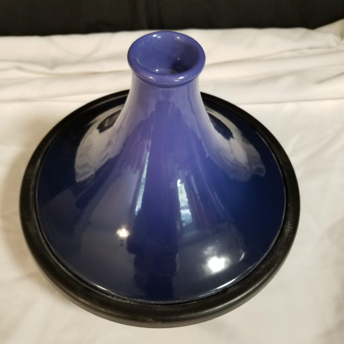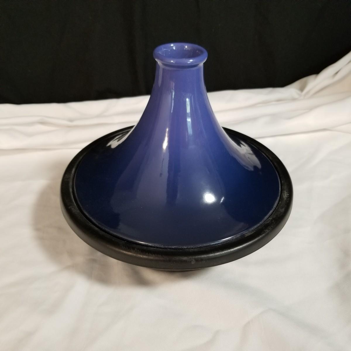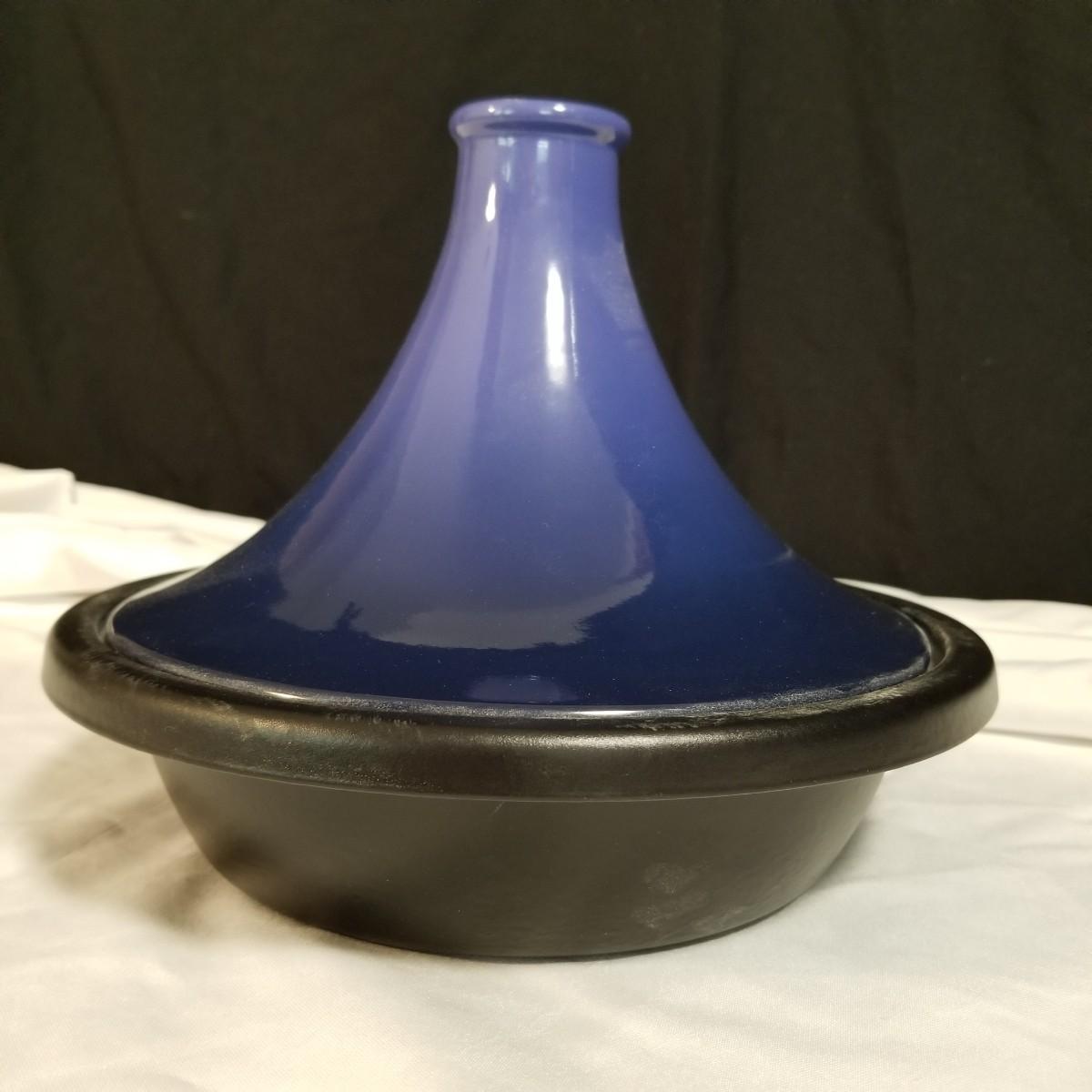 Blue/black LeCreuset cooking vessel for tagine style recipes. Heavy ceramic components, item is 11"x9" and comes with instructions and recipes. See photos for details. Shipping available.